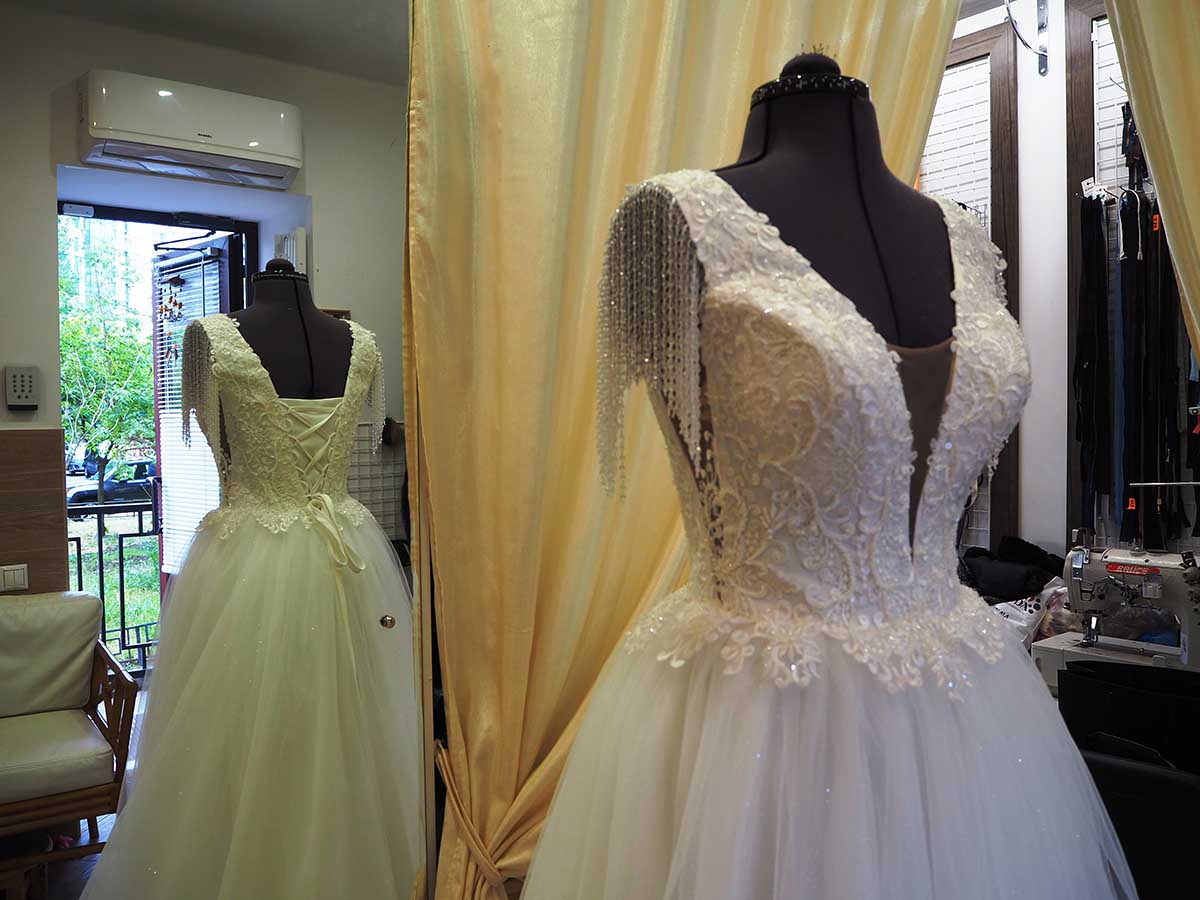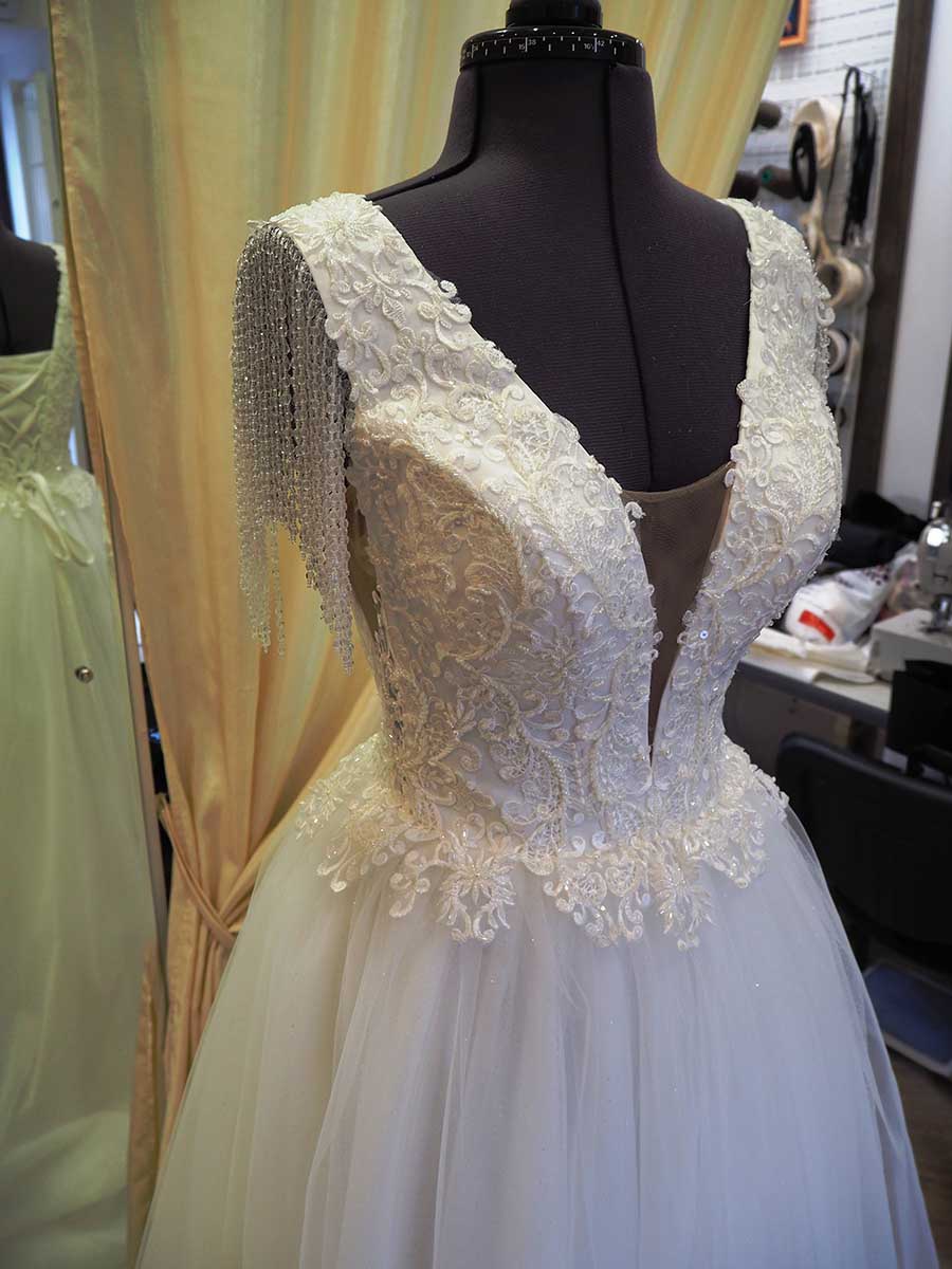 Хозяйка этого платья пришла к нам с основным желанием создать законченный образ своему наряду. Для этого мастер решил добавить объем юбке, что было достигнуто с помощью нескольких слоев фатина. Между ними поставлен слой сетки с глиттером для придания эффекта мерцания. Из той же сетки изготовлена фата. Кроме того платье подогнано по фигуре и скорректирована его длина.