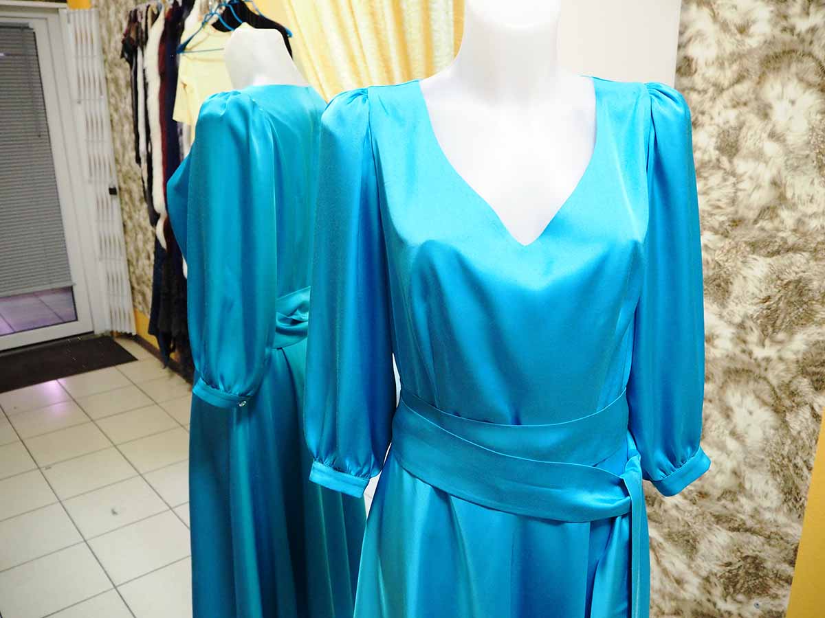 Бирюзовое платье прилегающего силуэта с V-образным вырезом. Рукав фонарик, три четверти, на манжете. Фалды по низу платья достигнуты за счет кроя юбки по косой. Талию подчеркивает декоративный пояс Платье выполнено из 100% вискозы, подклад из тончайшего нежного хлопка