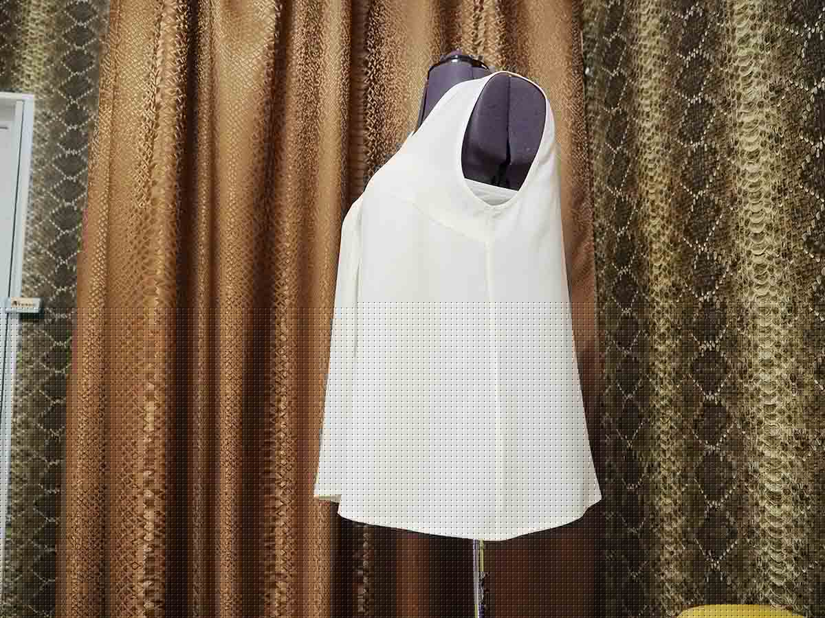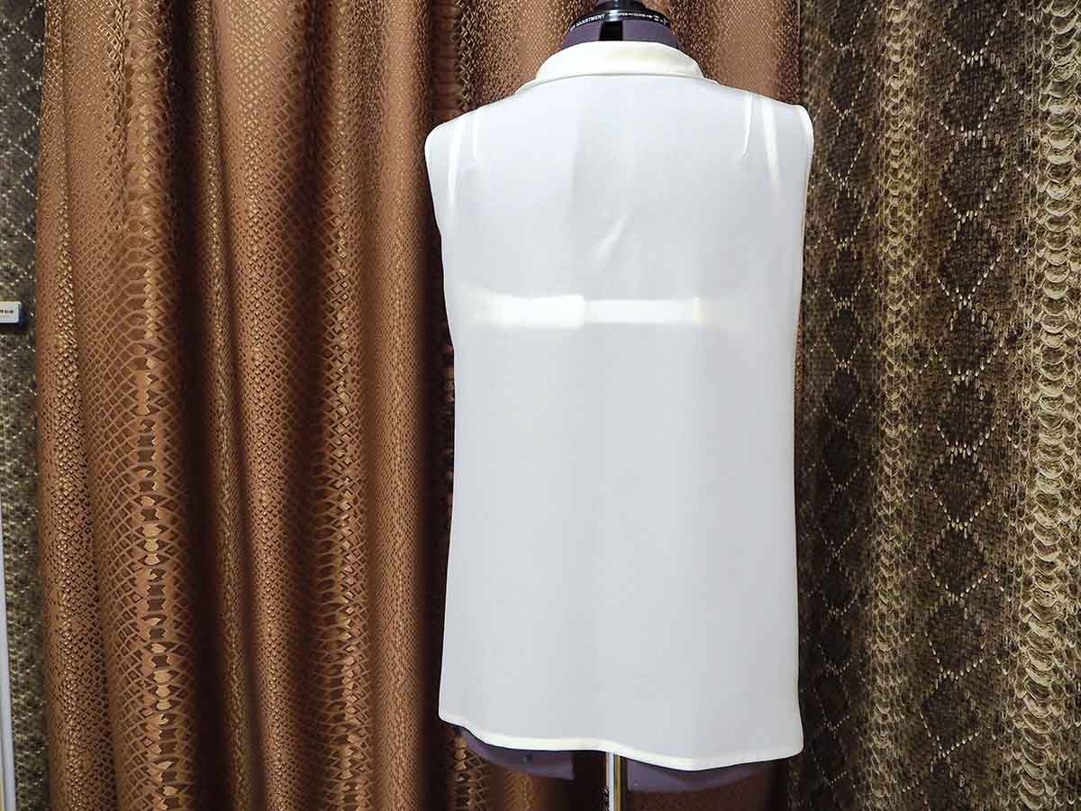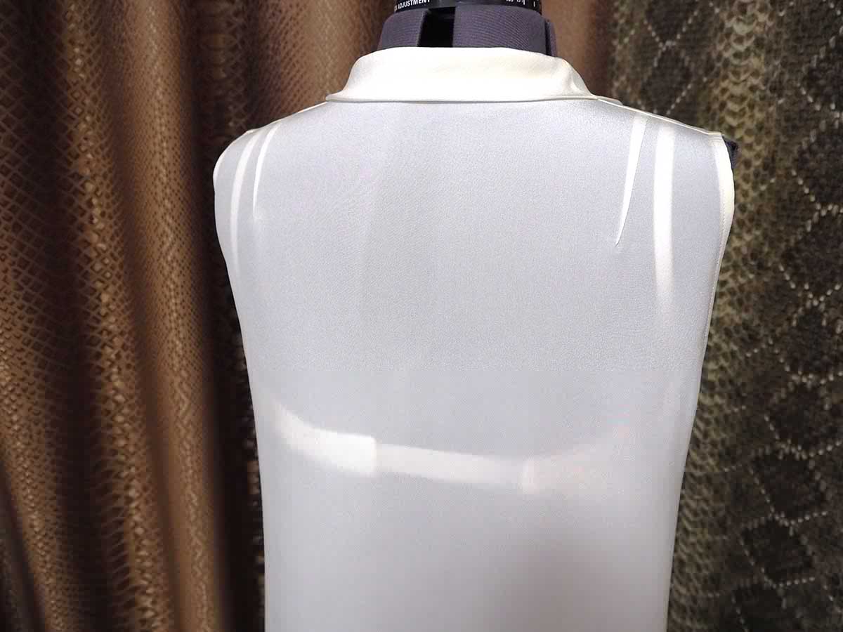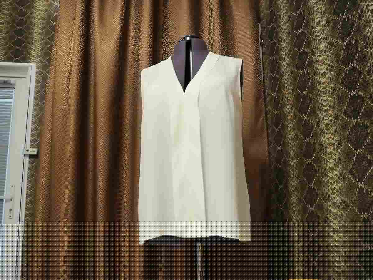 Блуза из белого крепдешина без рукавов, силуэт прямой. По полочке выполнена складка, переходящая в горловину