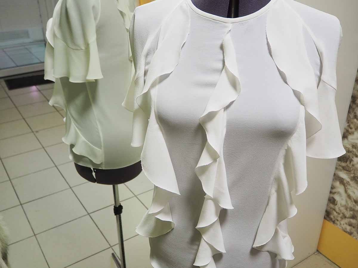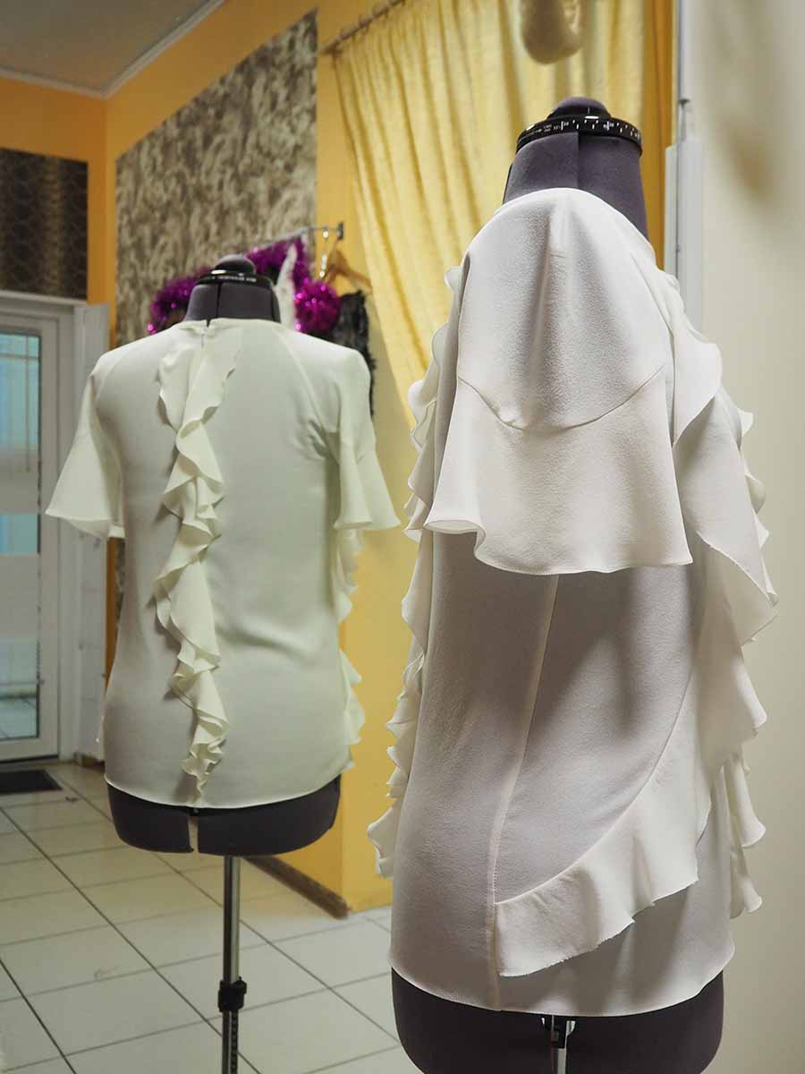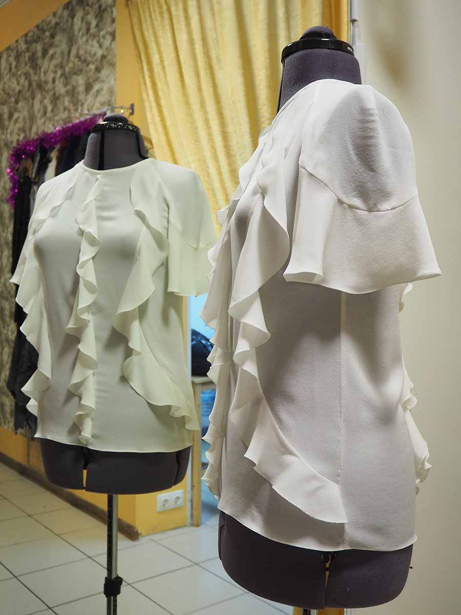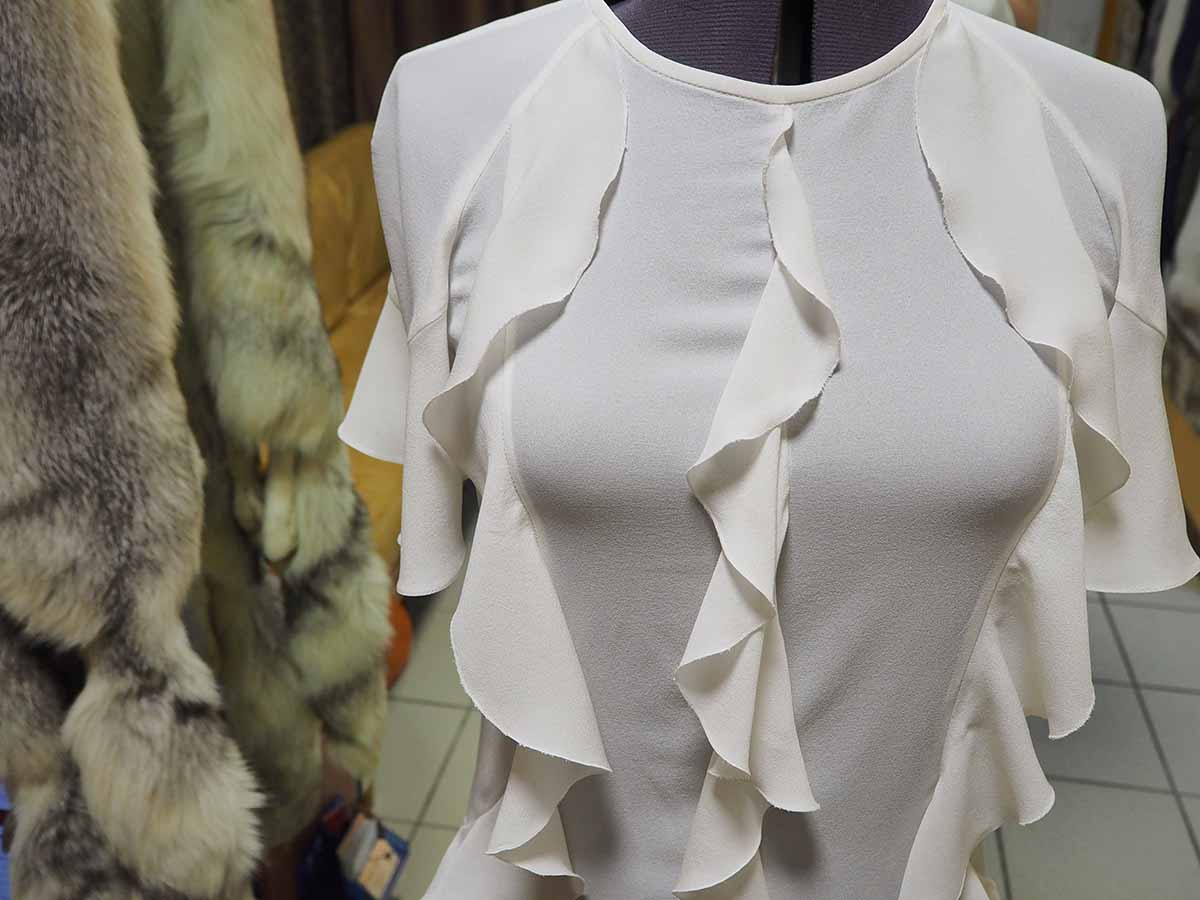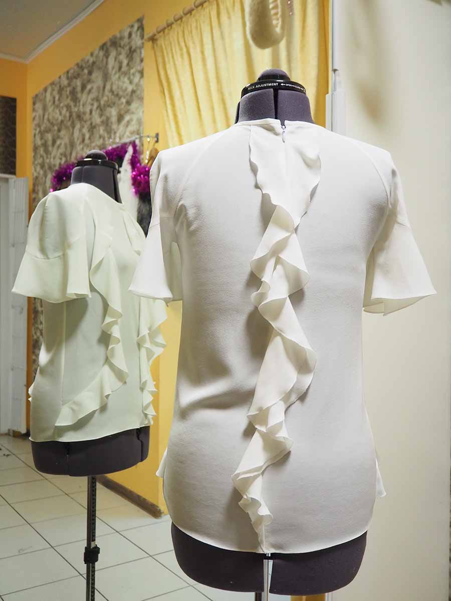 Блузка белого цвета из натурального шелка. По спинке и полочкам отделана воланами, рукав полуреглан, горловина обработана косой бейкой. Любой предмет одежды с воланами выглядит очень эффектно. Отлично подходит для праздников, повседневного наряда и хорошо смотрится в деловом костюме. В зависимости от места расположения этого декоративного элемента, подобные блузы могут носить женщины с разными фигурами, в зависимости от того, что хочется скрыть или подчеркнуть. Консультация мастера поможет окончательно определиться с фасоном, который лучше всего подойдет именно для Вас