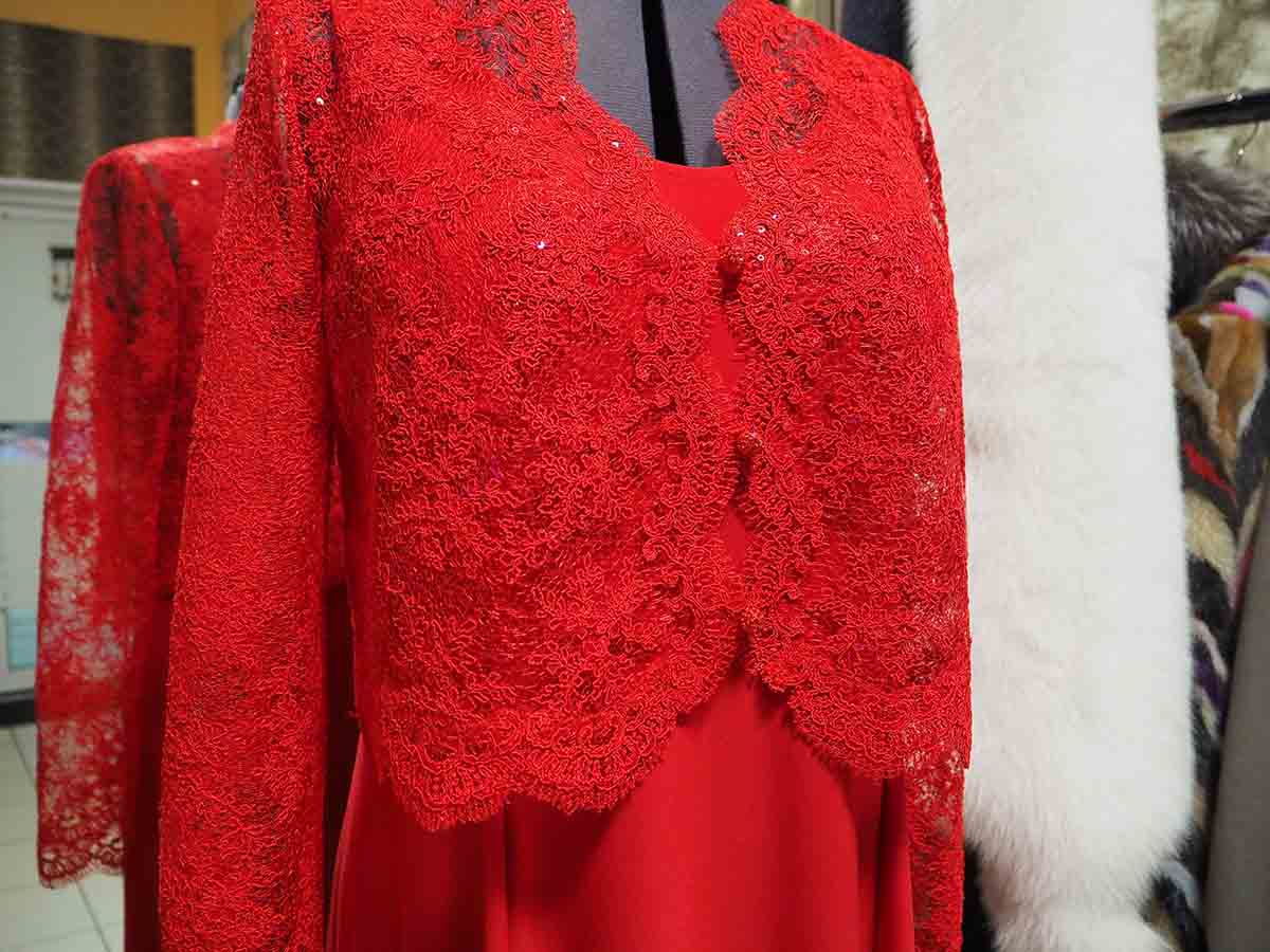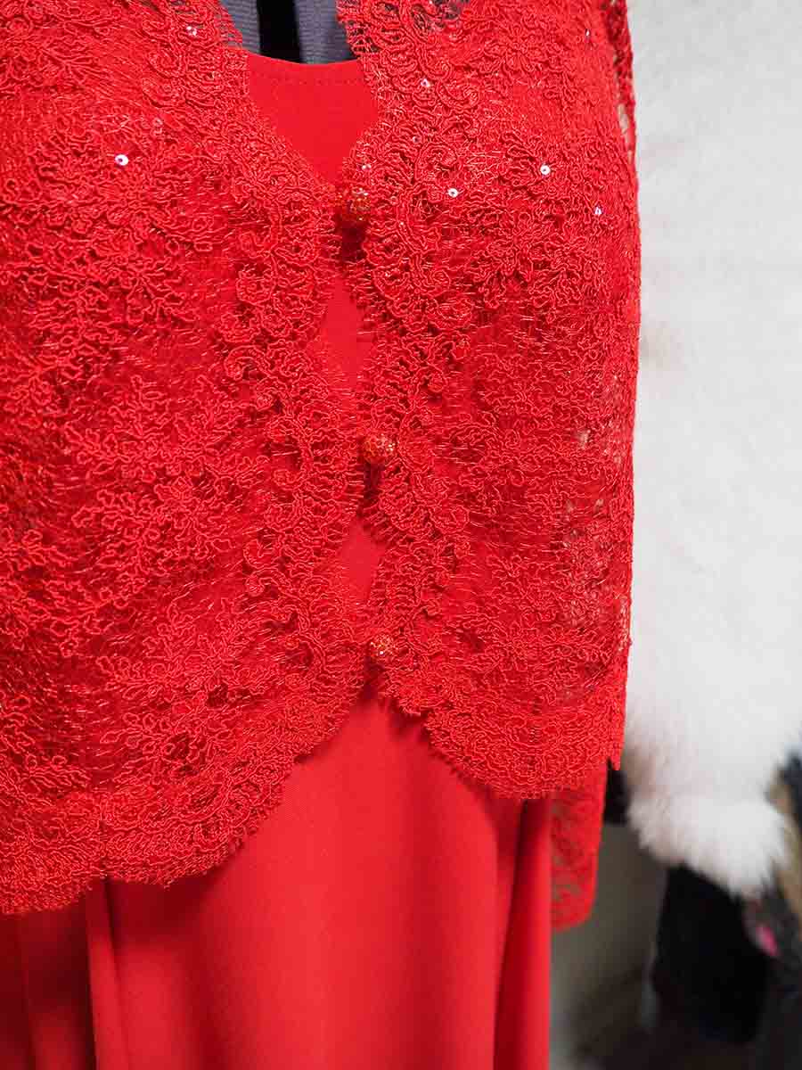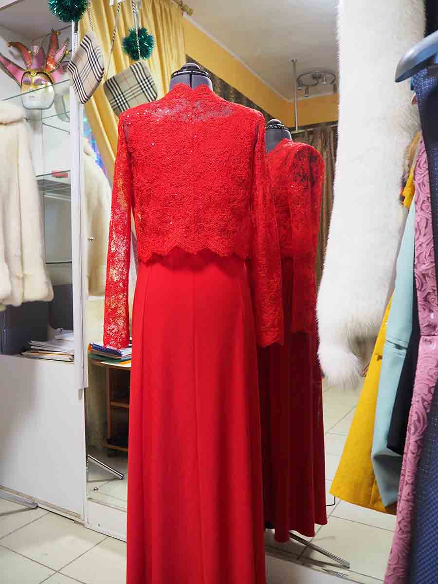 Длинное вечернее платье без рукавов из трикотажного полотна красного цвета. Сверху до линии талии кружевное болеро, фистоны которого уложены вкруговую по горловине, бортам и низу. Наступают Рождественские праздники! Если хотите посетить фуршеты и вечеринки в новых нарядах, индивидуально сшитых на вас, пока еще не поздно обратиться к мастерам