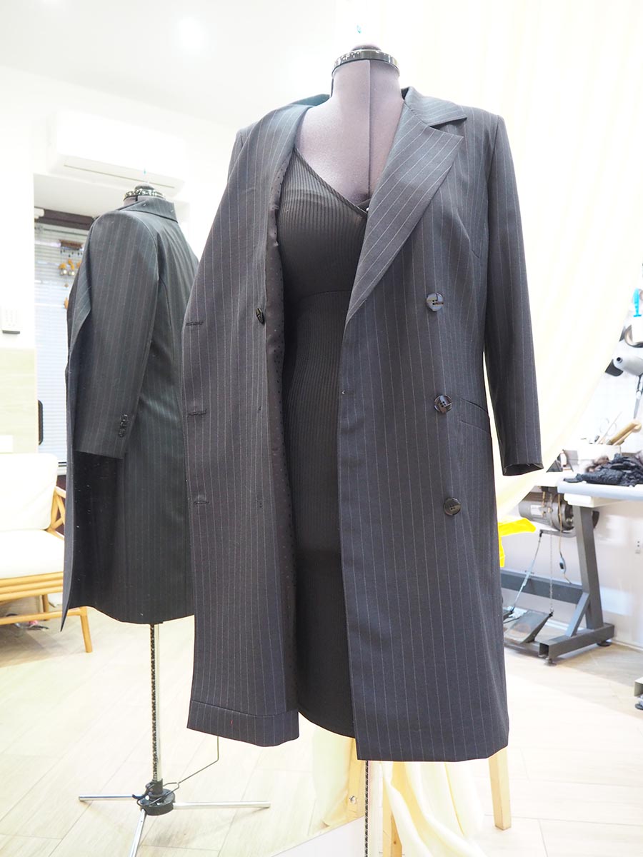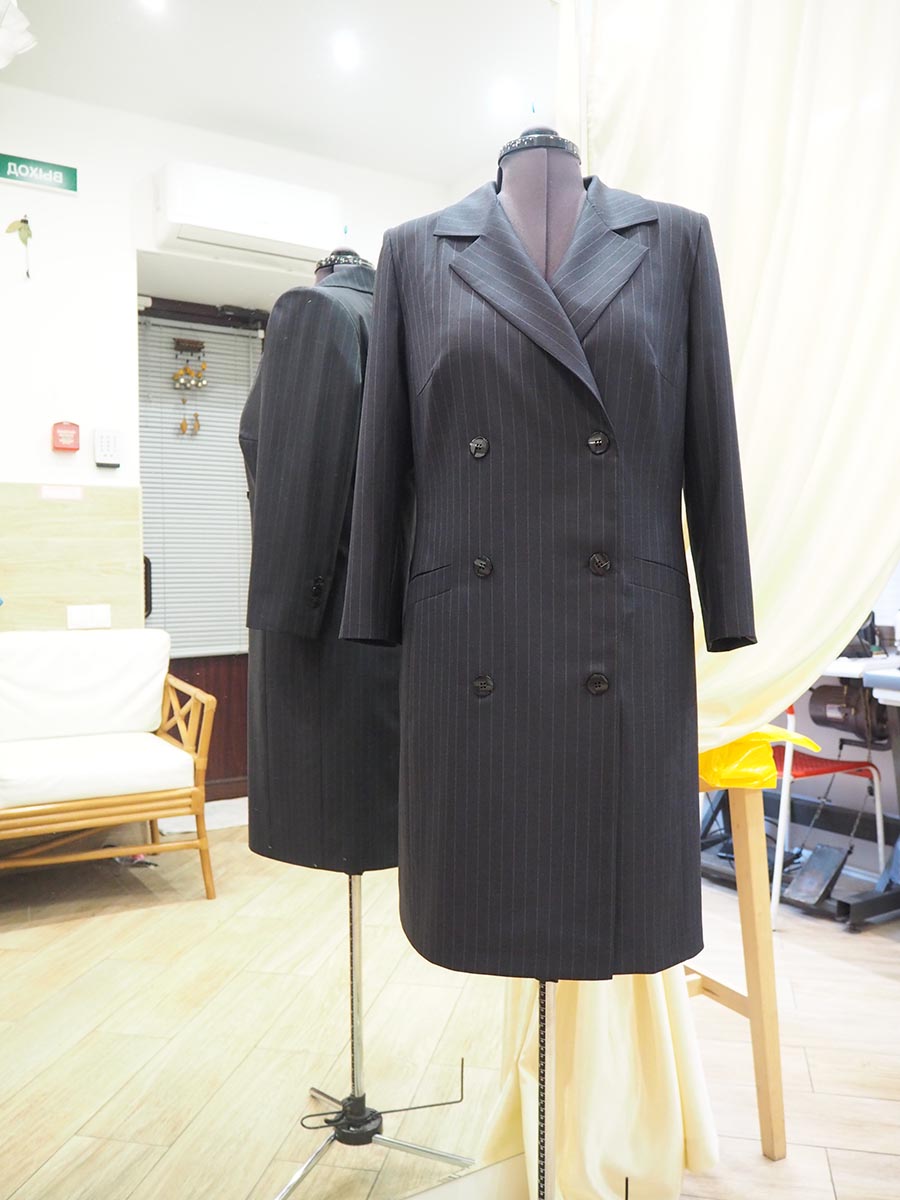 Двубортное платье прямого силуэта с английским воротником на шелковом подкладе. Карманы листочка, рукав втачной со шлицей. Сзади для свободы движений также изготовлена шлица.