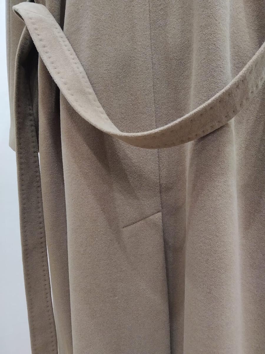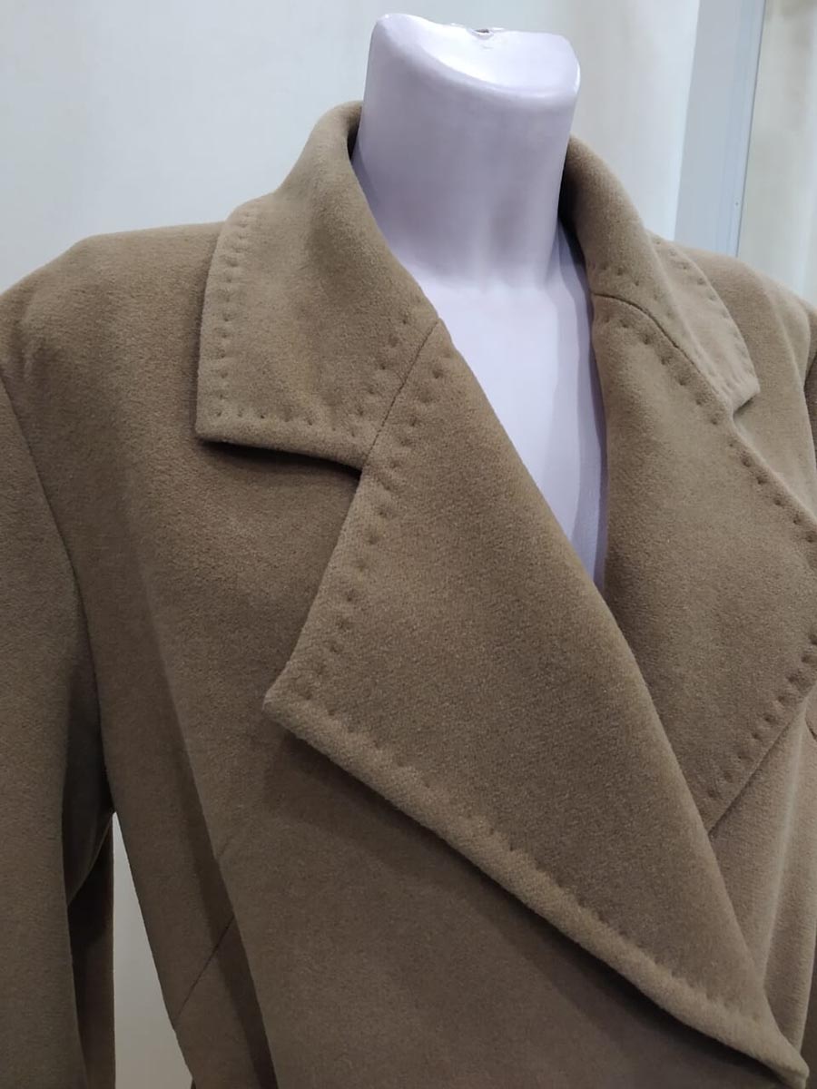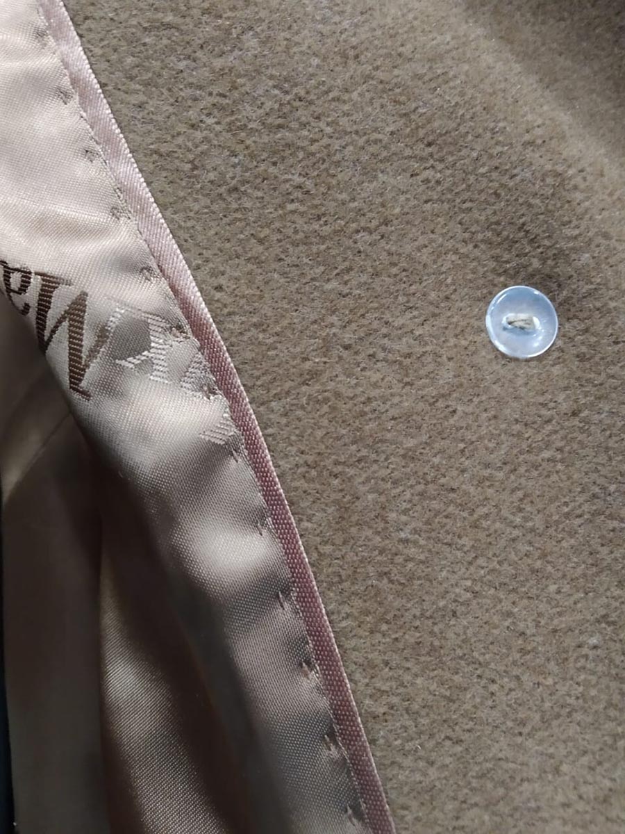 Заказчицей выбран фасон двубортного изделия с английским воротником, по полочке карманы "листочка", рукав втачной, по спинке - шлица, линия талии подчеркнута поясом. Подкладка из натурального вискозного полотна от Max Mara. По краям борта и воротника наш мастер выполнил ручную отделку - вспушку.