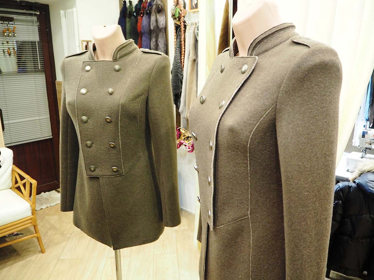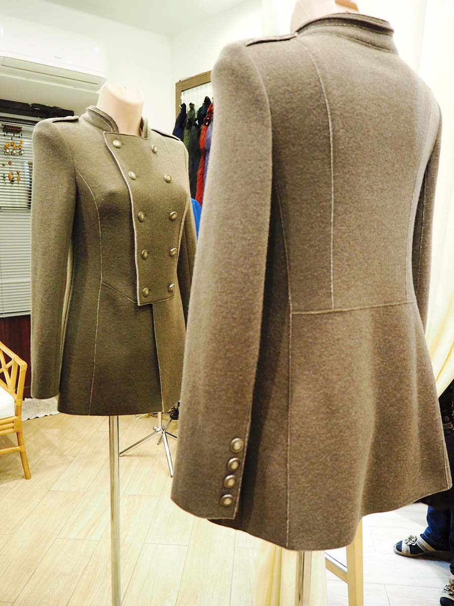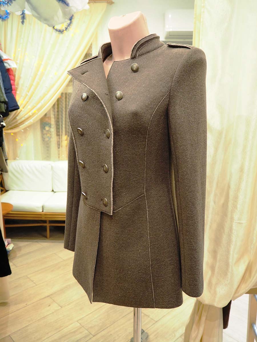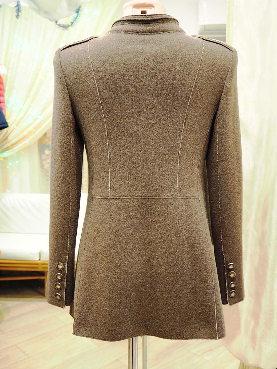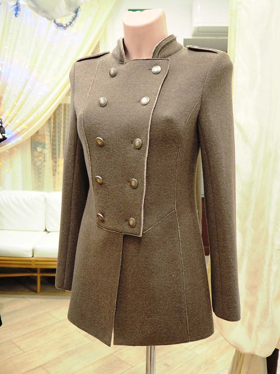 Женский двубортный жакет с рельефами и фигурными подрезами по линии талии, полочке и спинке. Обработан накладным швом. Воротник стойка с декоративным кантом. Рукав втачной, двухшовный с открытой шлицей на четырех пуговицах.