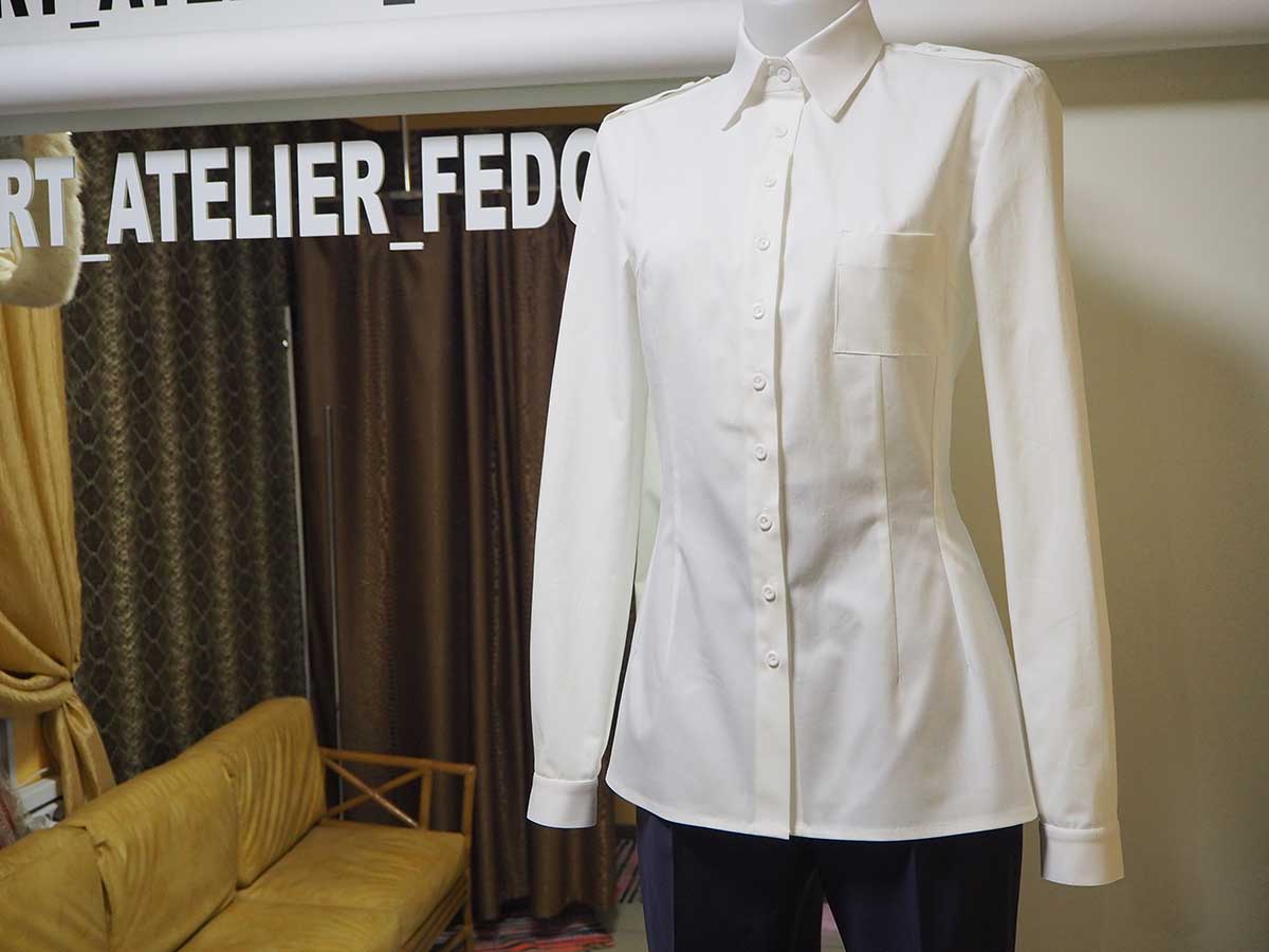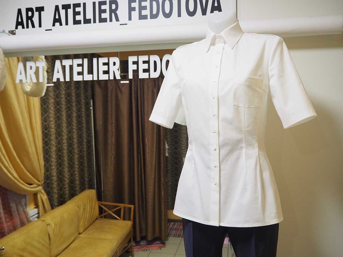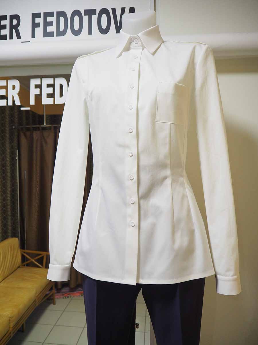 Форменный комплект для пилота авиакомпании. Две блузки и брюки выполнены согласно дресс-коду организации из высококачественных материалов заказчицы. Блузки приталенного силуэта из белого стрейчевого хлопка итальянского производства: одна с длинным рукавом, вторая – с коротким Для выделения фигуры сделаны две талиевые вытачки, рукав втачной на манжете, воротник отложной на стойке, по плечевому шву – погоны. Брюки с завышенной талией, облегающие по бедрам и слегка заужены книзу, по боковым швам классические карманы, сшиты из тонкой итальянской шерсти темно-синего цвета. Индивидуальный подход мастера в сочетании с грамотно выбранной тканью при создании для вас форменной одежды, гарантируют вам уверенность в себе и отличное настроение в любой рабочей ситуации