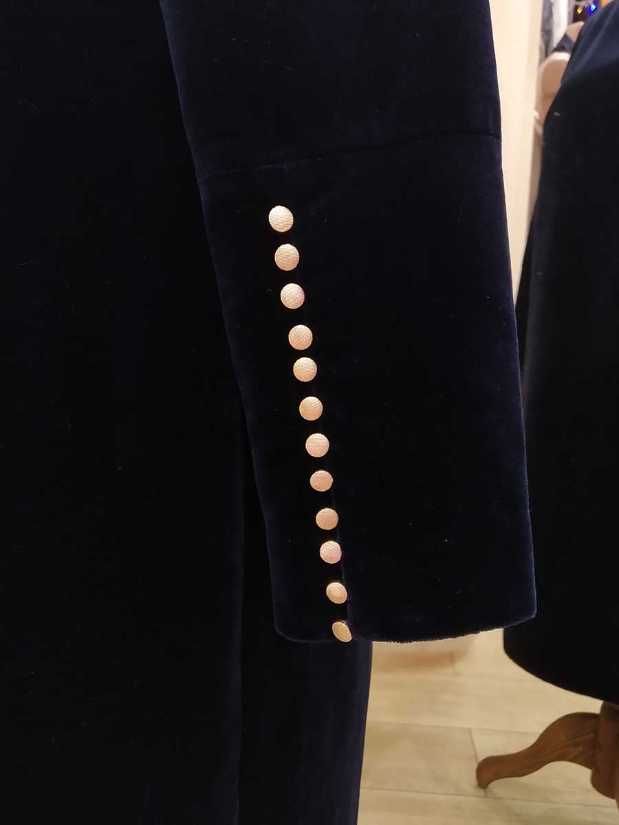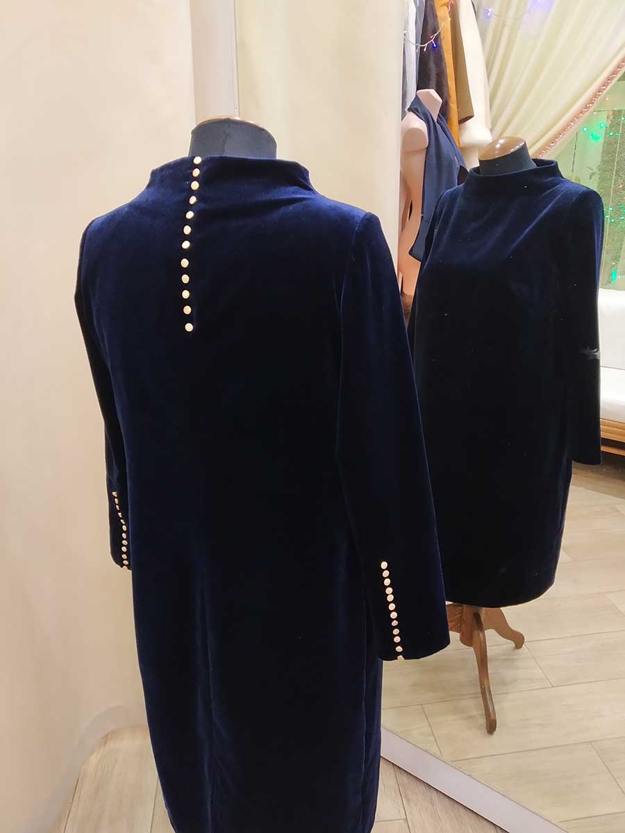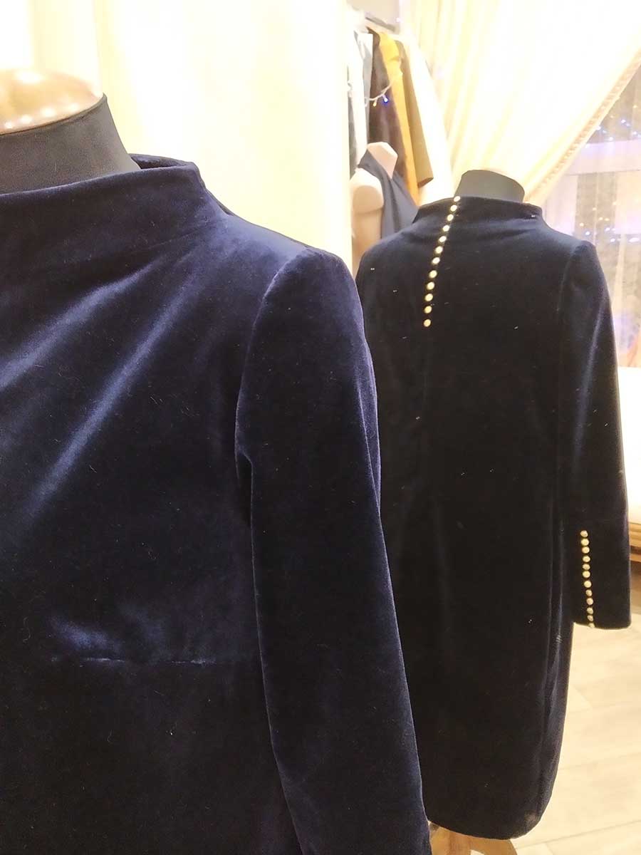 Платье – футляр прямого силуэта, выполнено из бархата на хлопчатобумажной основе немецкого производства. Воротник стойка-лодочка, рукав втачной с манжетом на удлинение. Особый шик изделию придают застежки с воздушными петлями на золотых пуговицах, изготовленные по спинке и на мажетах рукава. Подкладка из натуральной вискозы обеспечивает дополнительный комфорт.
