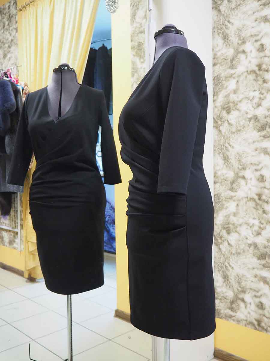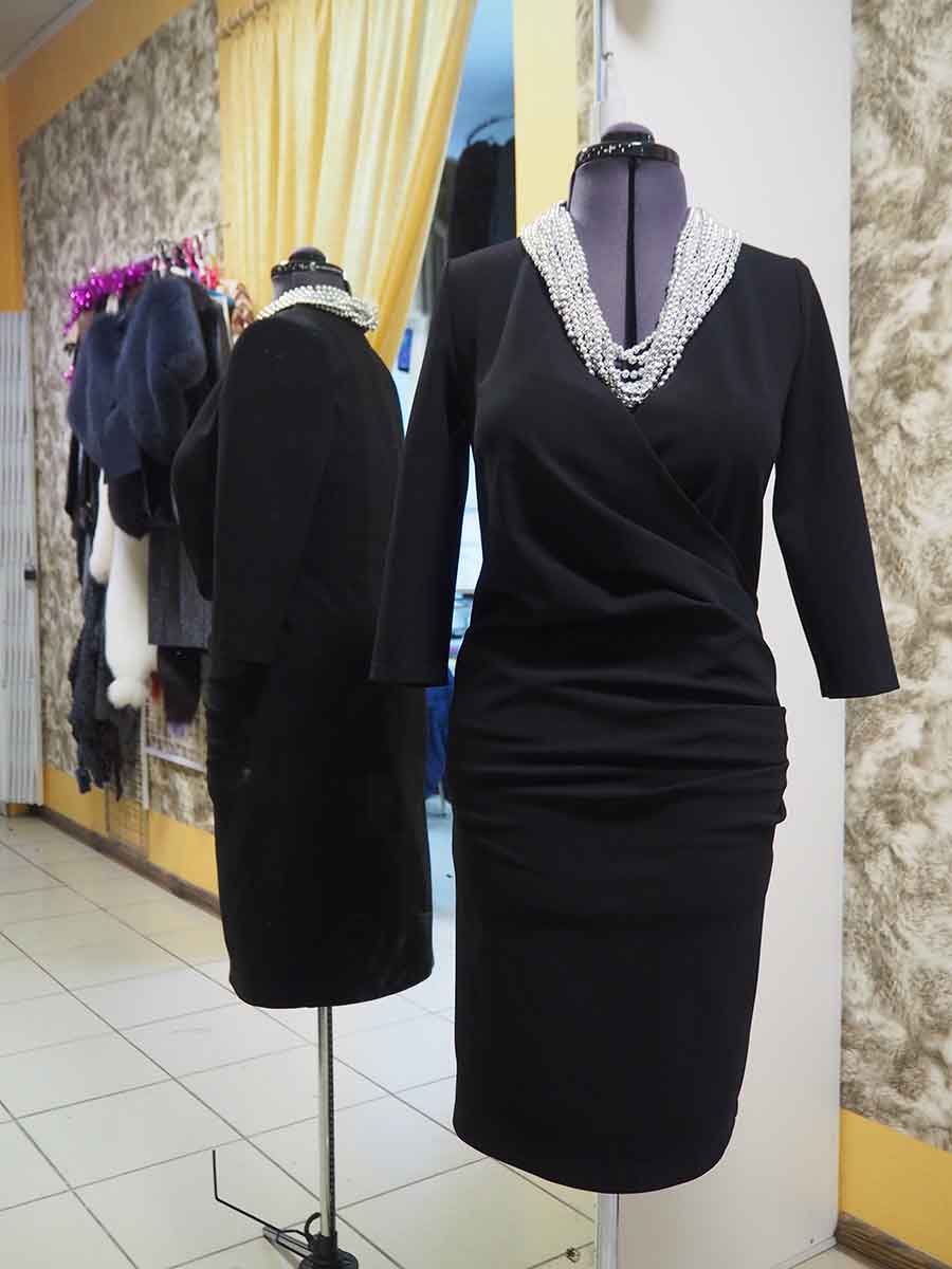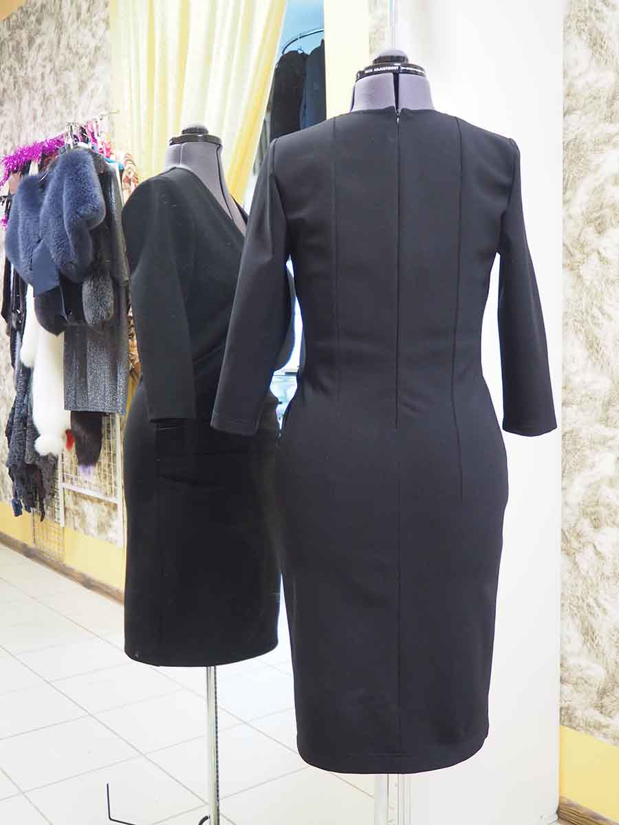 Элегантное черное запашное платье на вечер с глубоким V-образным вырезом, рукав втачной три четверти. Выполнено из шикарного вискозного трикотажа итальянского производства