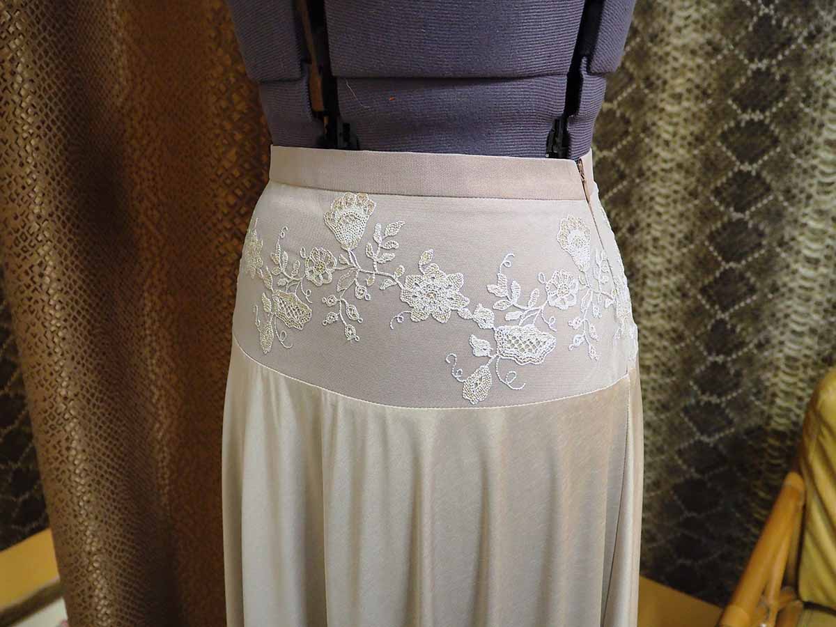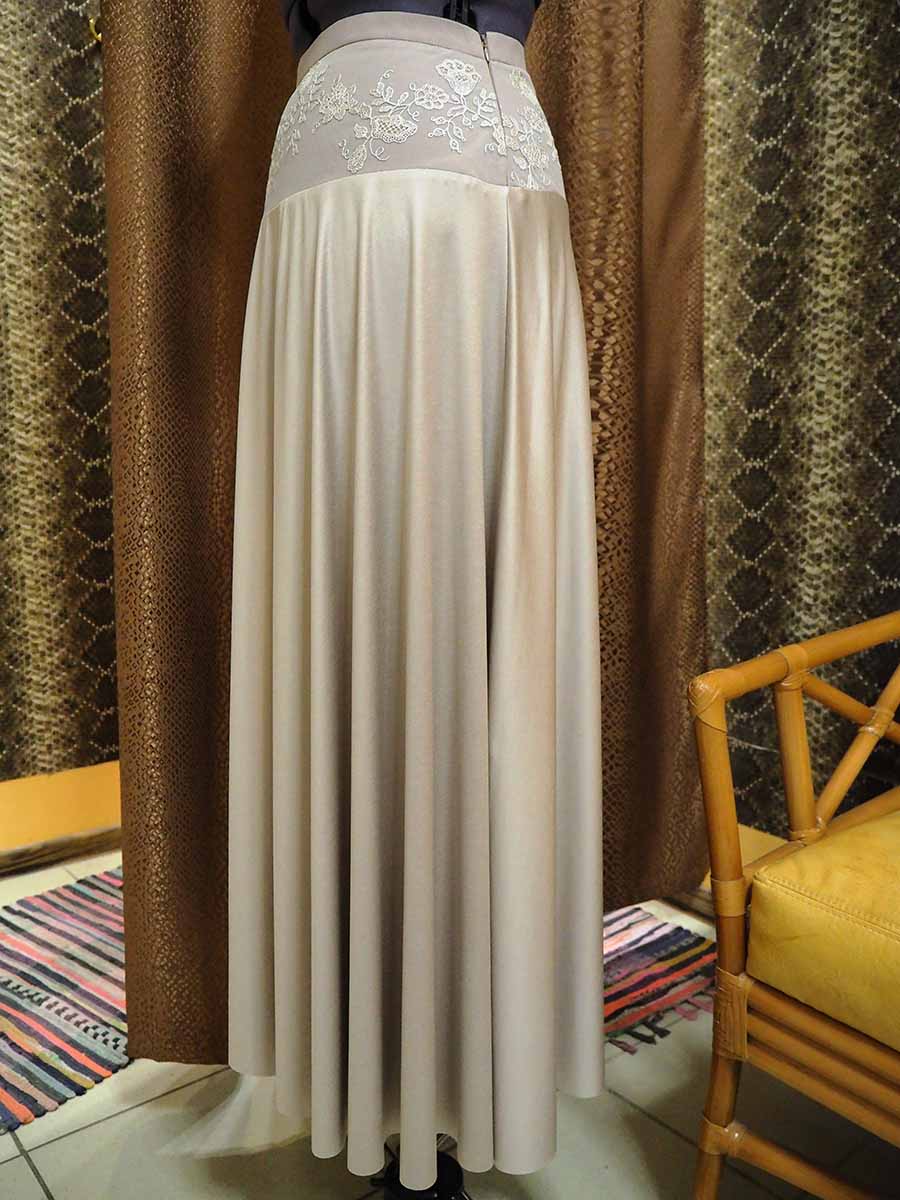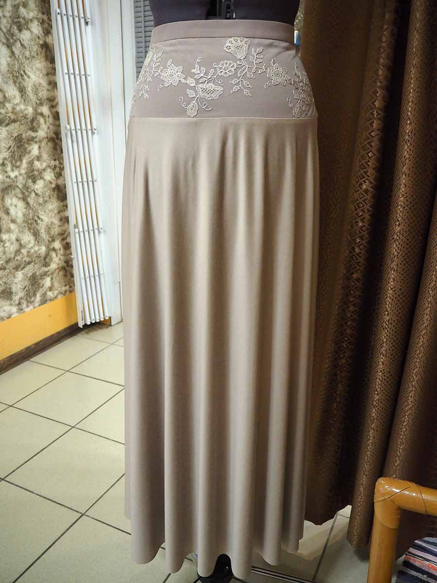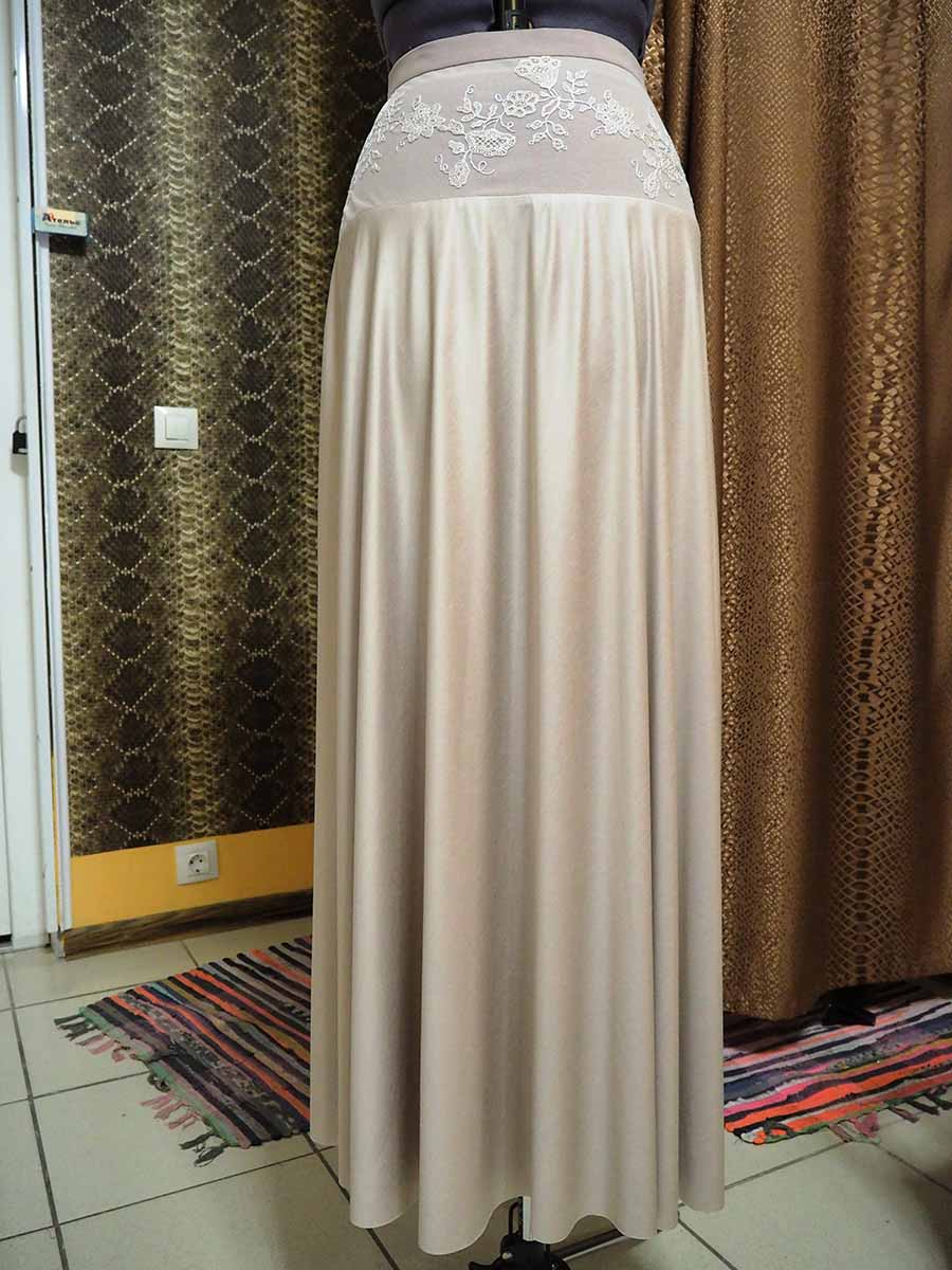 Летняя юбочка из вискозного трикотажа на кокетке, которая декорирована кружевом на сетке. Имеет боковую потайную молнию