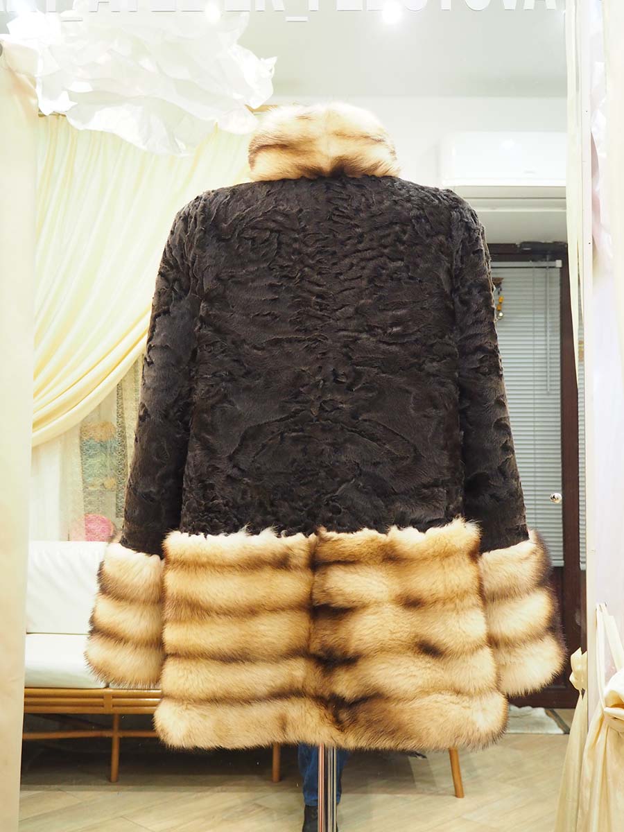 Шубка из меха хорька прослужила своей хозяйке более 10 лет, и это весьма серьезный период для такого материала. Расставаться с поношенной вещью не захотелось, и было решено сохранившиеся пластины использовать для создания нового пальто. К хорю мастер подобрал мех каракуля, в данном случае хорошо подошел шоколадного цвета. Согласовали фасон, сроки, подкладку, фурнитуру… и начали ваять.