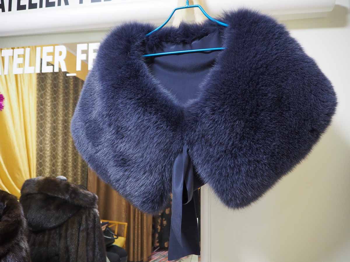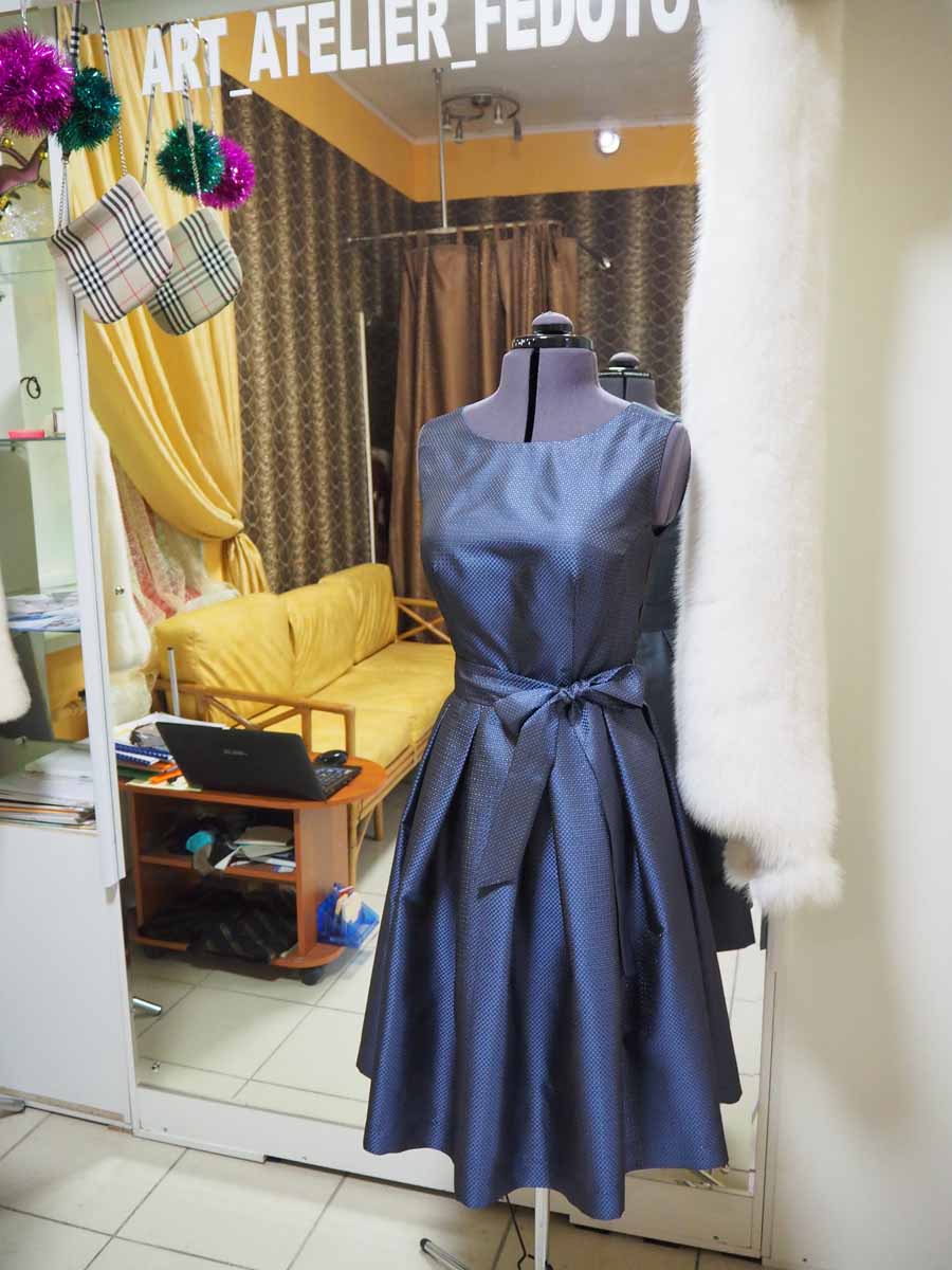 Коктейльное платье без рукавов с вырезом "лодочка" из ткани на атласной основе с люрексом. К платью изготовлена горжетка из меха песца цвета графит с использованием техники перфорации на мембране