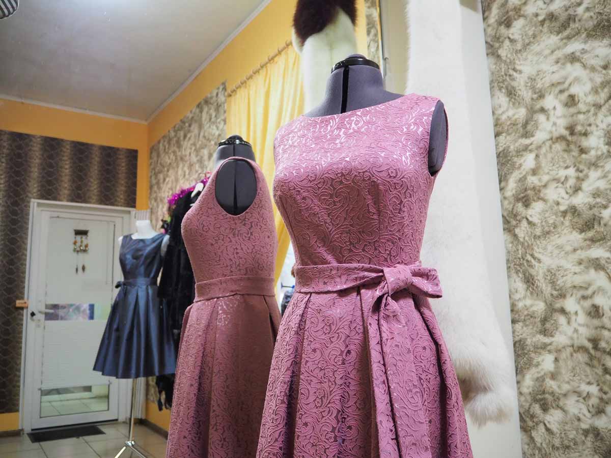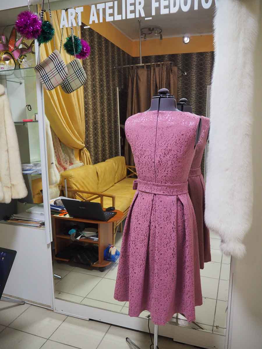 Коктейльное платье без рукавов из жаккардовой ткани, отрезное по линии талии с бантовыми складками, украшенное поясом, по горловине вырез "лодочка". Выполнено из ткани заказчика