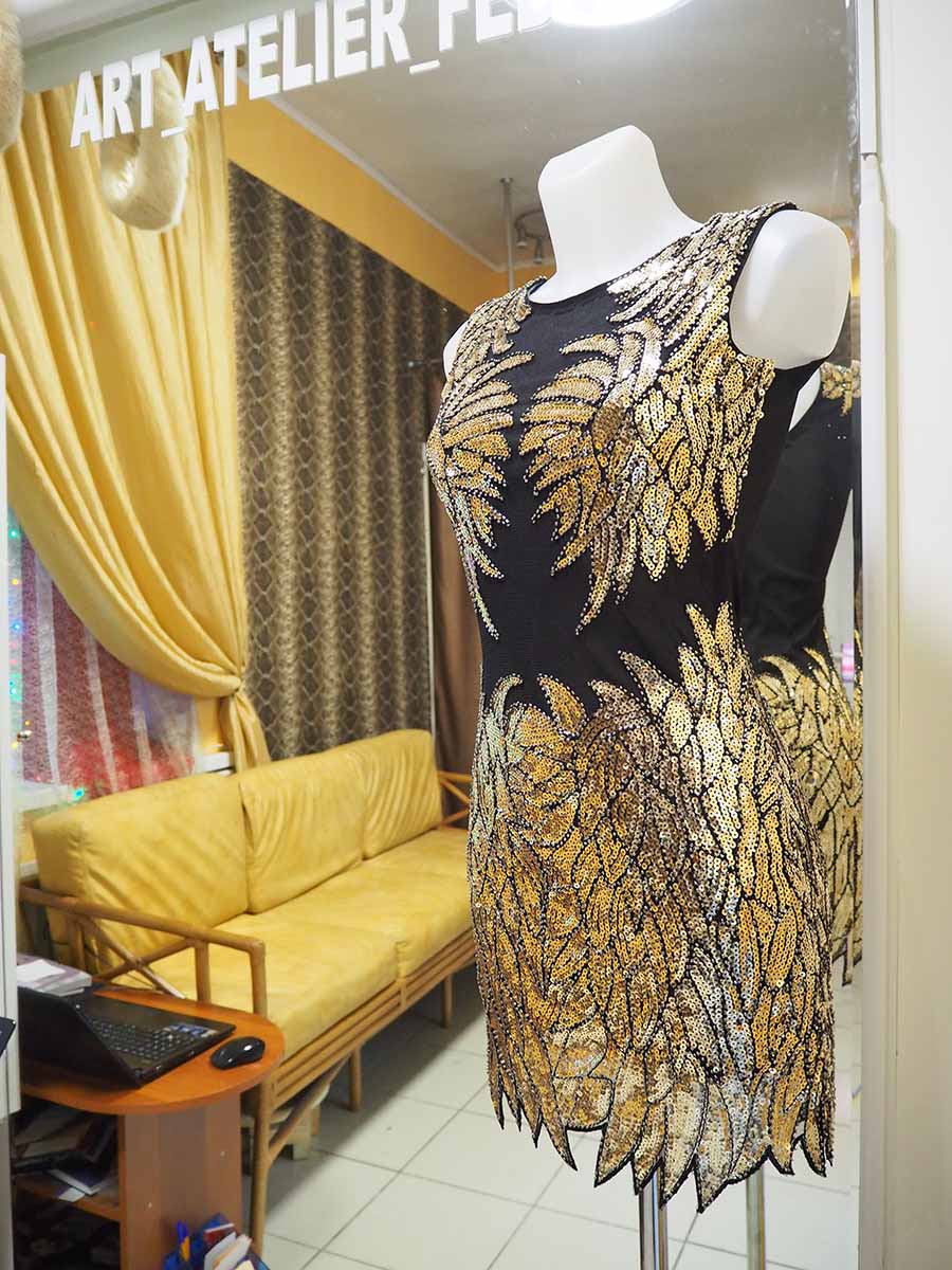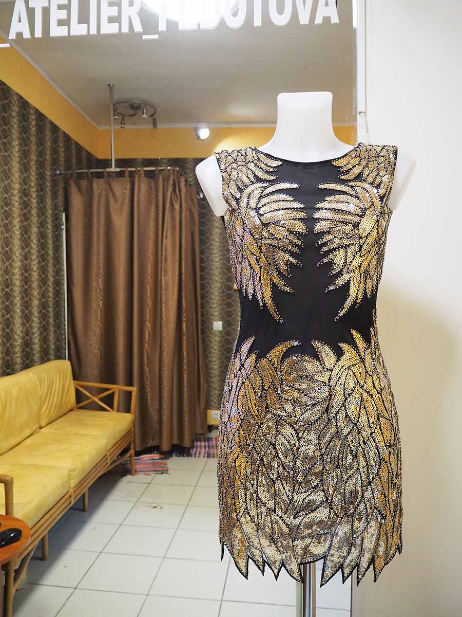 Коктейльное платье для праздничного вечера, изготовленное посредством вышивки на сетке поэтками и бисером. Платье подогнано по фигуре и замечательно подходит для девушки с идеальными формами