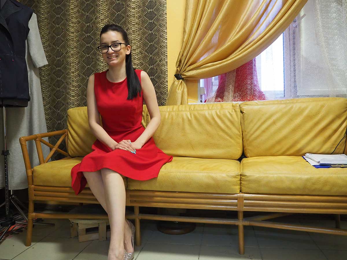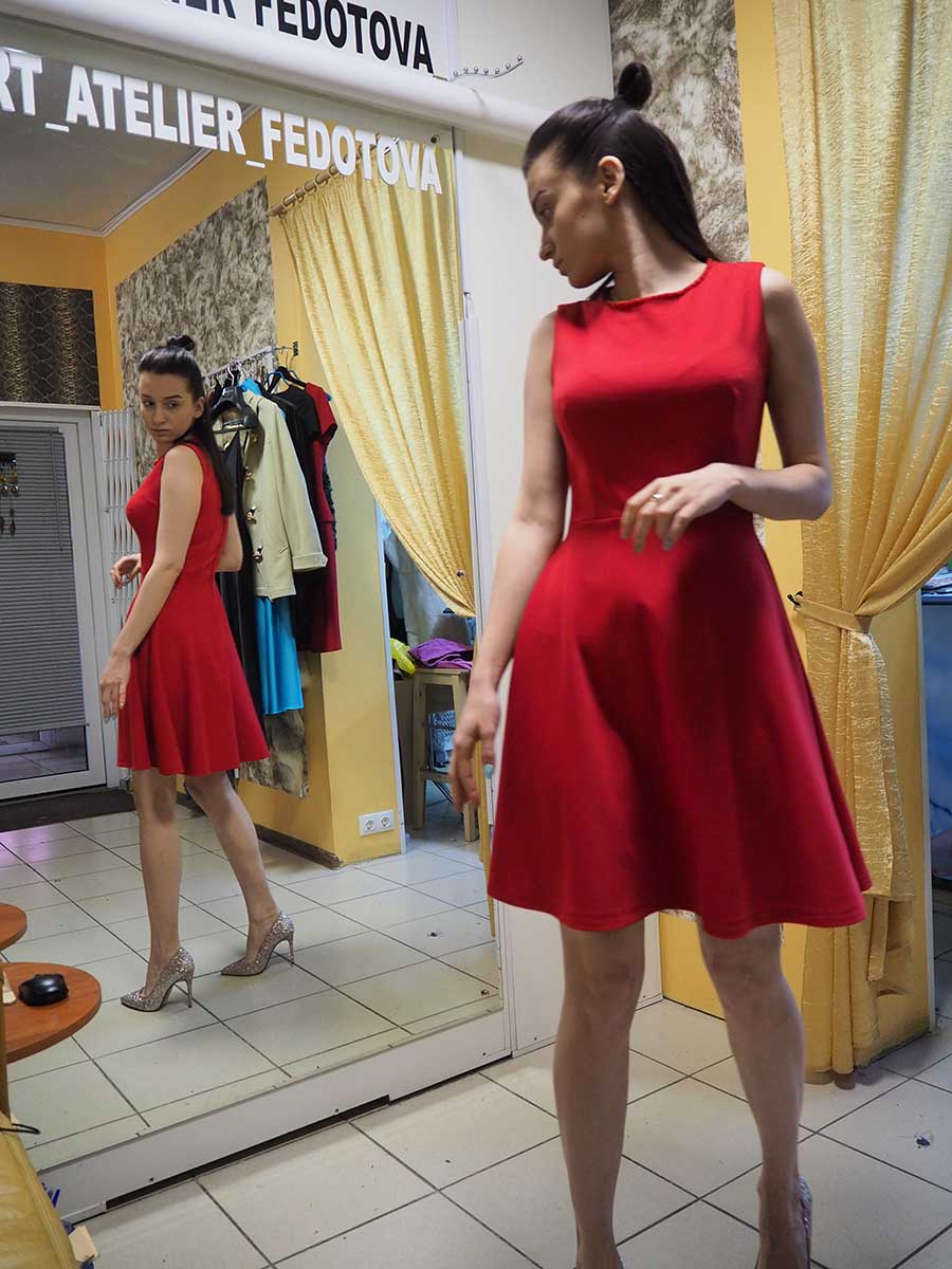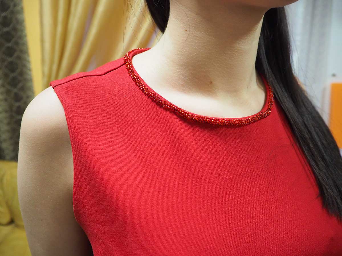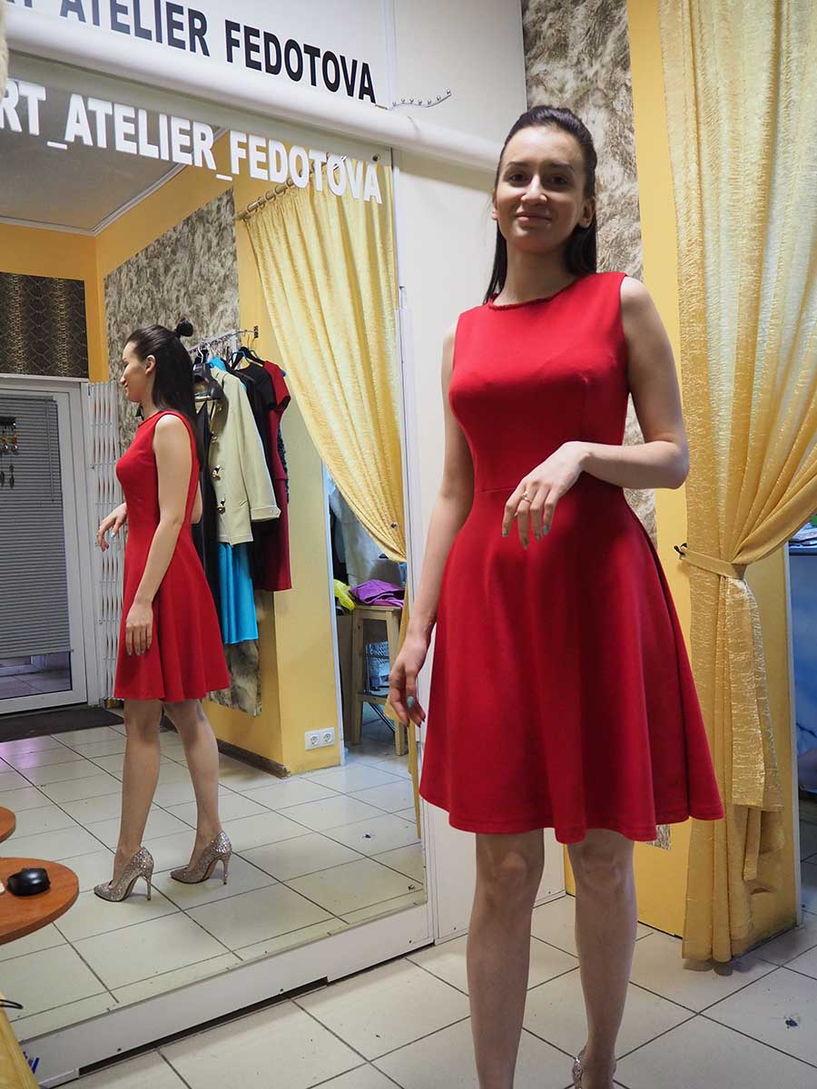 Коктейльное платье из красного трикотажа без рукавов, отрезное по талии, с юбкой по косой. По среднему шву спинки и по горловине выполнена ручная декоративная отделка бисером, что придает изделию уникальность