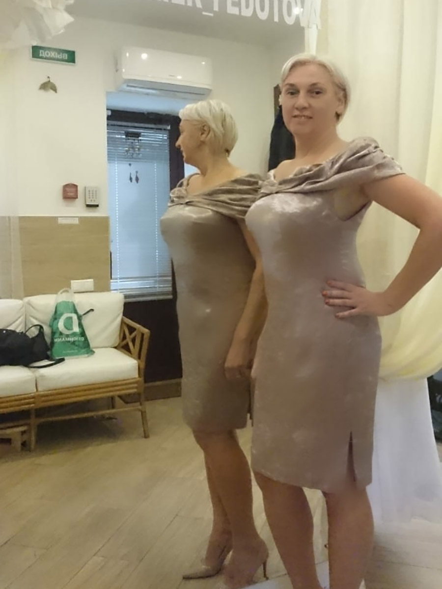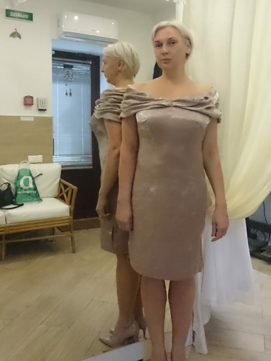 Коктейльное платье прилегающего силуэта длиной до колена с боковыми разрезами, выполнено из жатого шелка на подкладке. Прилегание обеспечено за счет талиевых вытачек по полочке и спинке. Боковой шов на потайной молнии. Верх платья с глубоким декольте оформлен драпировкой, спускающейся на плечи.