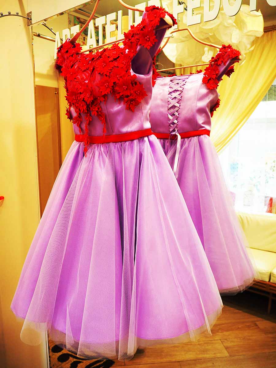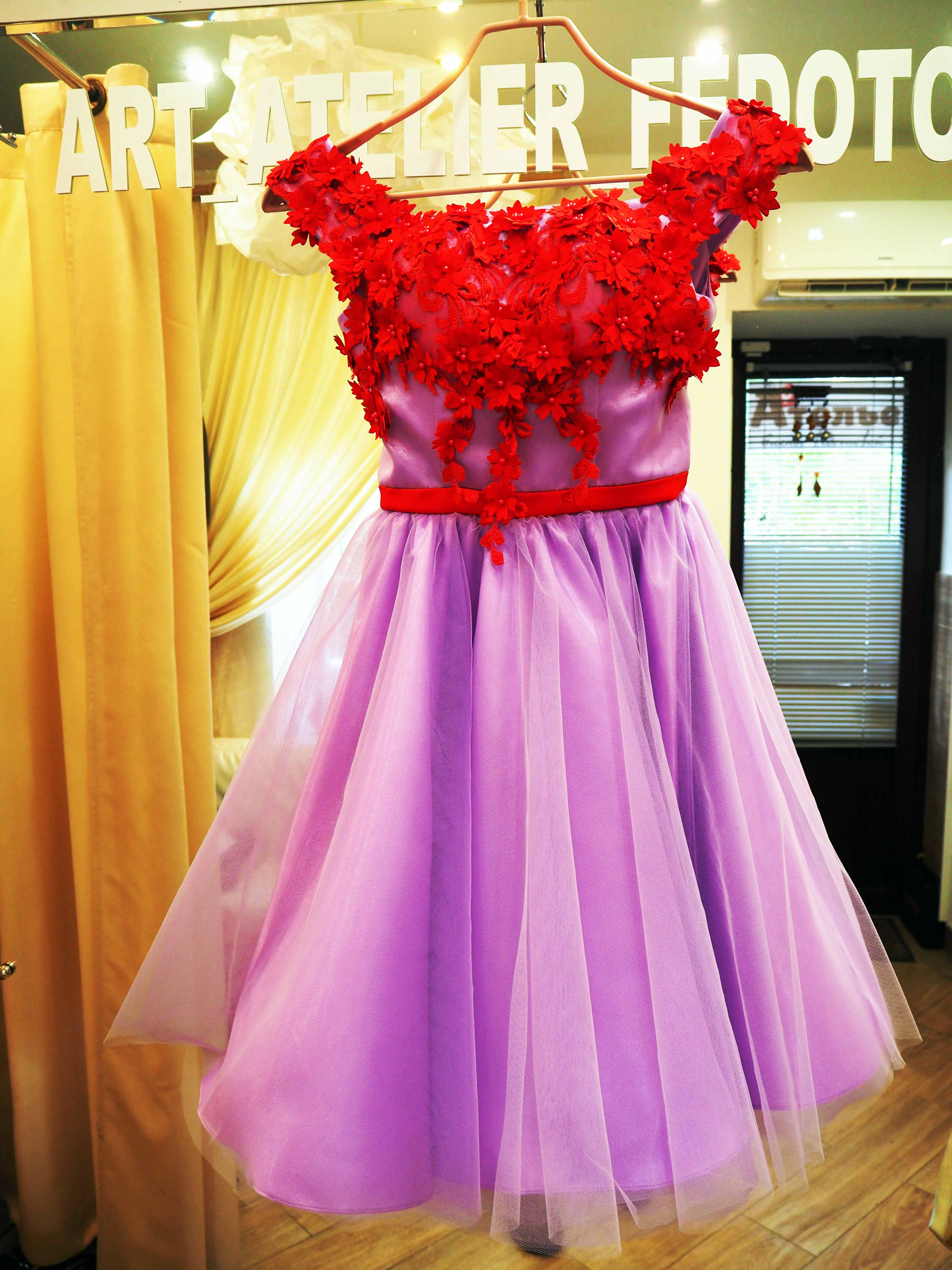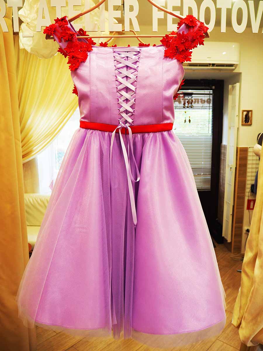 Наряд для школьного выпускного бала наш мастер создал, комбинируя атлас и фатин, по предоставленной заказчицей картинке. Платье отрезное по линии талии. Верхняя часть представляет собой многослойный корсет с отделкой из 3D кружева, которое крепилось ручным способом. Юбка – солнце, также многослойная (пачка). Застегивается платье с помощью молнии, но для дополнительной утяжки по спинке изготовлена шнуровка.