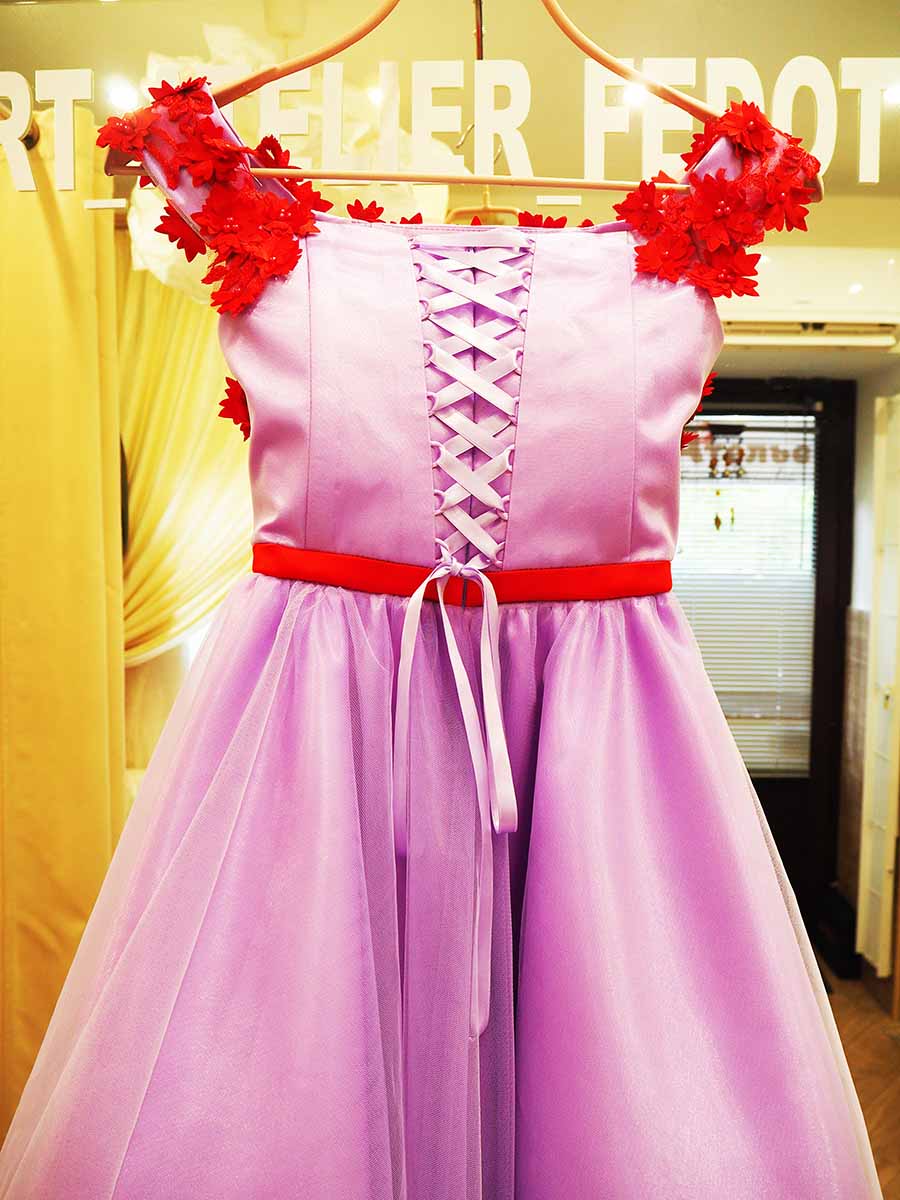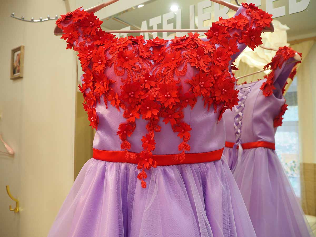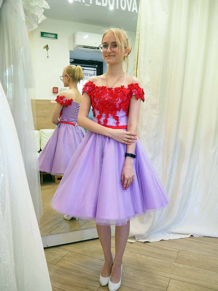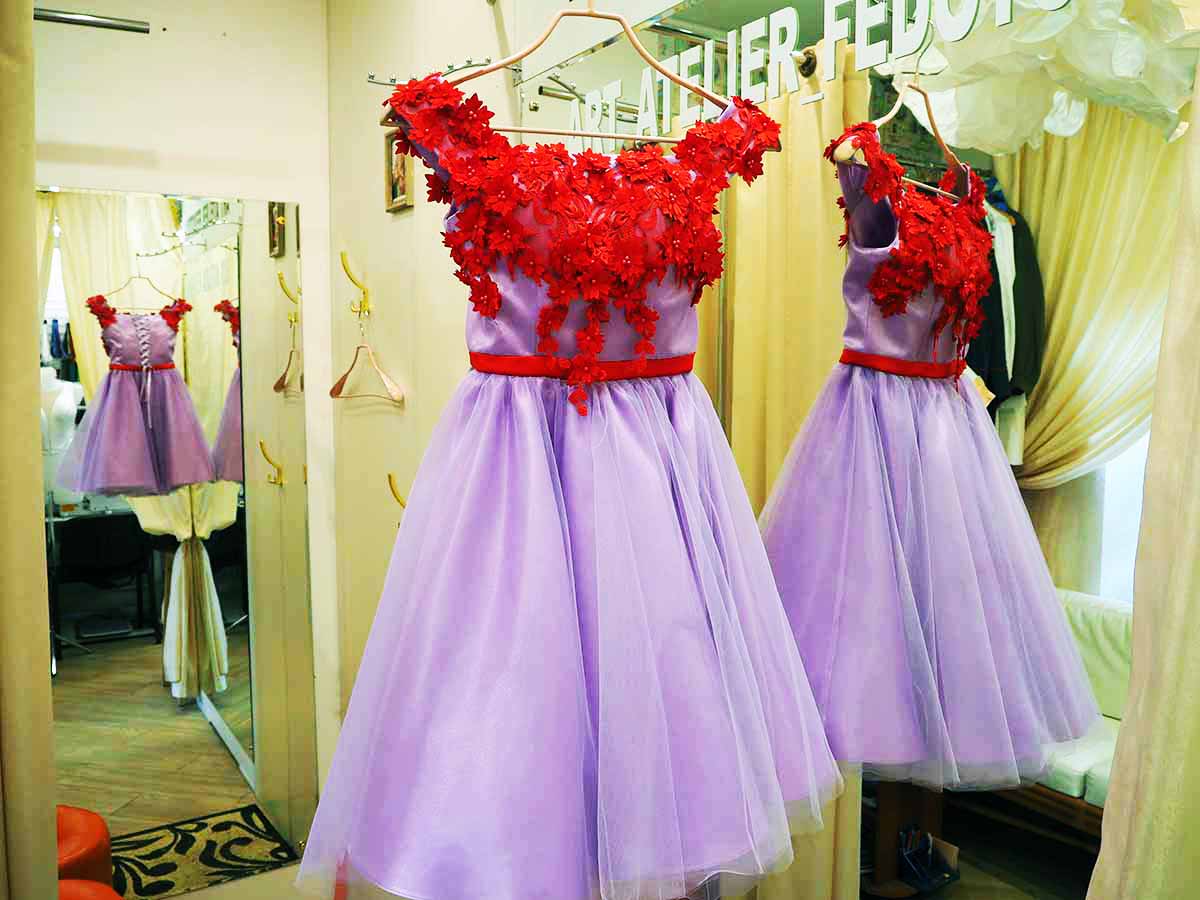 Наряд для школьного выпускного бала наш мастер создал, комбинируя атлас и фатин, по предоставленной заказчицей картинке. Платье отрезное по линии талии. Верхняя часть представляет собой многослойный корсет с отделкой из 3D кружева, которое крепилось ручным способом. Юбка – солнце, также многослойная (пачка). Застегивается платье с помощью молнии, но для дополнительной утяжки по спинке изготовлена шнуровка.