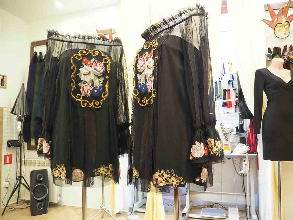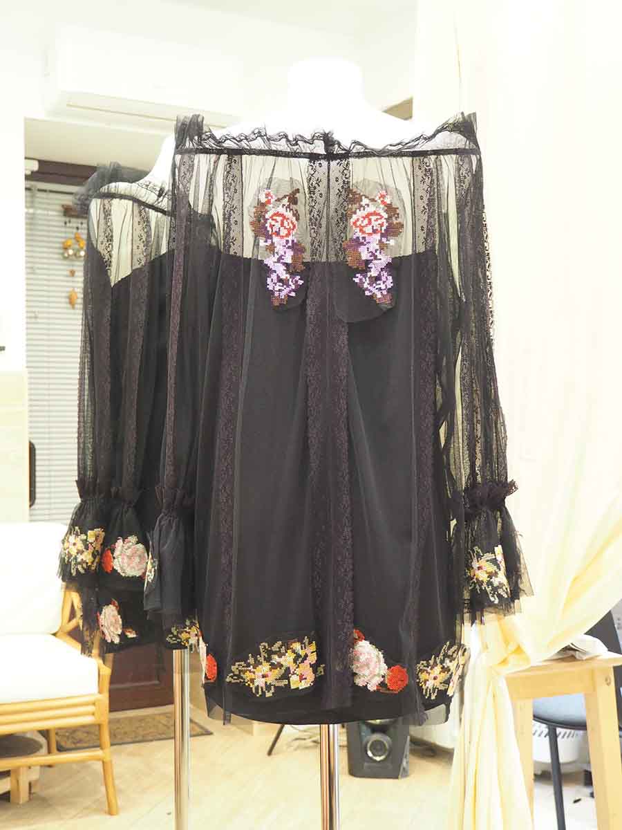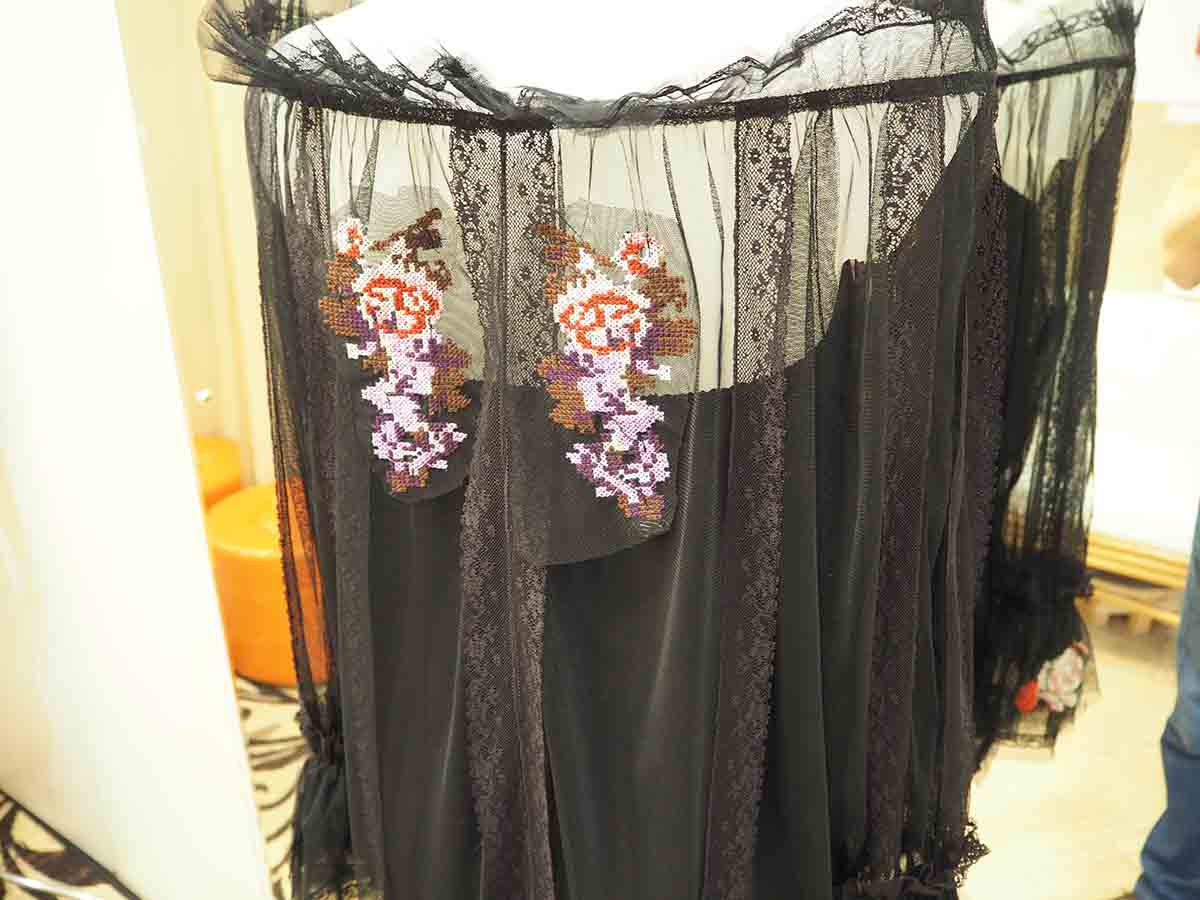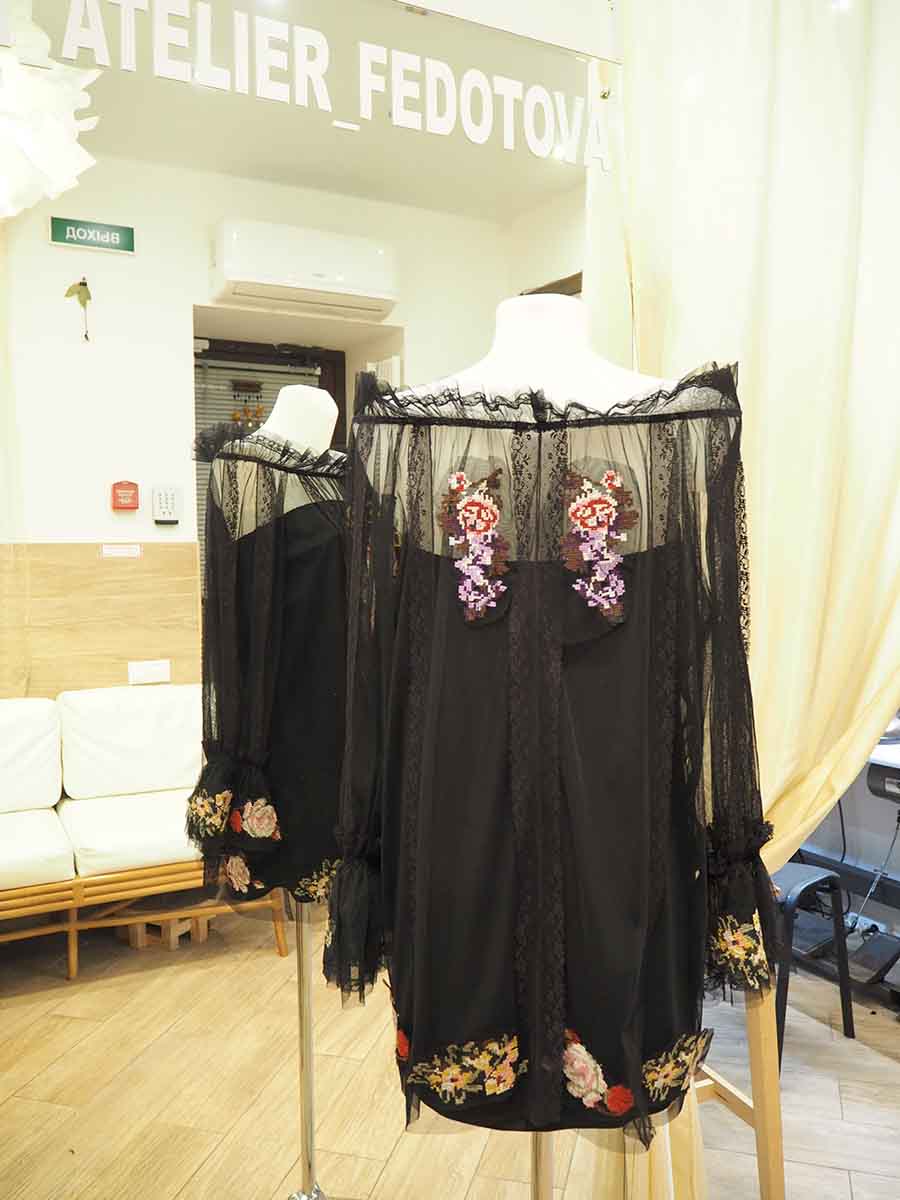 Легкое платье из сетки с вышивкой. Вырез изготовлен в виде рюша на резинке с возможностью опускать верх изделия на плечи. Наряд декорирован вертикальными полосками из кружевной тесьмы. По низу рукава волан с нашитыми фрагментами декоративного кружева. Чехол под платье выполнен из натурального шелка, сверху на резинке.