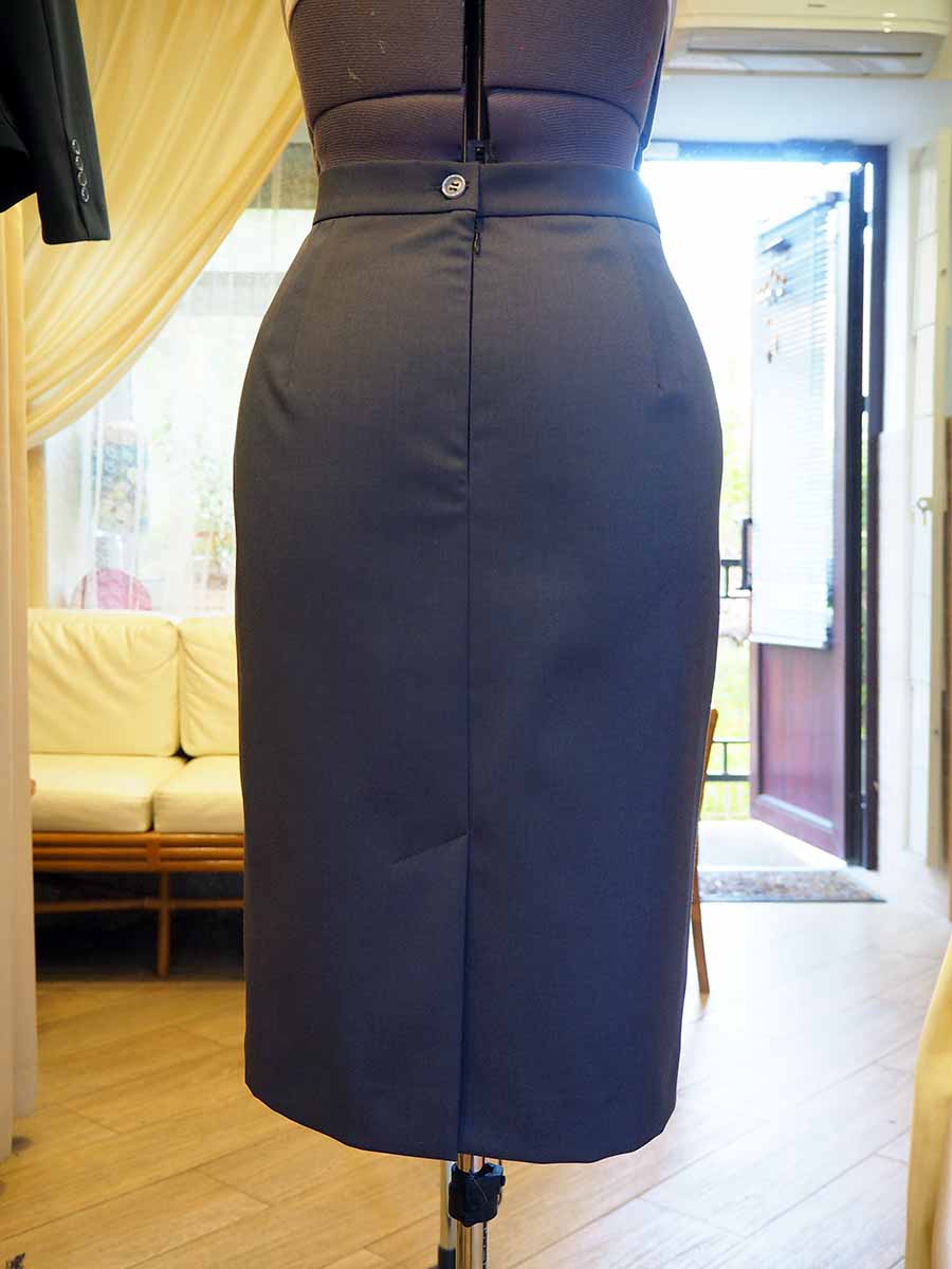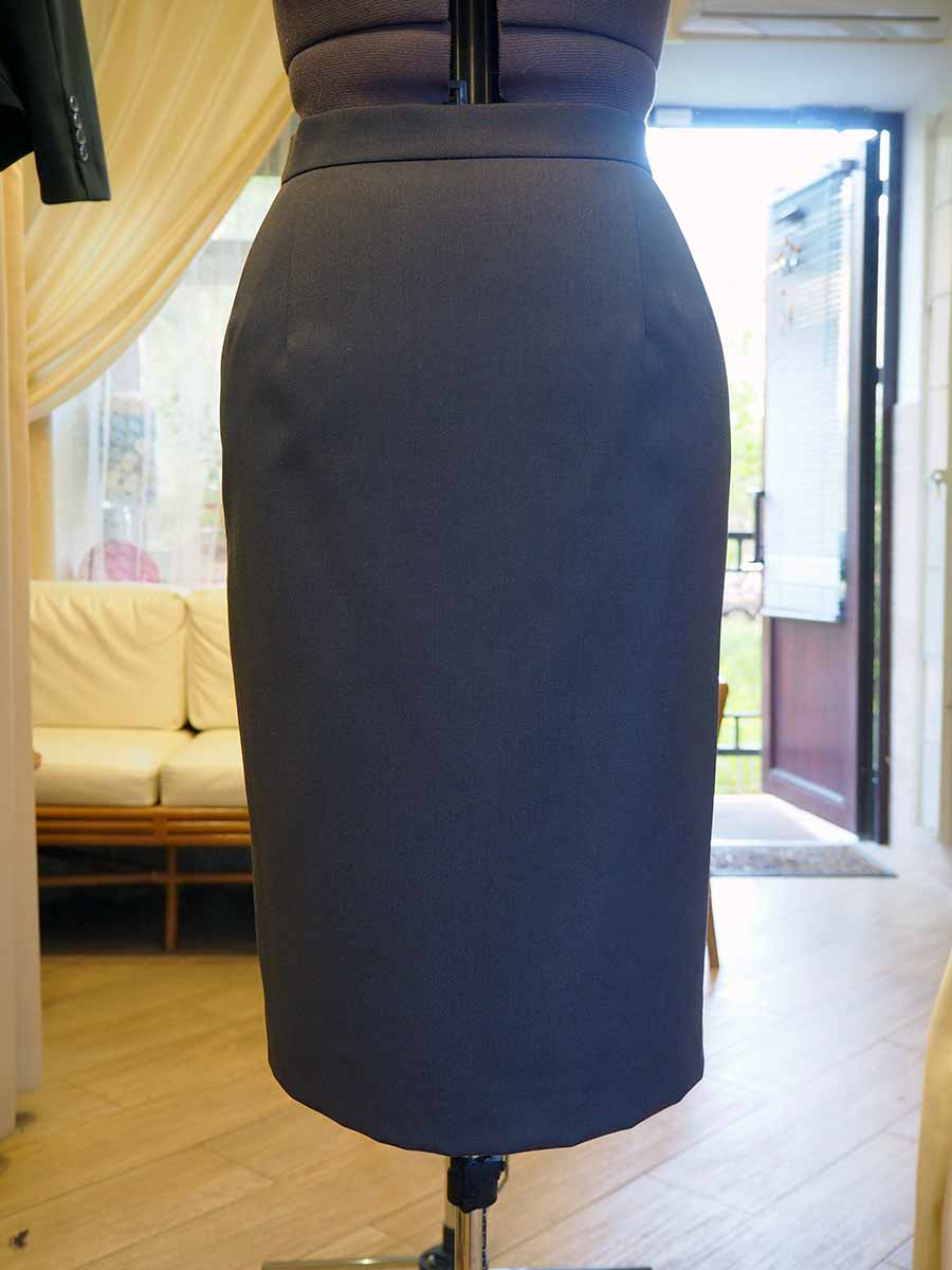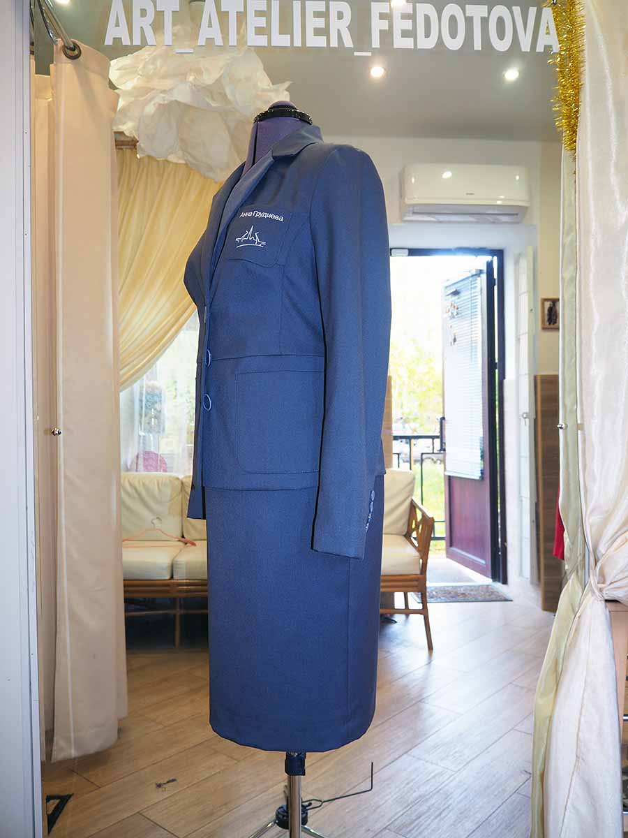 В данном случае наш мастер, согласно пожеланиям заказчицы, создал женский костюм из предоставленной практичной ткани. Пиджак с английским воротником и накладными карманами. По талии пришита баска – широкая оборка, которая создает женственную линию и романтично преображает даже самую простую модель изделия. Рукав втачной, двухшовный, со шлицей и декоративными пуговицами. На нагрудном кармане выполнена вышивка имени и логотипа компании серебряной нитью. Юбка на подкладке прямая, заужена книзу, со шлицей и потайной молнией.