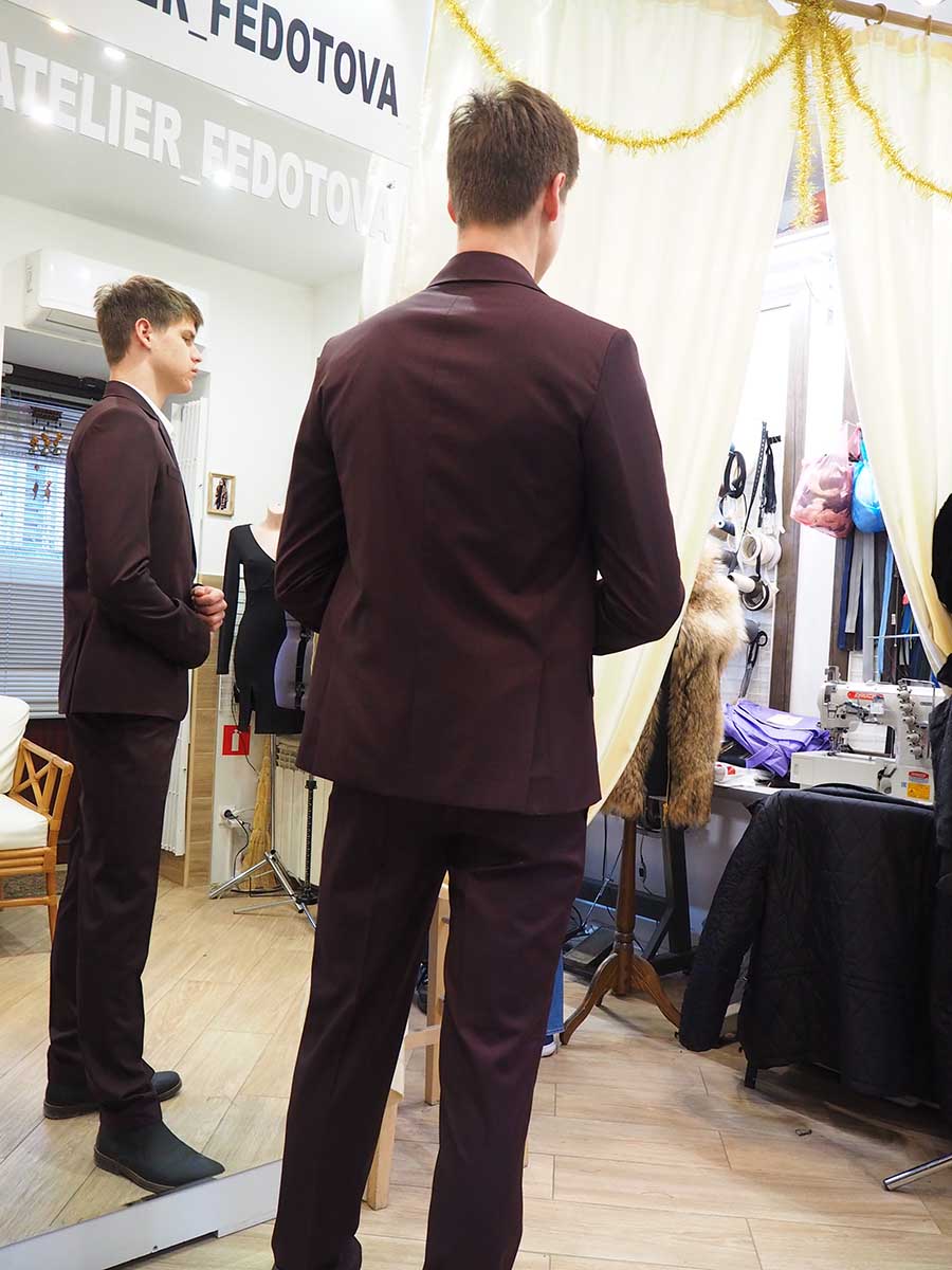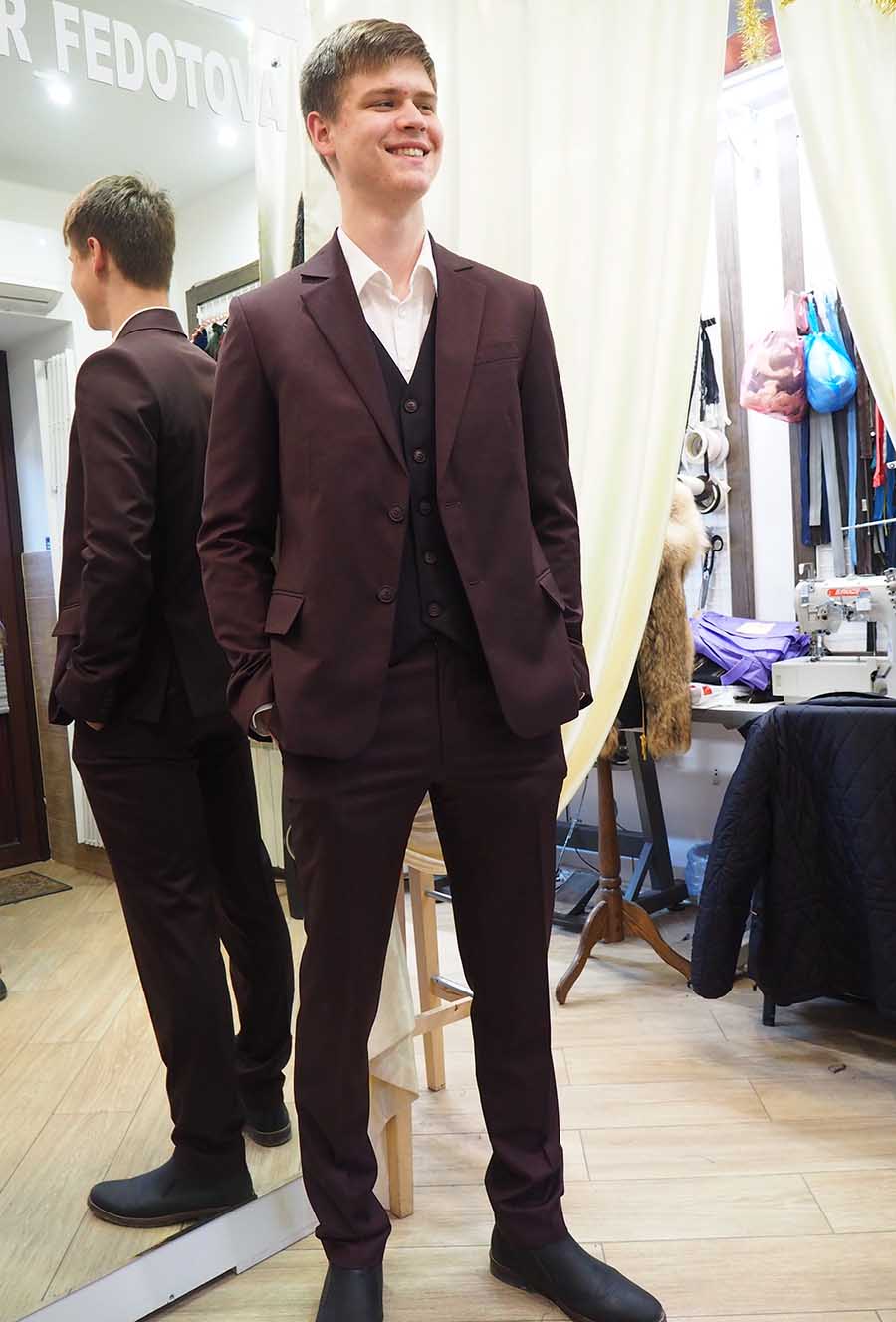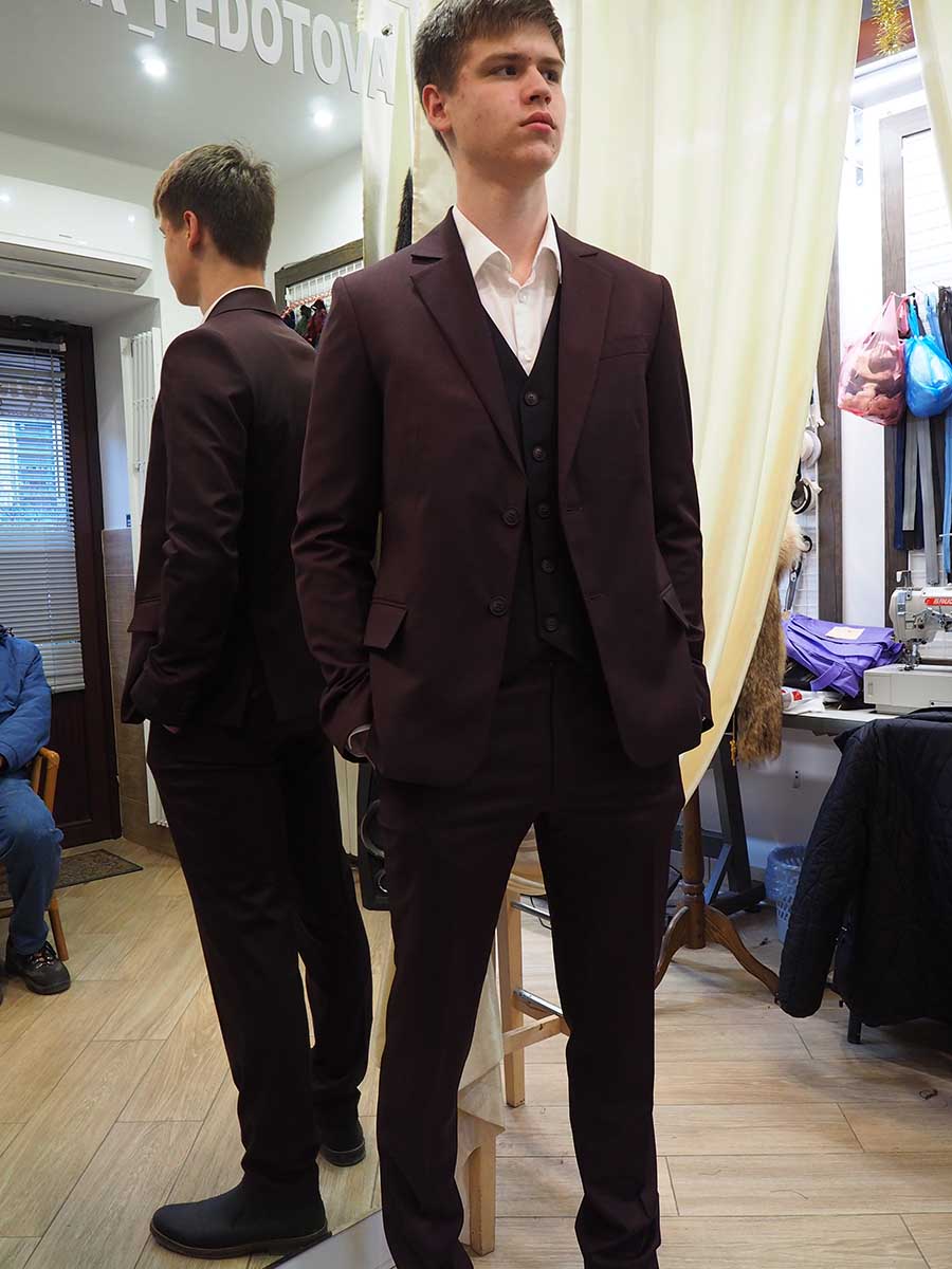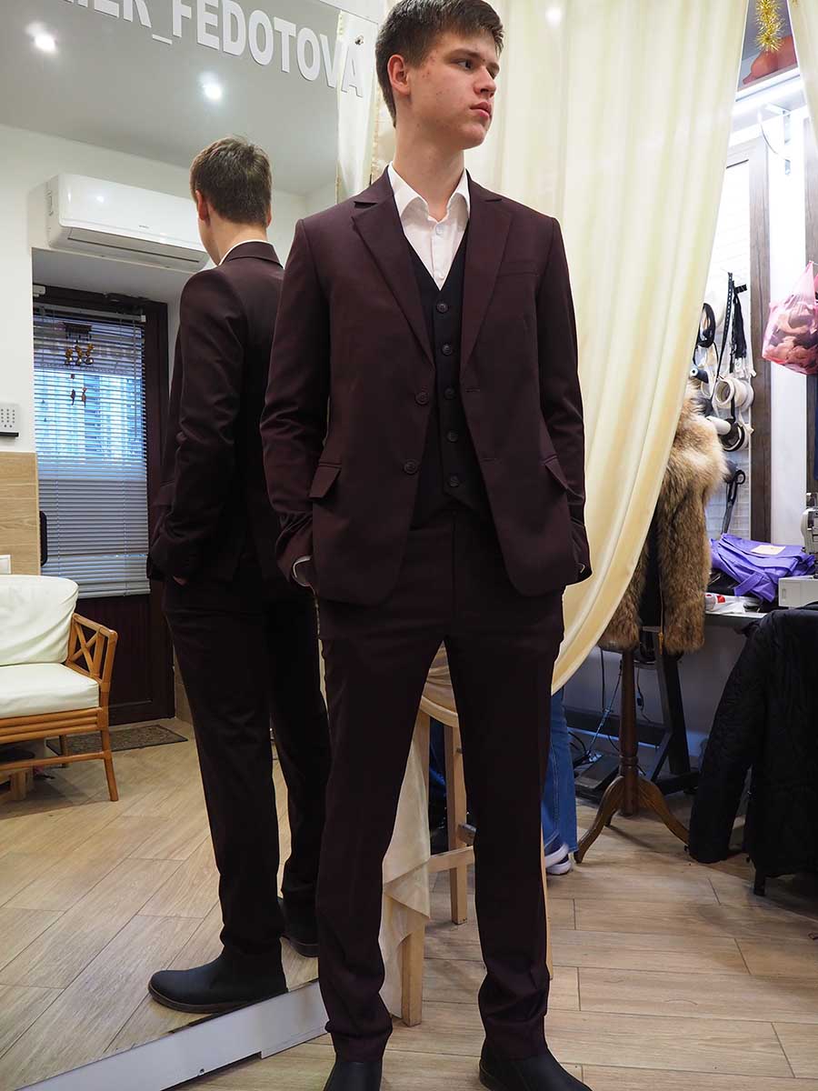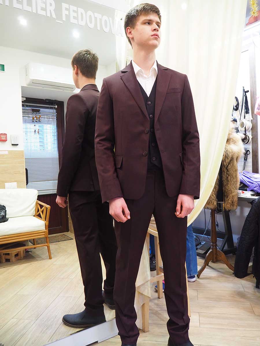 На этот раз наш мастер создал мужской костюм «тройку» классического покроя. Брюки слегка зауженные книзу, с двумя карманами по переду и двумя – сзади. Жилет на шелковой подкладке имеет по спинке декоративный хлястик и два кармана «листочка» спереди. Классический пиджак с английским воротником притален, имеет две шлицы. Рукава также со шлицами, двухшовные. По полочке два кармана «рамка» с клапанами, один нагрудный «листочка». Выполнен пиджак на шелковом подкладе.