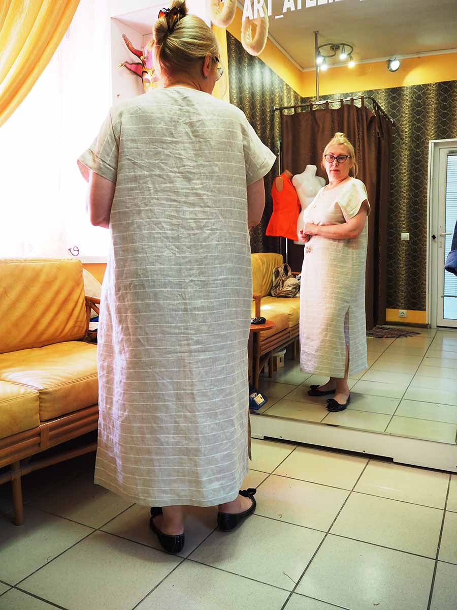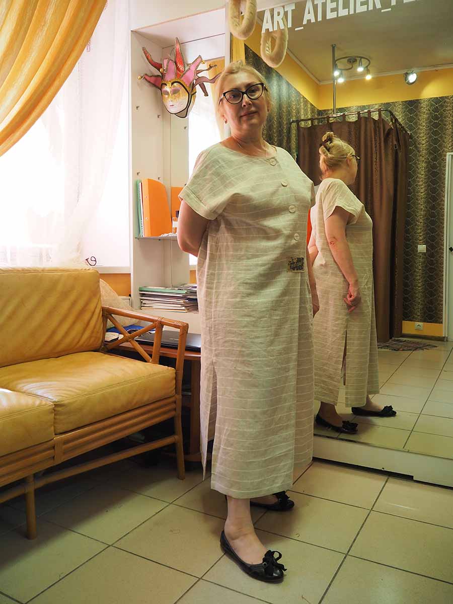 Например такое ЛЬНЯНОЕ платье прямого силуэта со спущенным коротким рукавом, который отделан манжетом. Спереди на полочке заложена складка, декорированная пуговицами. В боковых швах прямые разрезы, позволяющие ощутить необходимую прохладу