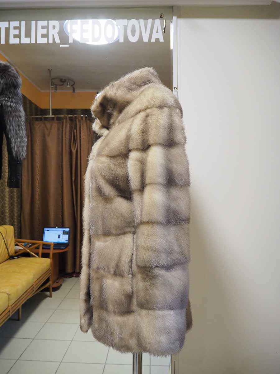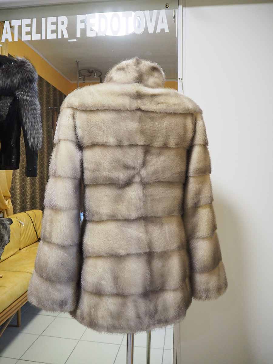 Норковое полупальто в поперечном направлении меха. Проведена работа по уменьшению изделия на 2 размера и подгонка по фигуре