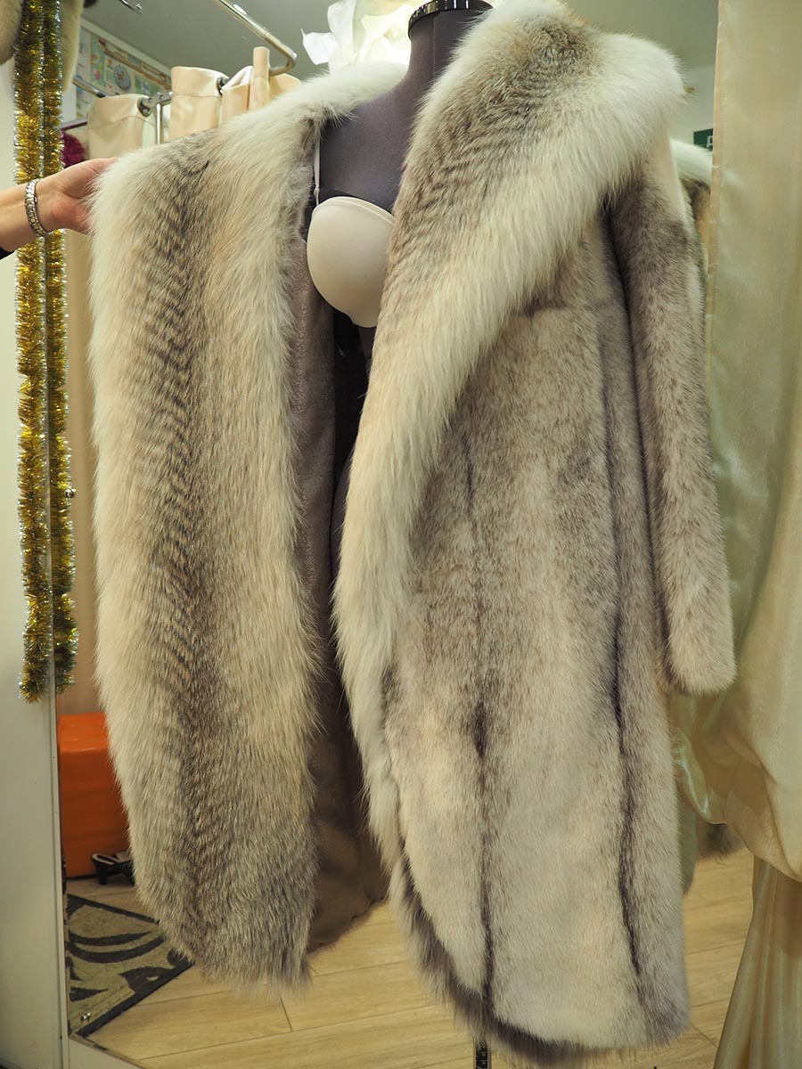 Получилось пальто прямого силуэта с втачным рукавом и внутренними карманами. Воротник – шаль, переходящий в подборт, выполнен из меха исландской лисы «Шедоу», с применением метода расшивки кожей для увеличения полезной площади шкурки. Надо заметить, что при использовании этой техники теплозащитные качества и вес материала не меняются.