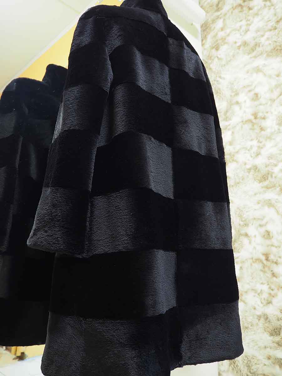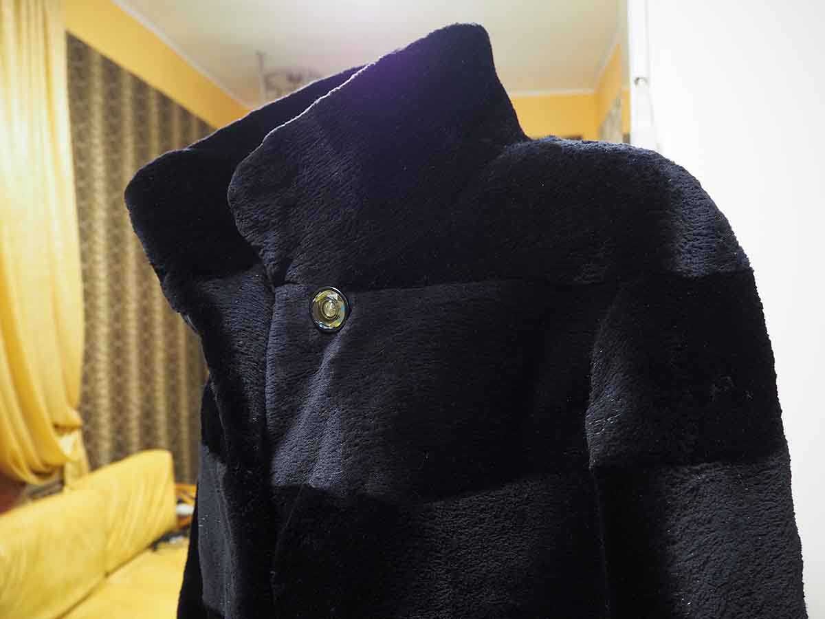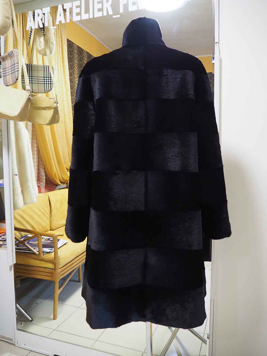 Меховое пальто из стриженого бобра черного цвета. Силуэт прямой, воротник стойка. При выполнении скорняжных работ применена техника раскладки пластин меха в противоположном направлении ворса, что обеспечивает эффект игры оттенков черного. Вещица очень теплая и надежно защитит от холода в самую суровую зиму. По носкости шуба рассчитана в среднем на 20 сезонов. Изделие изготовлено из меха заказчика