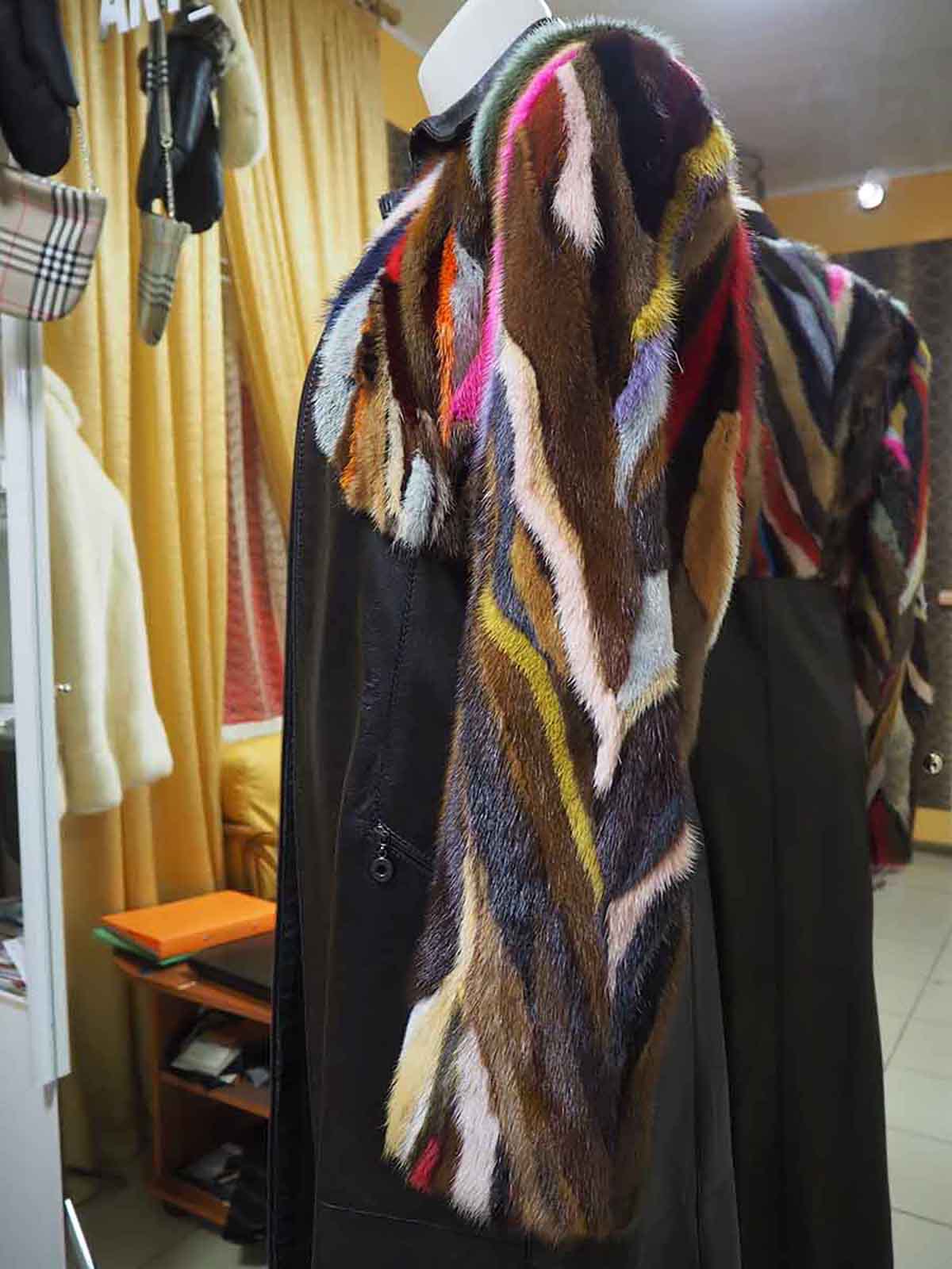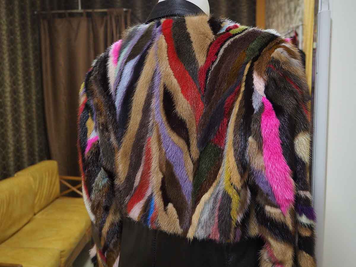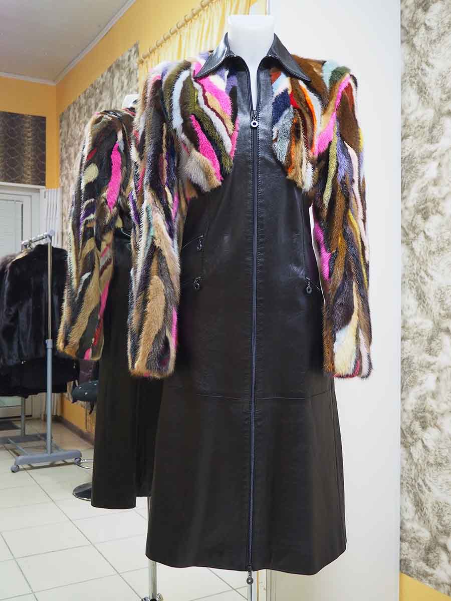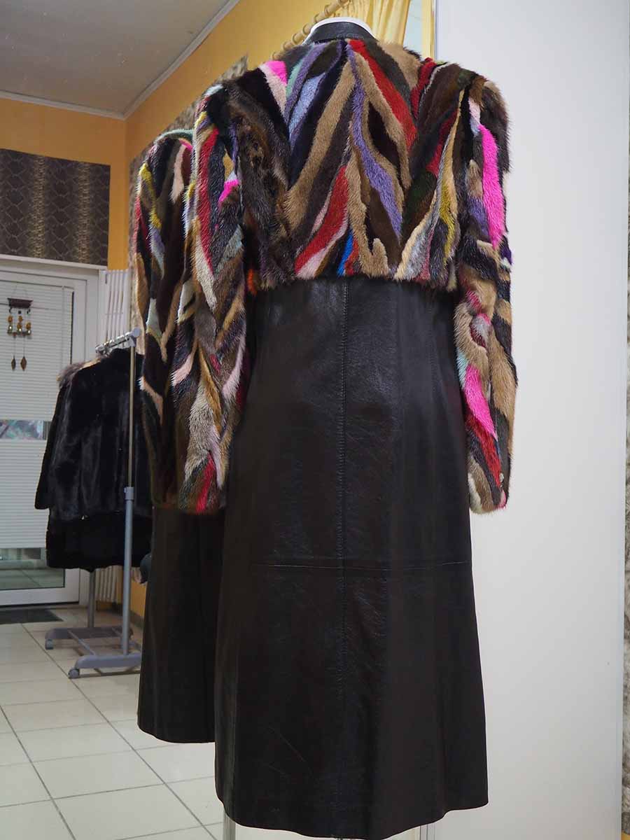 Пальто из натуральной кожи черного цвета на молнии приталенного силуэта, рукав втачной. Лиф изделия с рукавом изготовлены из кусочков меха норки разных цветов, которые собраны в стиле пэчворк