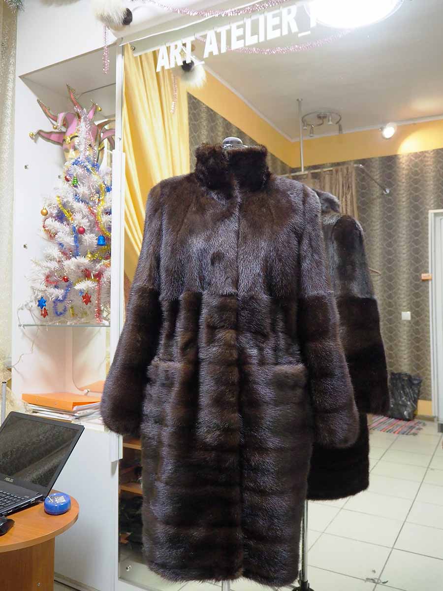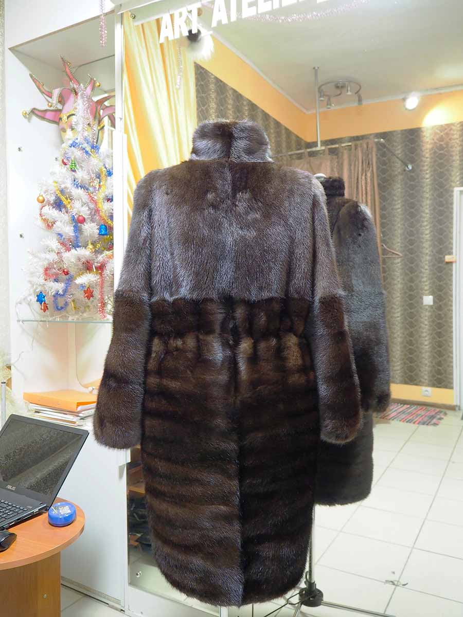 Меховое пальто из натуральной норки с карманами. Выполнен полный перекрой в комбинации продольного и поперечного направления ворса. Рукав полуреглан на резинке внизу, воротник стойка, по талии внутренняя кулиска. Продолжительность жизни мехового изделия всегда зависит от отношения к нему хозяина. Находясь в шкафу любая меховушка быстро портится и теряет форму Не позволяйте этому случится, изменив фасон, вы увидите свою вещь в другом свете и с удовольствием будете ее носить зимой при любой погоде.