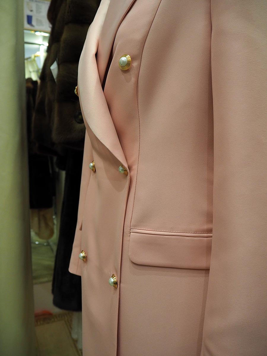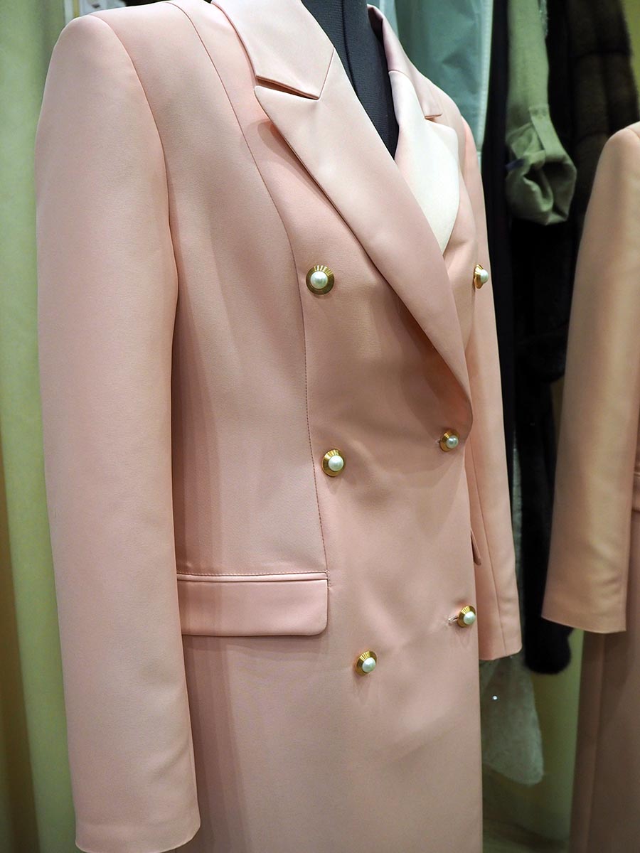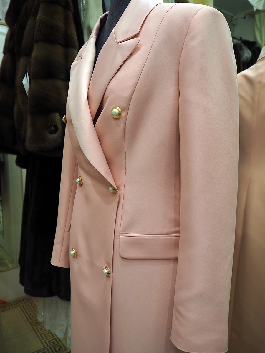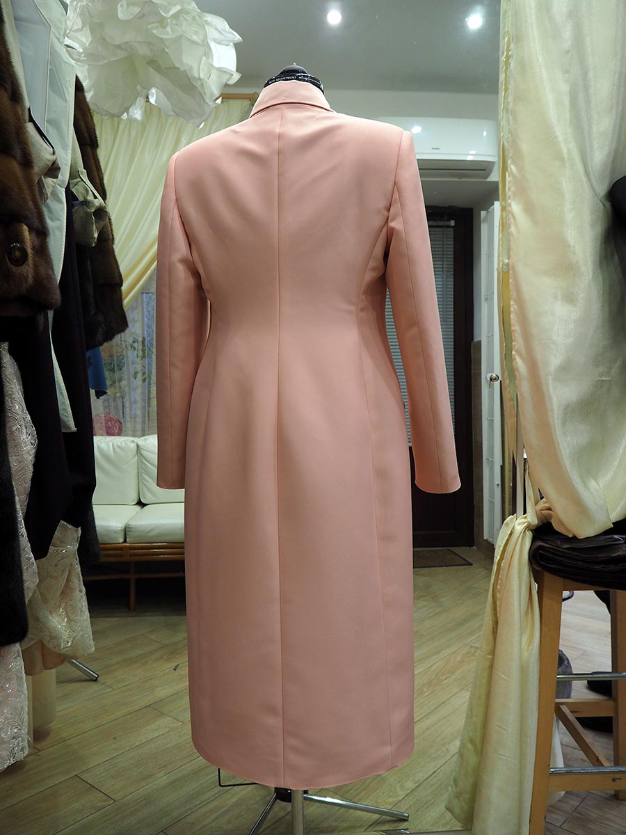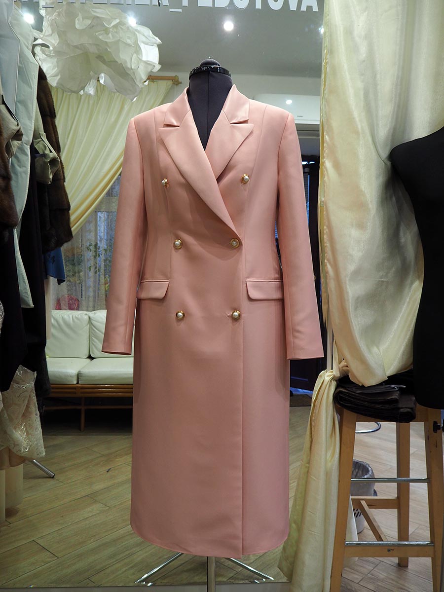 Платье-пиджак приталенного силуэта с английским воротником. Изготовлены два боковых кармана с клапанами, рукав втачной бесшовный, двубортная застежка на пуговицах.