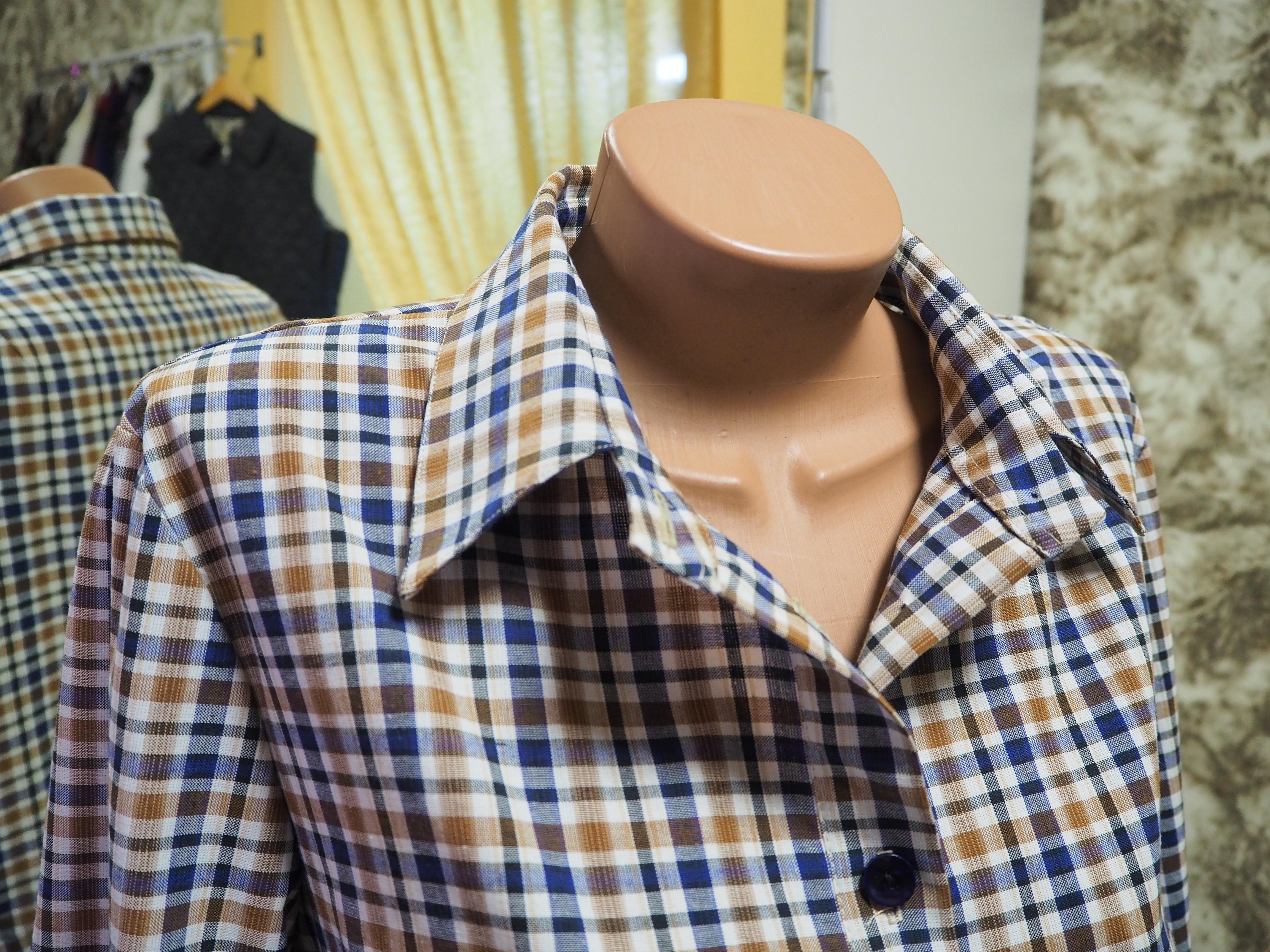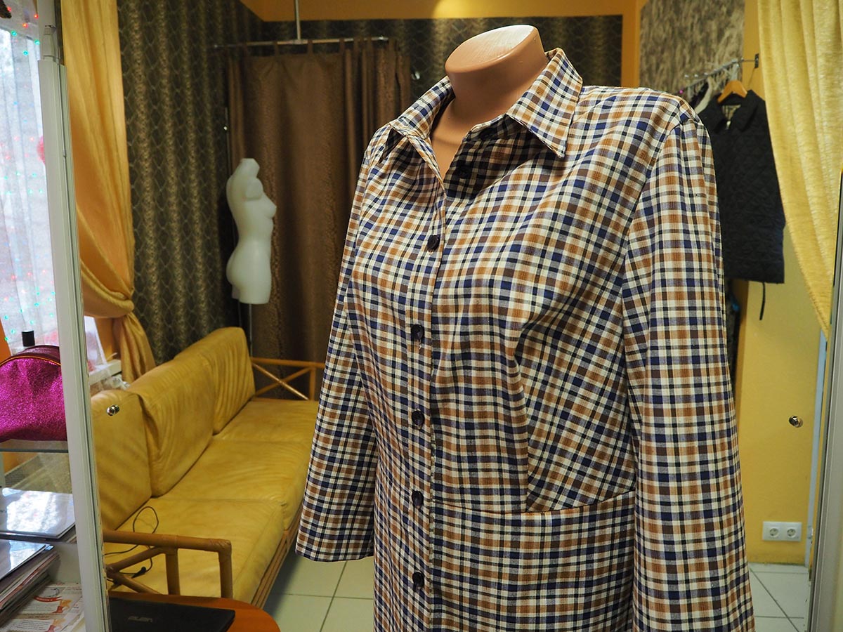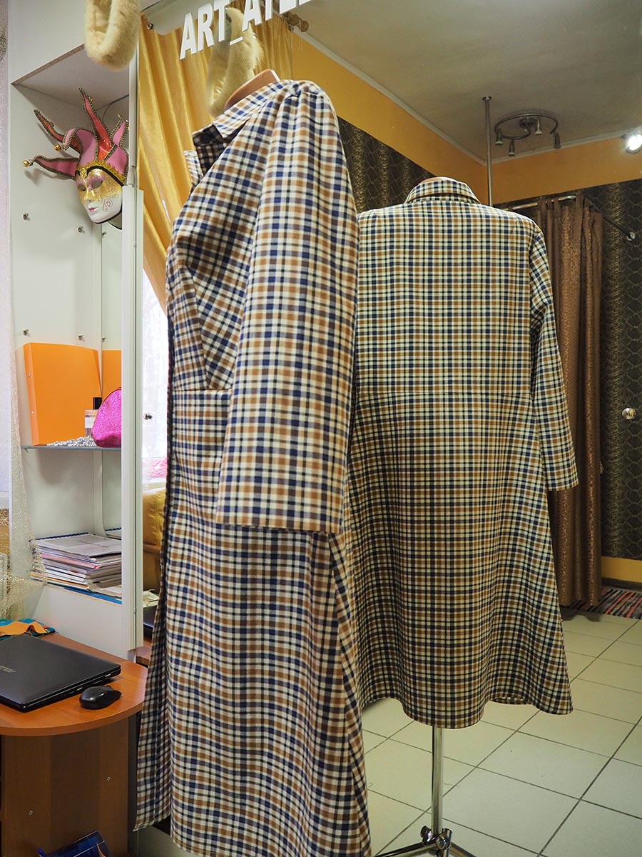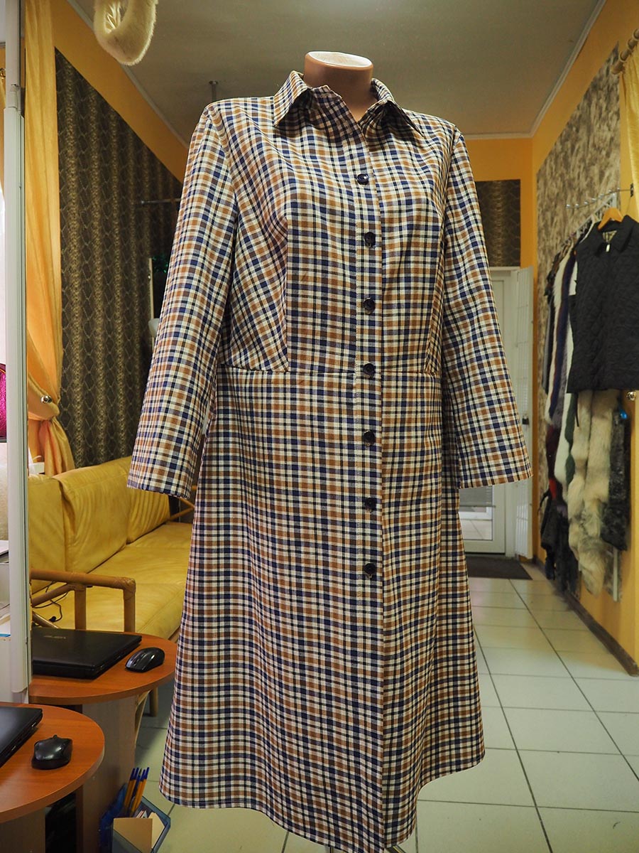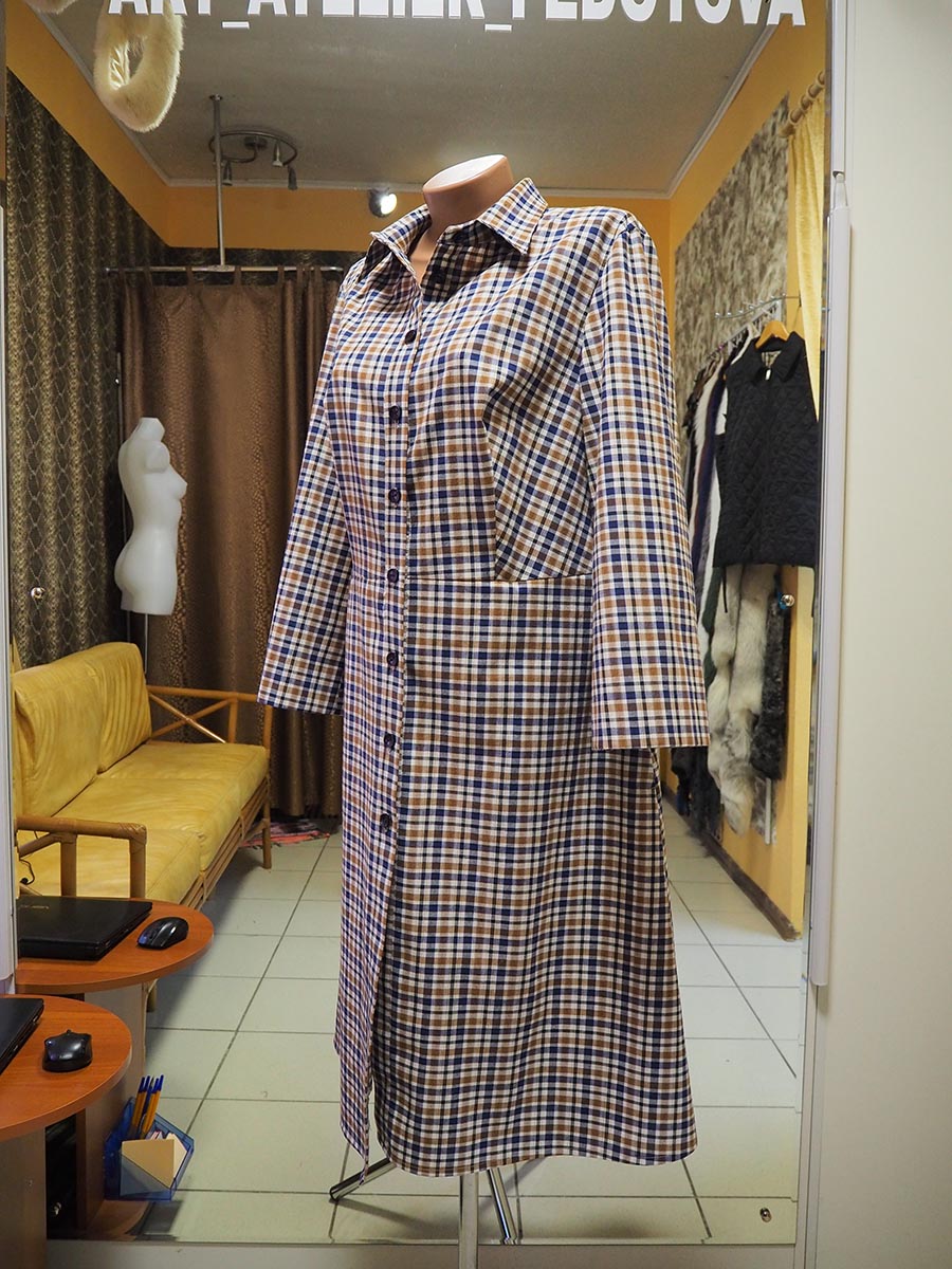 Платье – халат полуприлегающего силуэта отрезное по талии с расклешением к низу. Застежка в виде планки на пуговицах Воротник отложной на стойке. Рукав втачной, расклешенный к низу Выполнено из 100%-го хлопка.