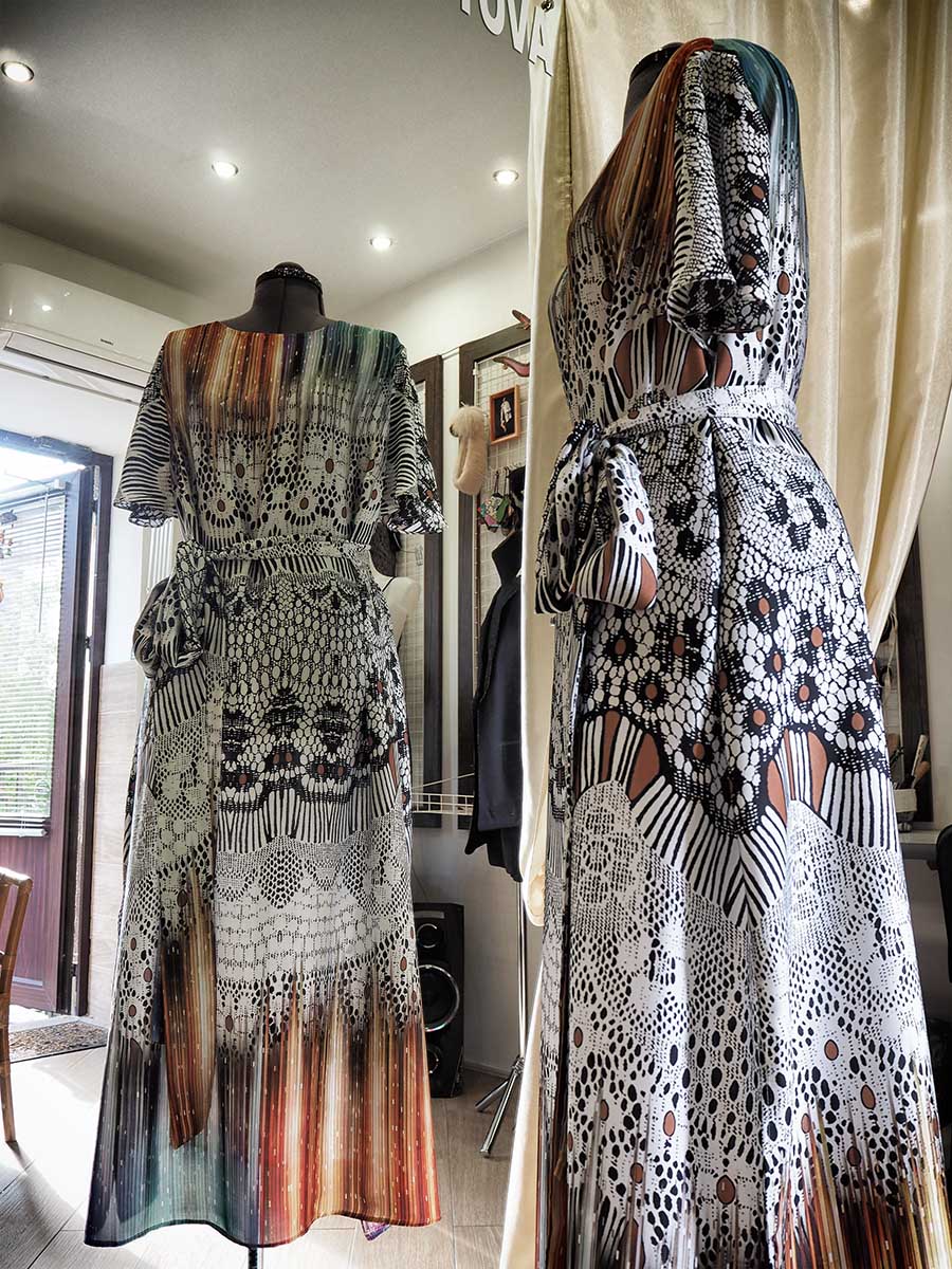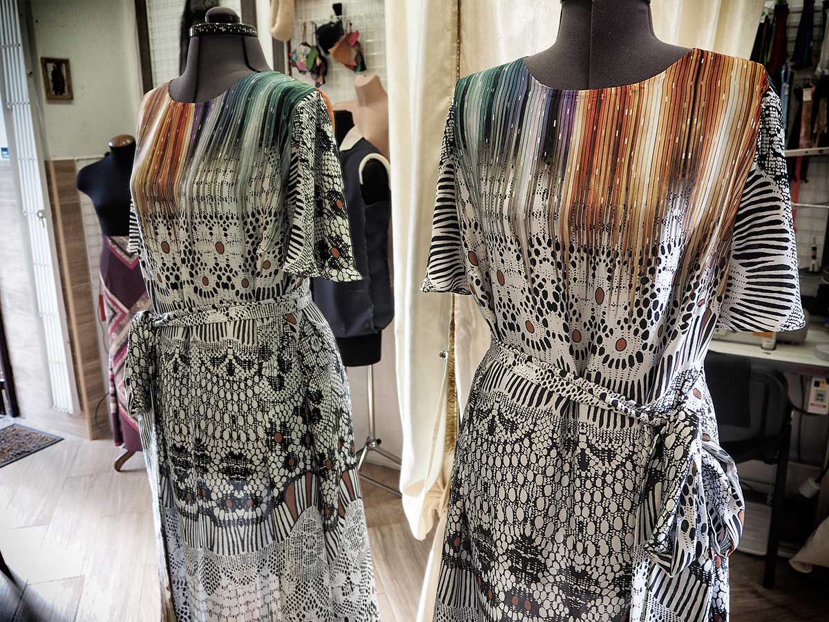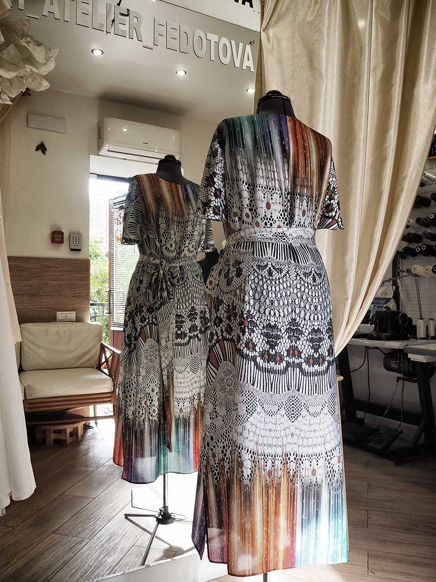 Создание летнего платья из тонкой летящей ткани требует от мастера особой квалификации, особенно если эта ткань натуральный шелк. Деликатность данного материала проявляется во всем, начиная с раскроя, правильного выбора строчек и заканчивая уходом за готовым изделием. Работа над этим платьем дополнительно усложнилась оригинальным рисунком, в котором необходимо было соединить его элементы.