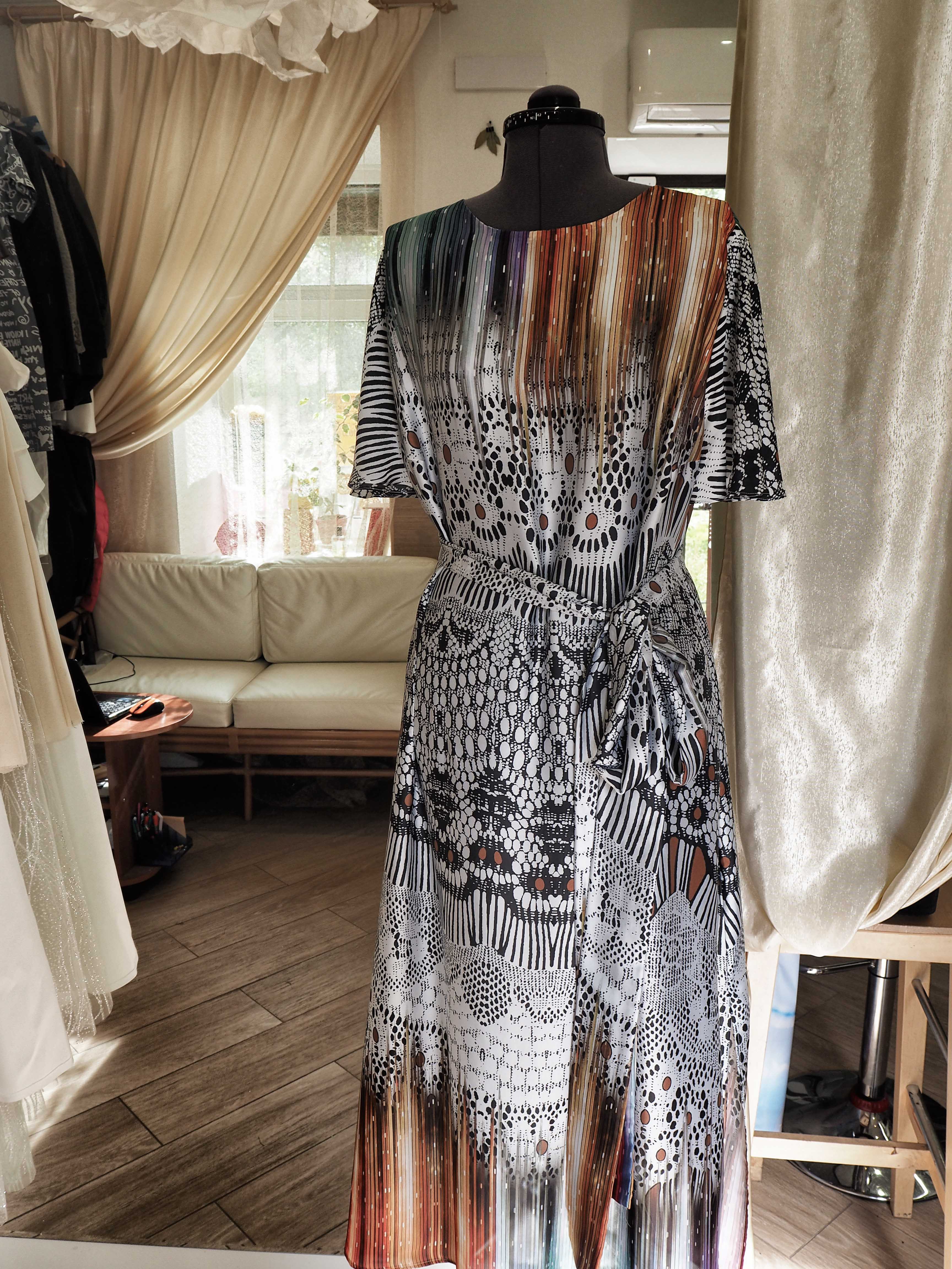 После согласования фасона выполнено платье прямого силуэта с коротким рукавом, можно носить с поясом и без него. Для свободы движений изготовлены боковые разрезы. По полочке две встречные складки, переходящие в выточки. В результате заказчица получила красивый предмет одежды с великолепной терморегуляцией. Практичность гарантирована прочностью шелковой нити.