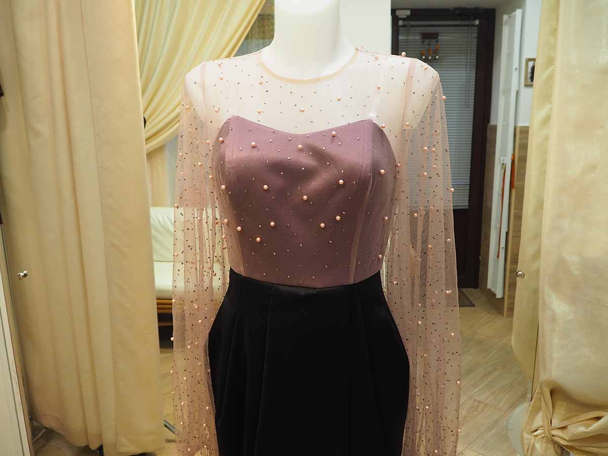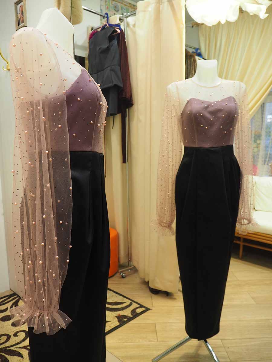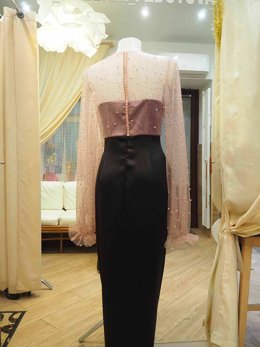 На этот раз перед вами платье облегающего силуэта, отрезное по линии талии. Лиф состоит из корсетной части и блузы. Блуза сделана из сетки, украшенной стразами и перламутровыми бусинами. Рукав втачной, расклешенный, по низу сборка с напуском. Застежка – пуговицы по спинке, которая обработана навесными петлями. Юбка с запахом, на переднем полотнище изготовлены мягкие ассиметричные складки. Выполнено изделие на подкладке из натурального шелка.