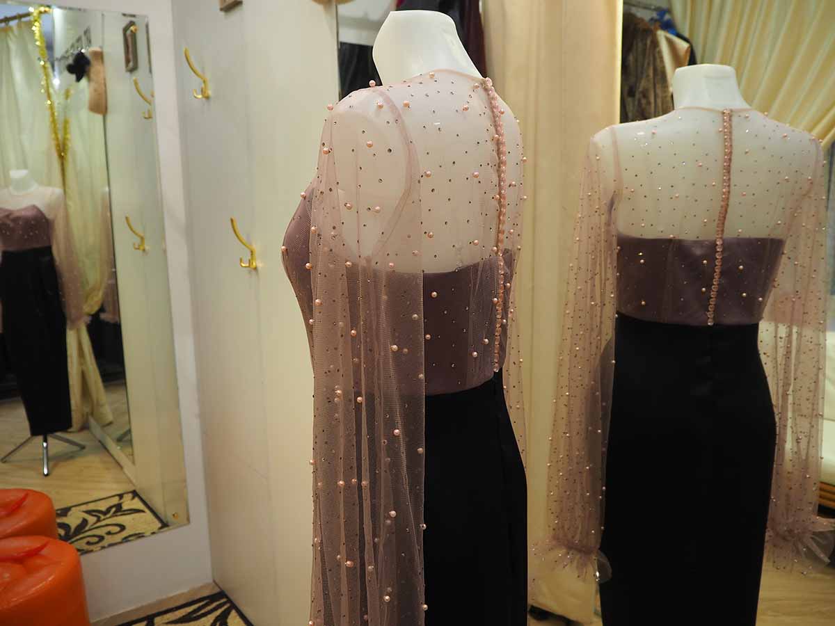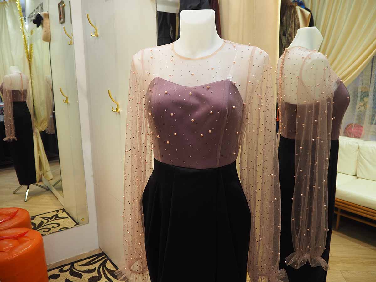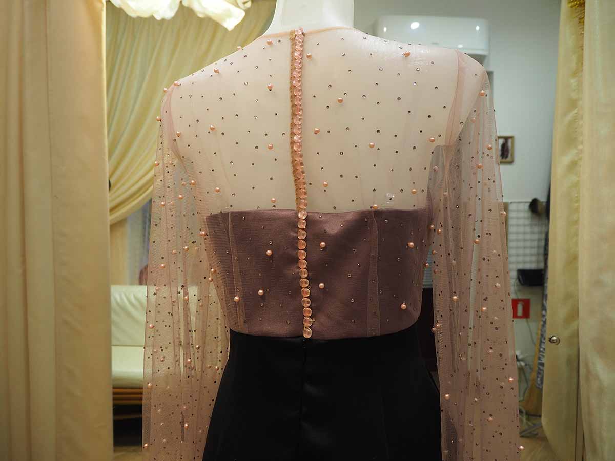 На этот раз перед вами платье облегающего силуэта, отрезное по линии талии. Лиф состоит из корсетной части и блузы. Блуза сделана из сетки, украшенной стразами и перламутровыми бусинами. Рукав втачной, расклешенный, по низу сборка с напуском. Застежка – пуговицы по спинке, которая обработана навесными петлями. Юбка с запахом, на переднем полотнище изготовлены мягкие ассиметричные складки. Выполнено изделие на подкладке из натурального шелка.