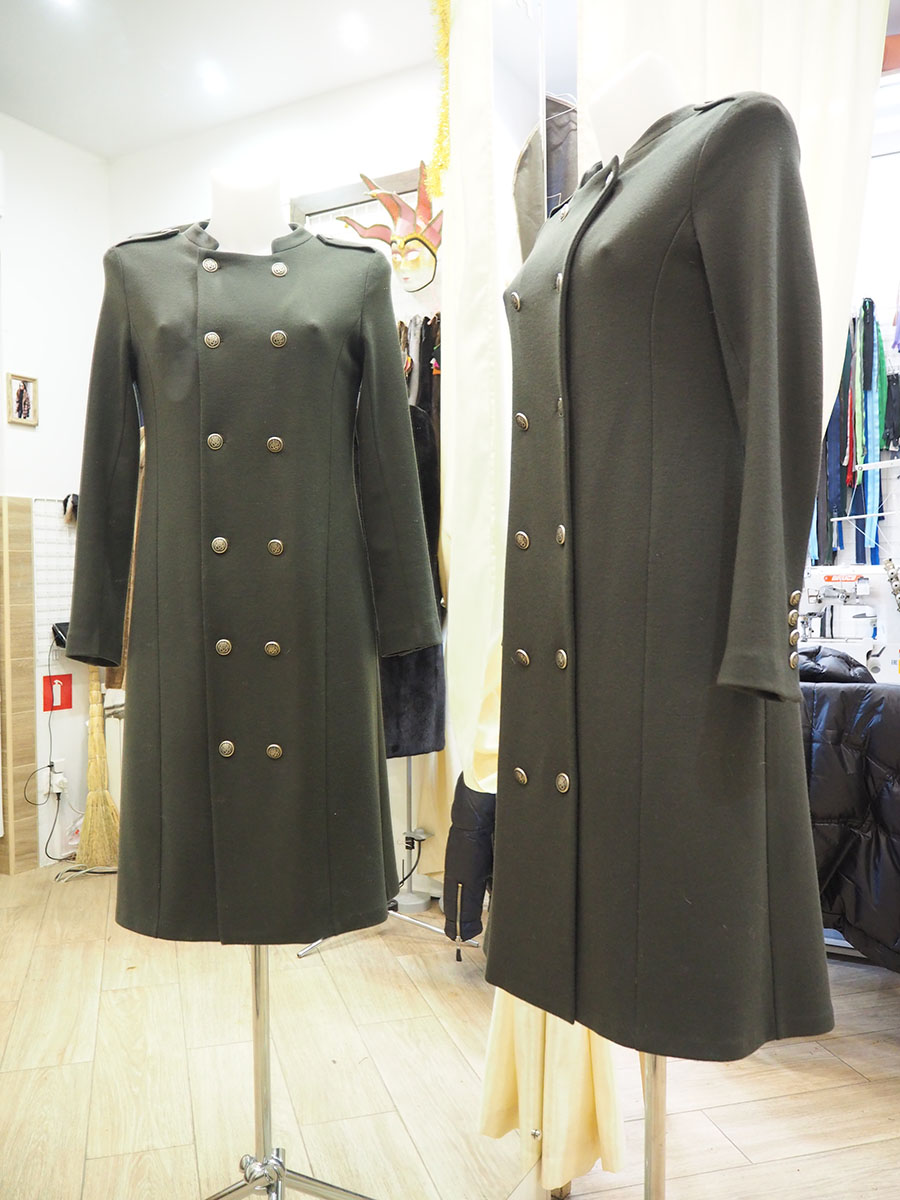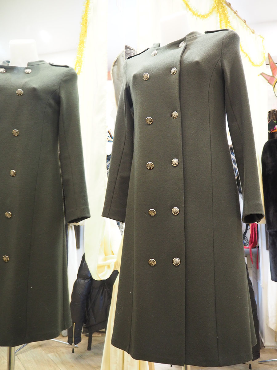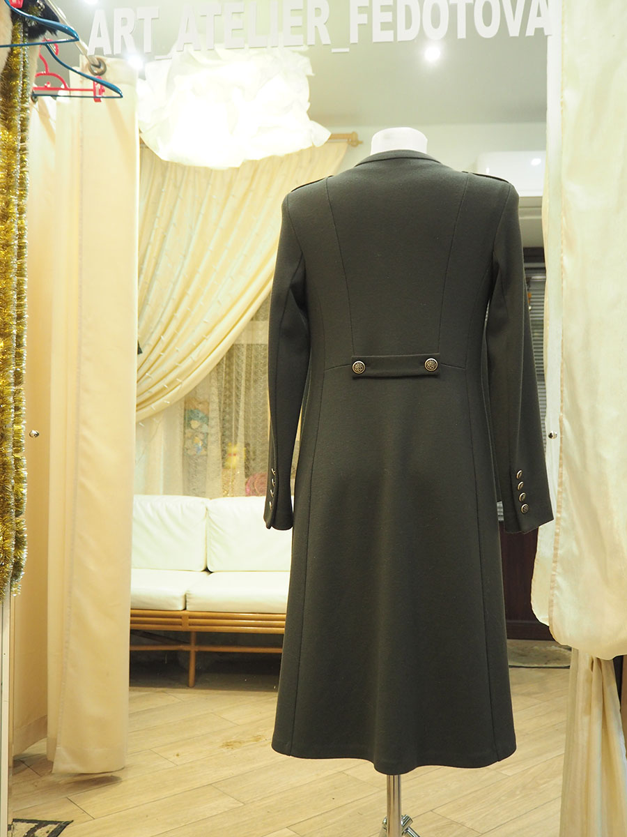 Двубортное платье прилегающего силуэта с легким расклешением по низу. Воротник стойка, погоны по плечевому шву и декоративный хлястик на спинке заявляют о том, что для изделия выбран фасон «милитари». Образ дополняют рельефы, изготовленные по полочке и частично отрезной спинке. Втачной двухшовный классический рукав придает строгости. Качественная фурнитура подчеркивает уникальность модели.