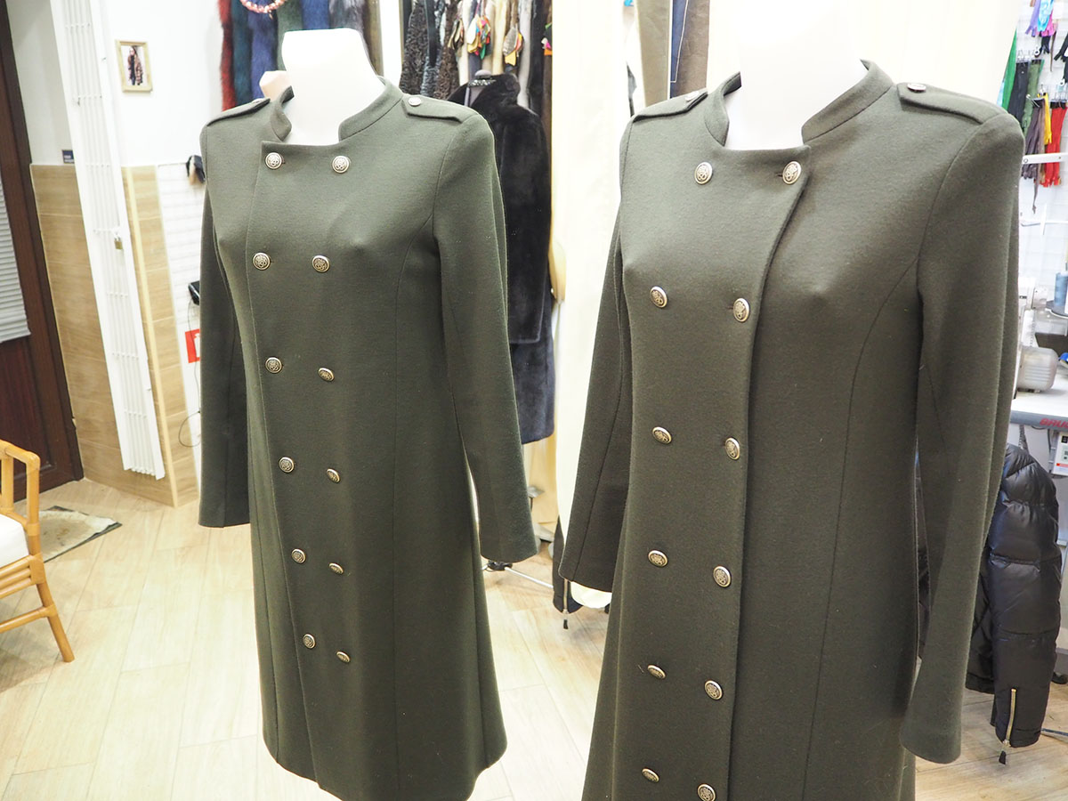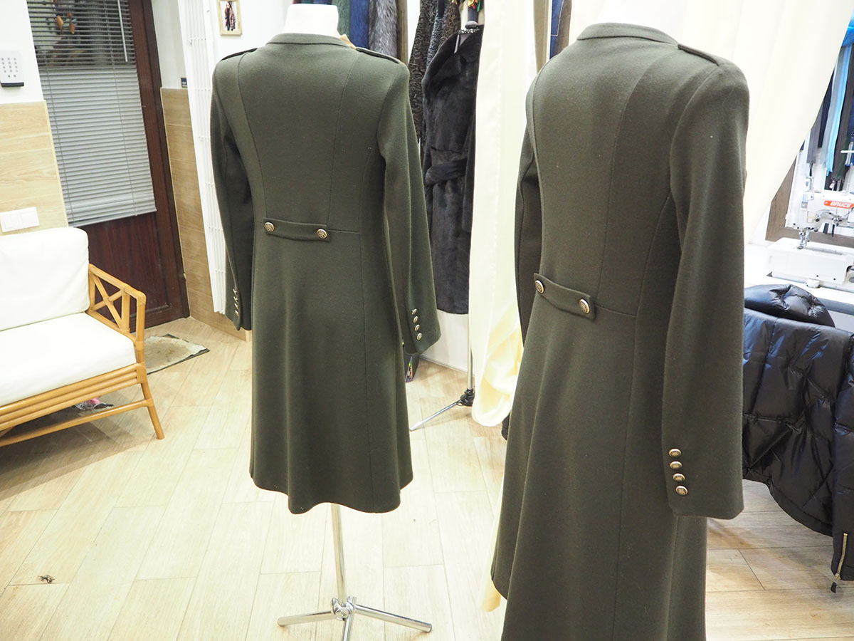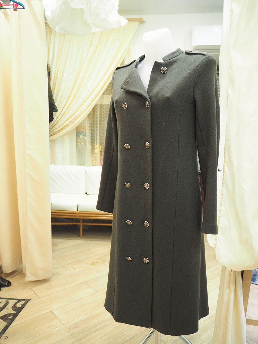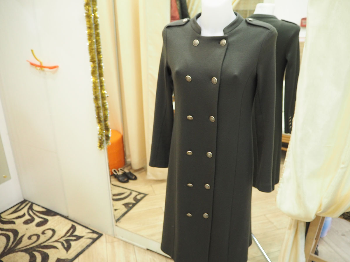 Двубортное платье прилегающего силуэта с легким расклешением по низу. Воротник стойка, погоны по плечевому шву и декоративный хлястик на спинке заявляют о том, что для изделия выбран фасон «милитари». Образ дополняют рельефы, изготовленные по полочке и частично отрезной спинке. Втачной двухшовный классический рукав придает строгости. Качественная фурнитура подчеркивает уникальность модели.