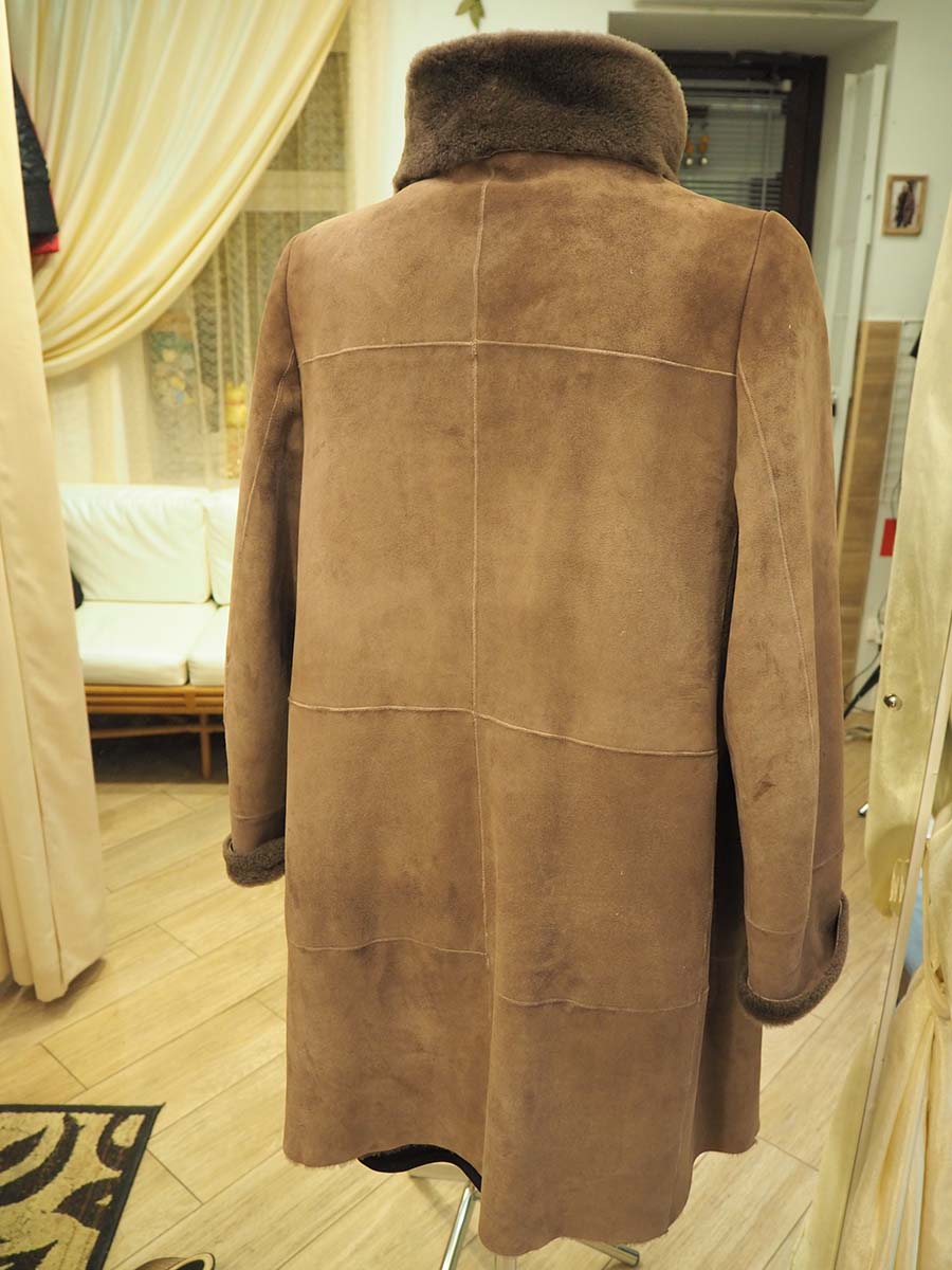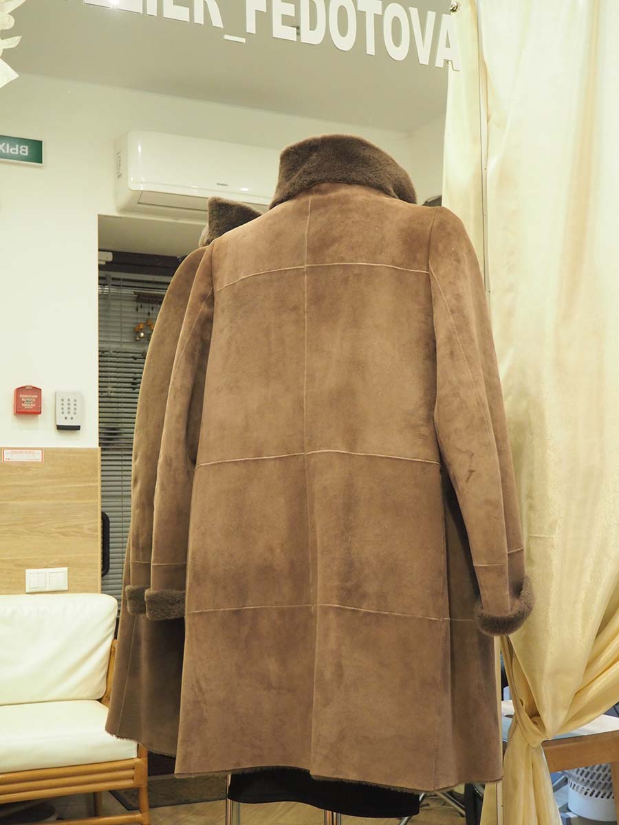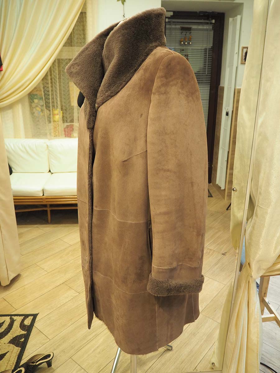 Изделие приталено по спинке, уменьшена длина плеч и расширен рукав. Дубленка была существенно мала в груди, но так как фасон имеет вид трапеции, у мастера оставалась возможность расширить эту зону путем изготовления дополнительных вытачек и подъема конструкции наверх, в результате чего еще и карманы встали на свое место. Осталось перепосадить воротник и ….