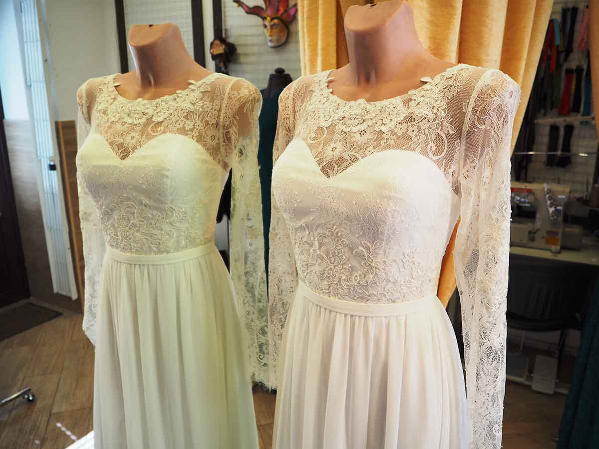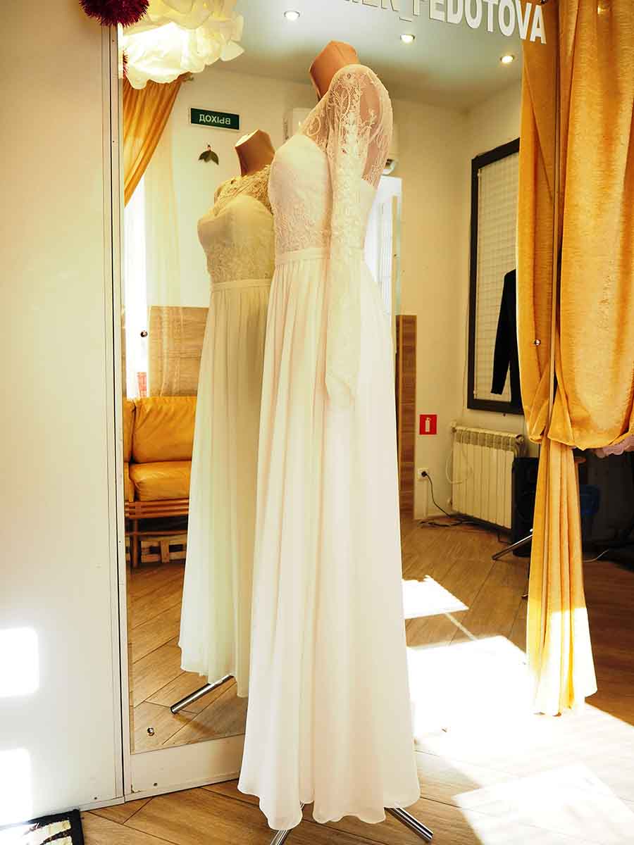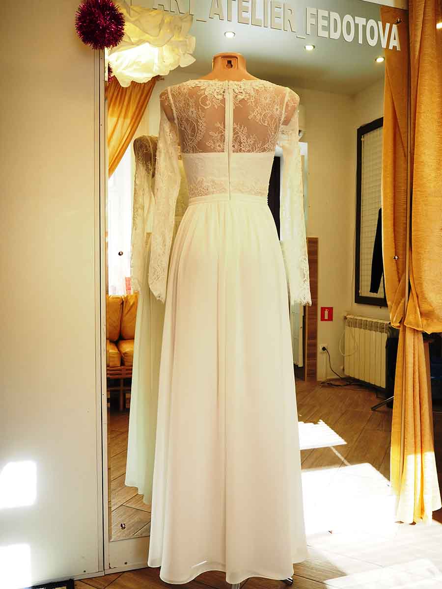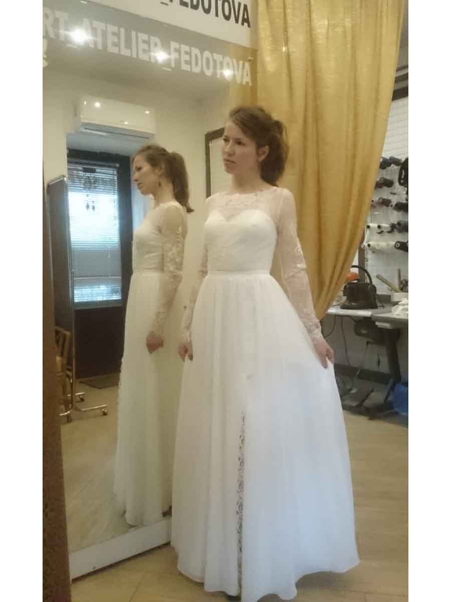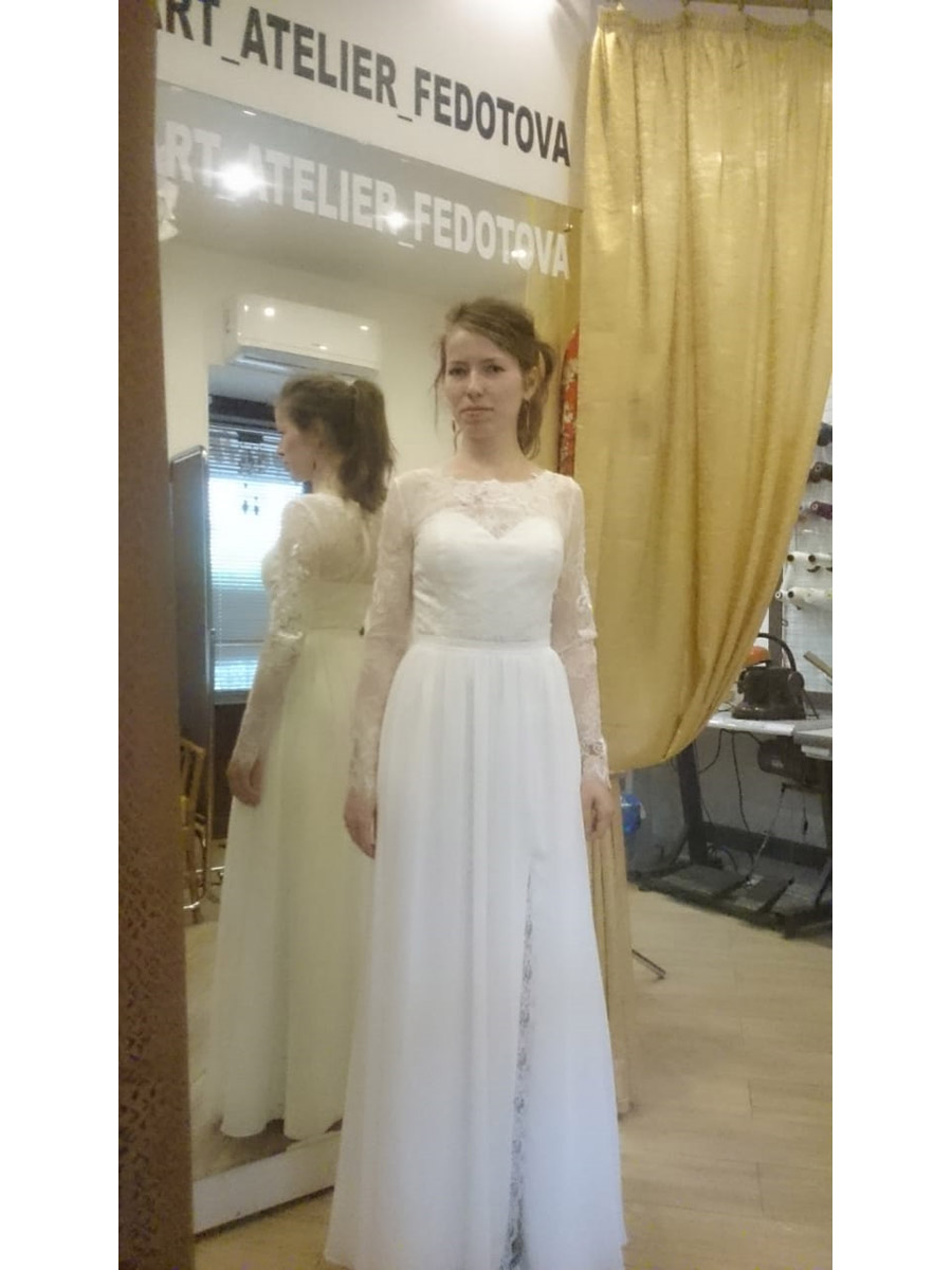 Нашим мастером выполнена подгонка по фигуре свадебного платья прилегающего силуэта. Лиф изделия кружевной с вырезом лодочкой и втачным рукавом. Юбочка из шифона с разрезом, декорированная гипюром. По спинке застежка потайной молнией