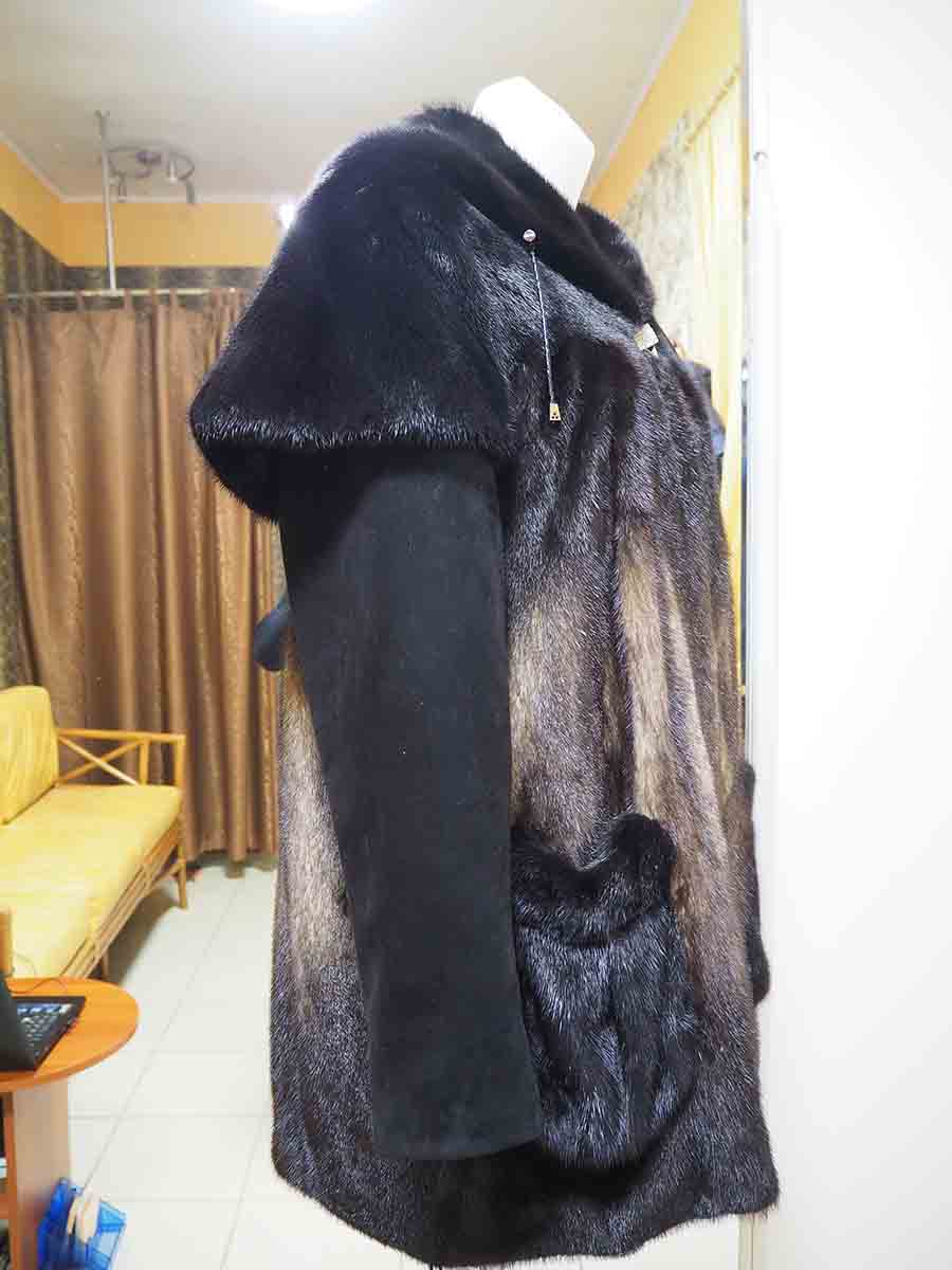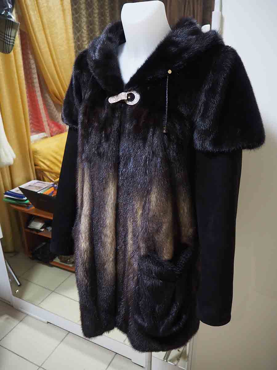 Этот полушубок получился в результате присоединения к норковому жилету рукавов из натуральной замши черного цвета. Таким образом любимую вещицу стало возможно носить даже в морозную погоду