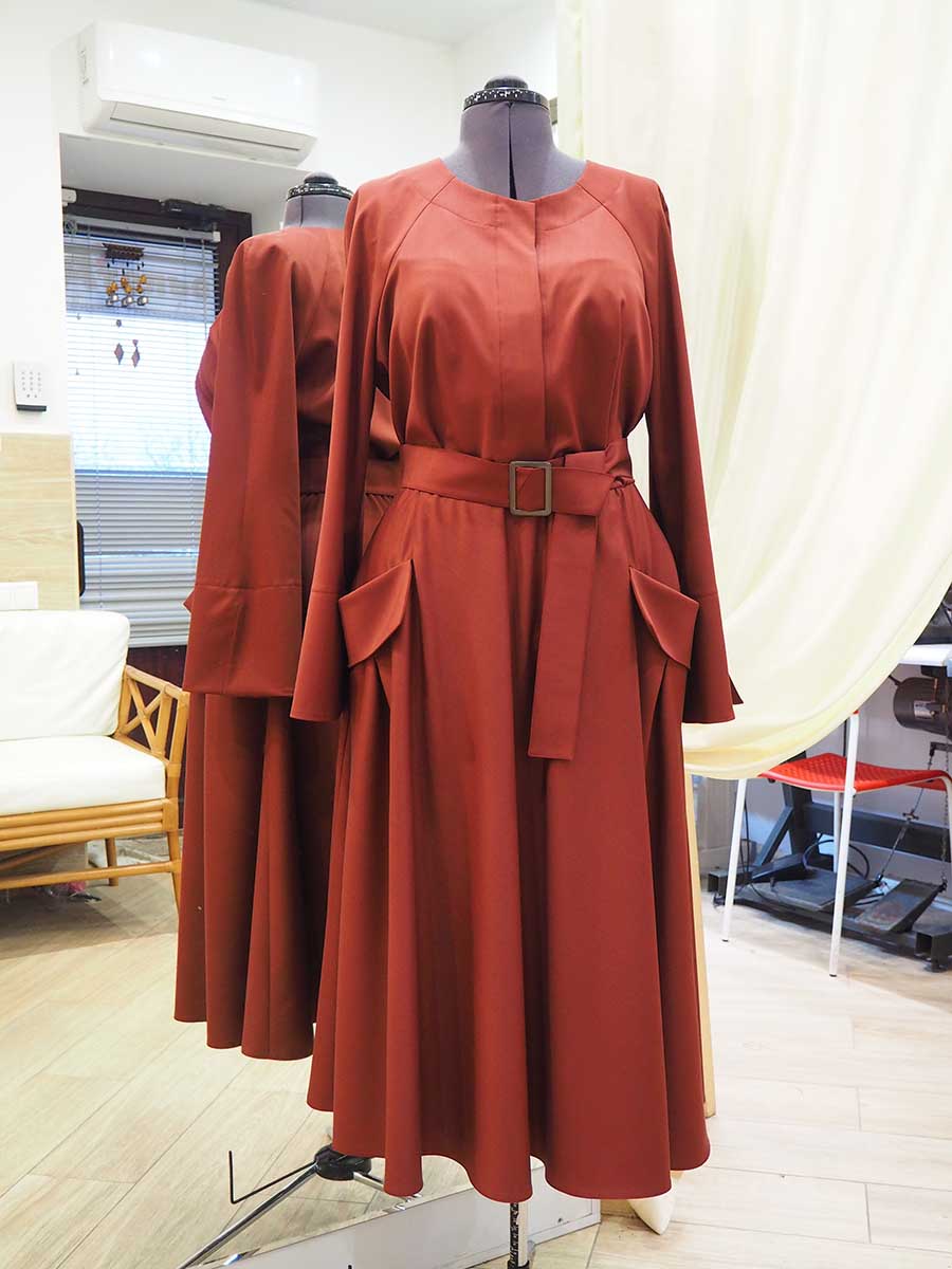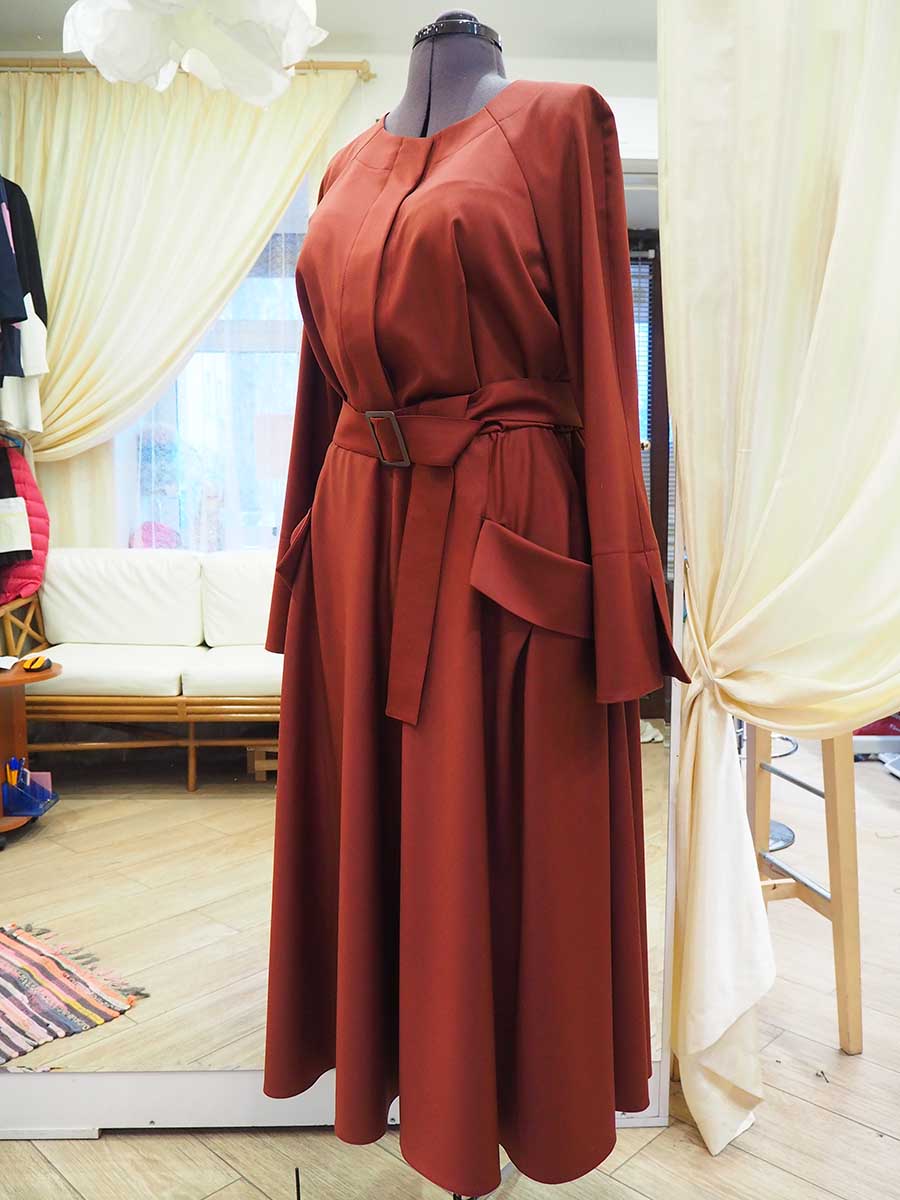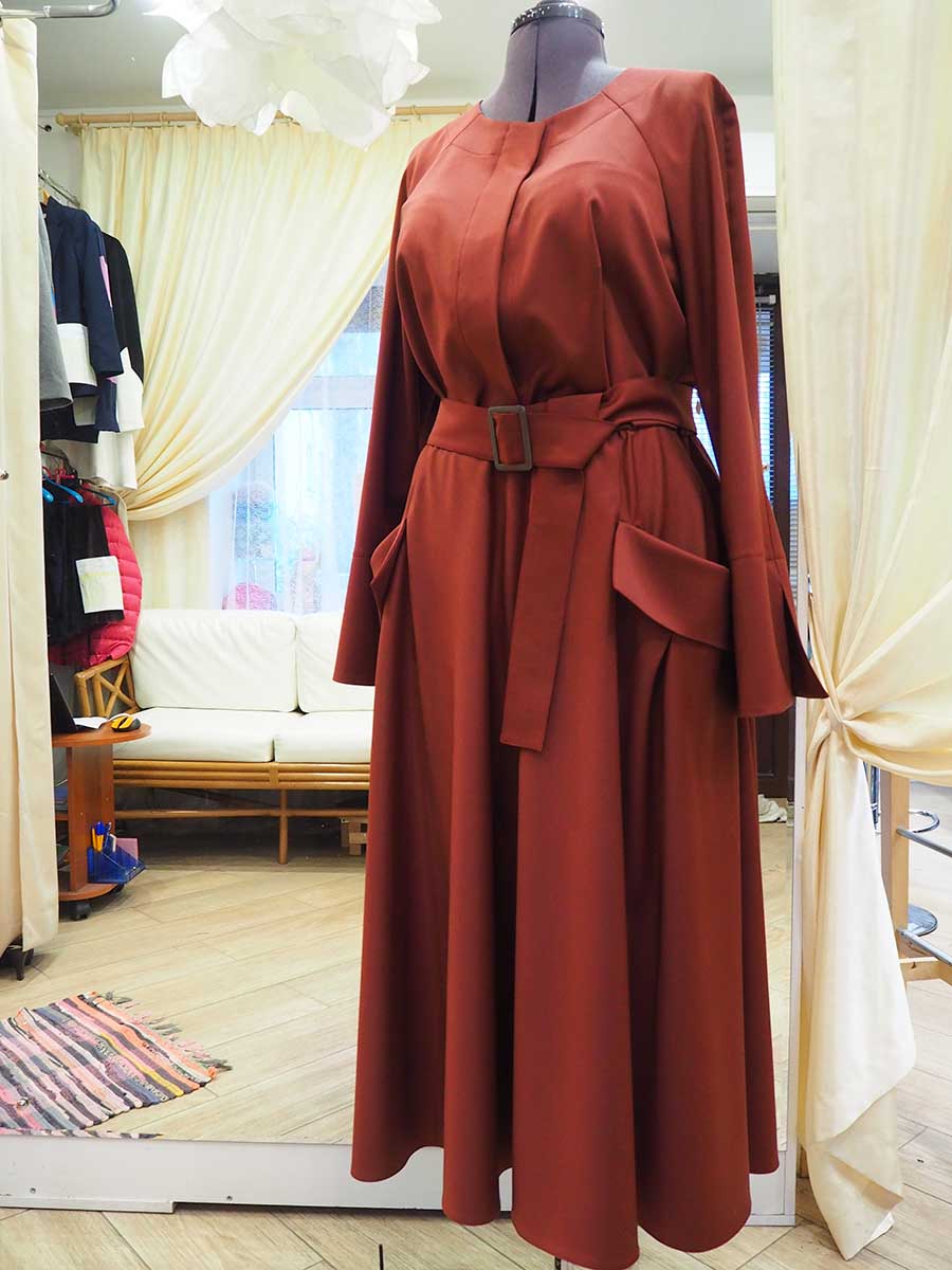 Предлагаем вашему вниманию готовое изделие. Платье отрезное по талии, юбка покроена по косой. Изготовлены прорезные карманы с объемными клапанами. Рукав реглан, расклешенный книзу, с разрезами. Полочка на супатной застежке. Вырез горловины круглый, обработан обтачкой с отделочной строчкой. Линия талии оформлена съемным поясом на пряжке.