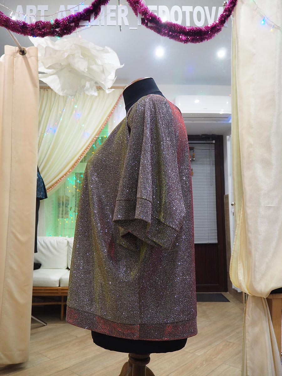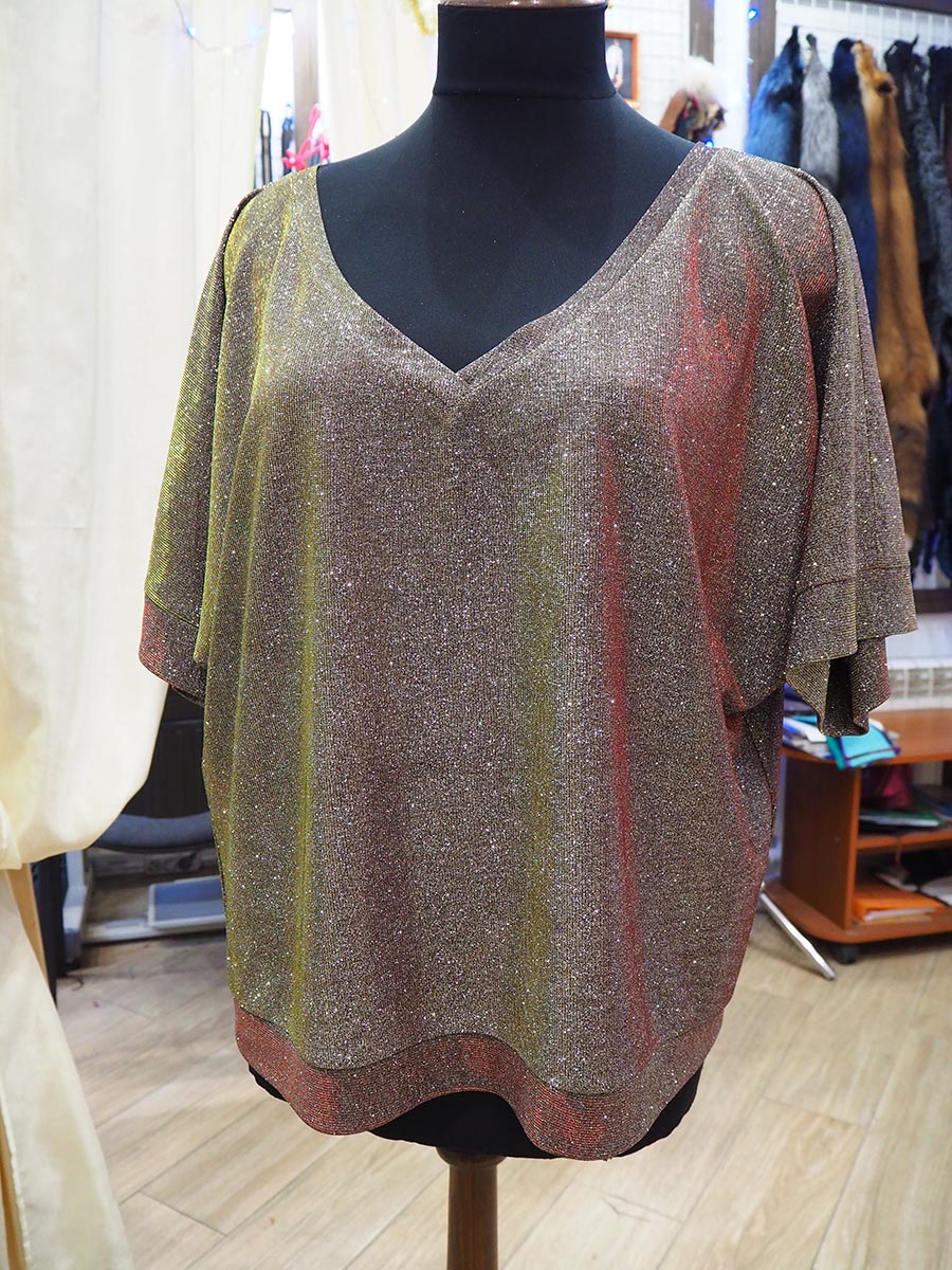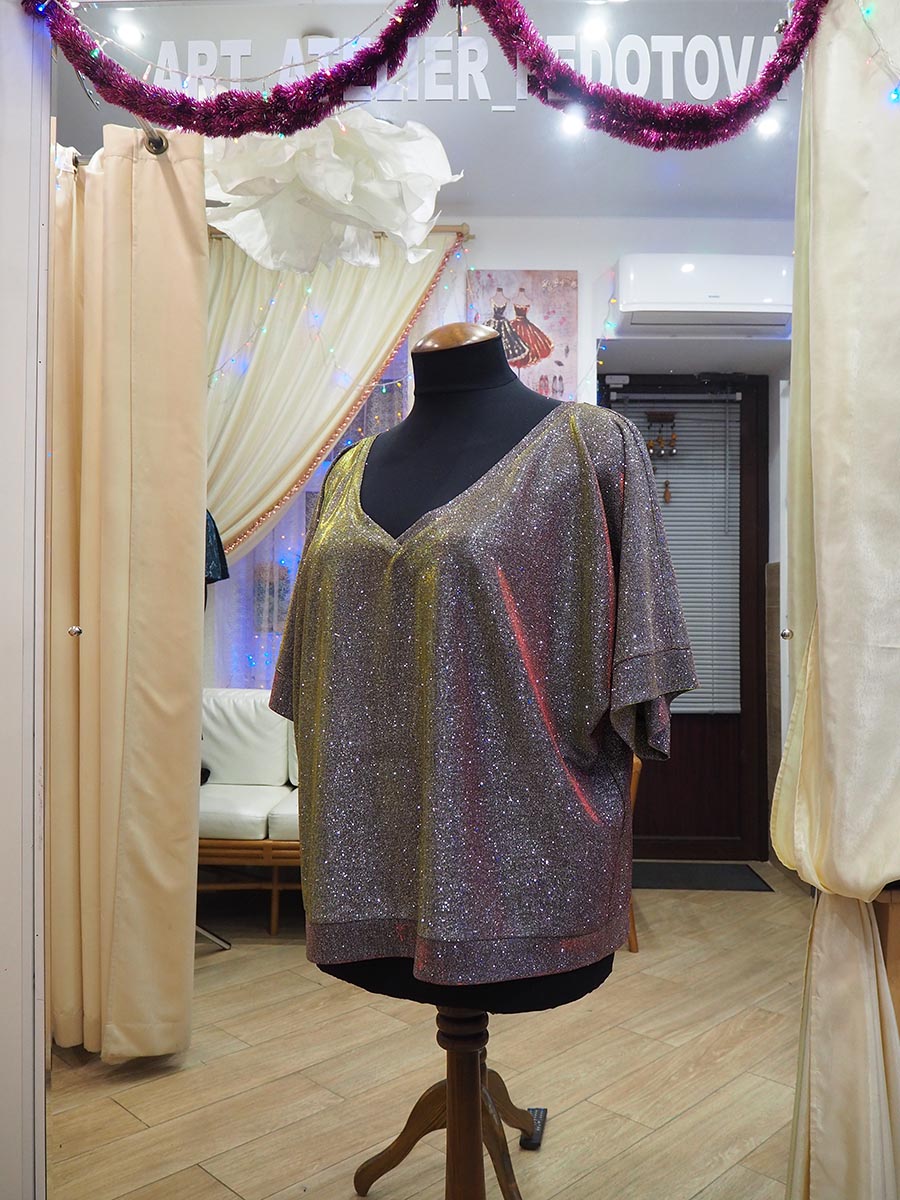 Выполнена из трикотажного полотна с люрексом. Цельнокройный рукав три четверти с манжетом на удлинение. Глубокий V-образный вырез обработан планкой. По низу изделия изготовлен манжет.
