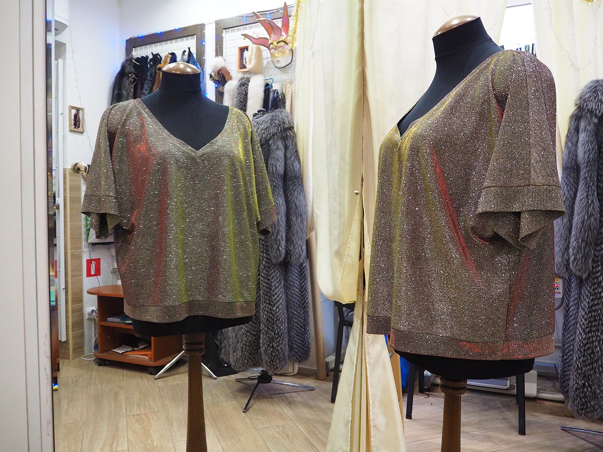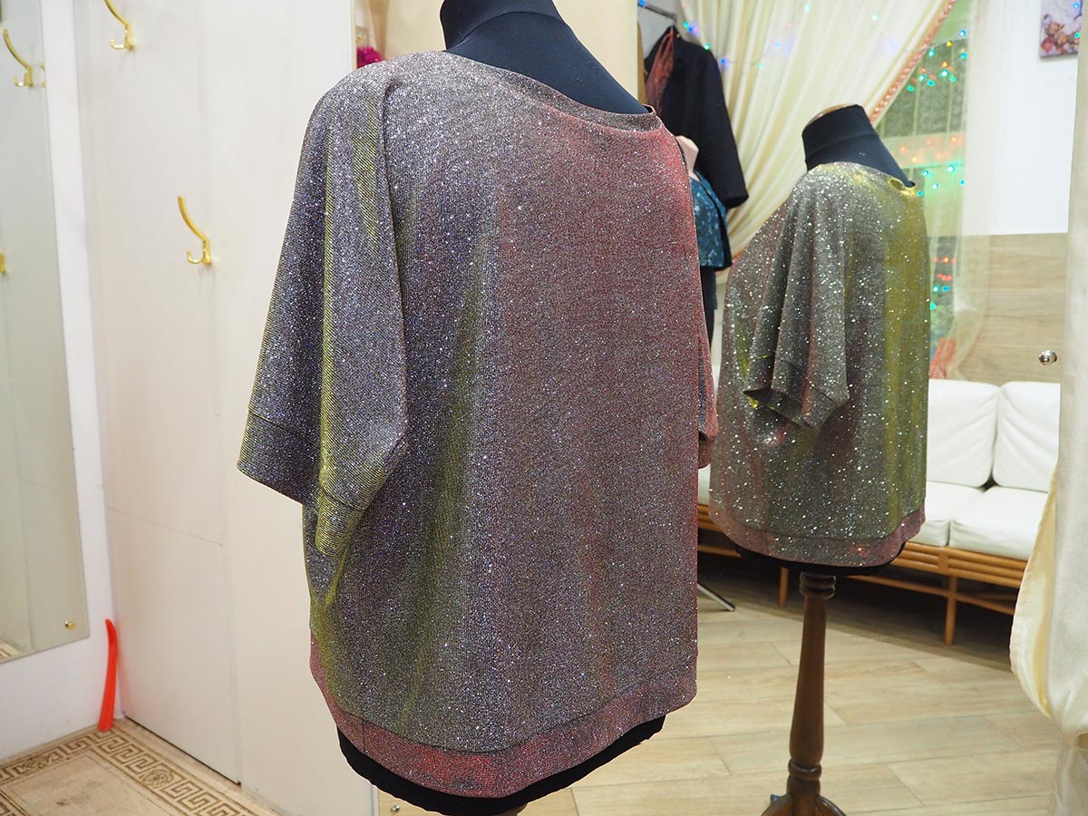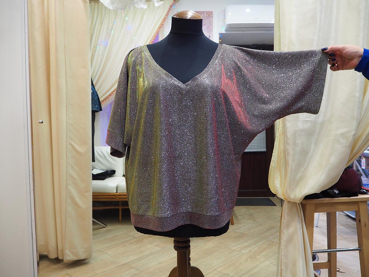 Выполнена из трикотажного полотна с люрексом. Цельнокройный рукав три четверти с манжетом на удлинение. Глубокий V-образный вырез обработан планкой. По низу изделия изготовлен манжет.