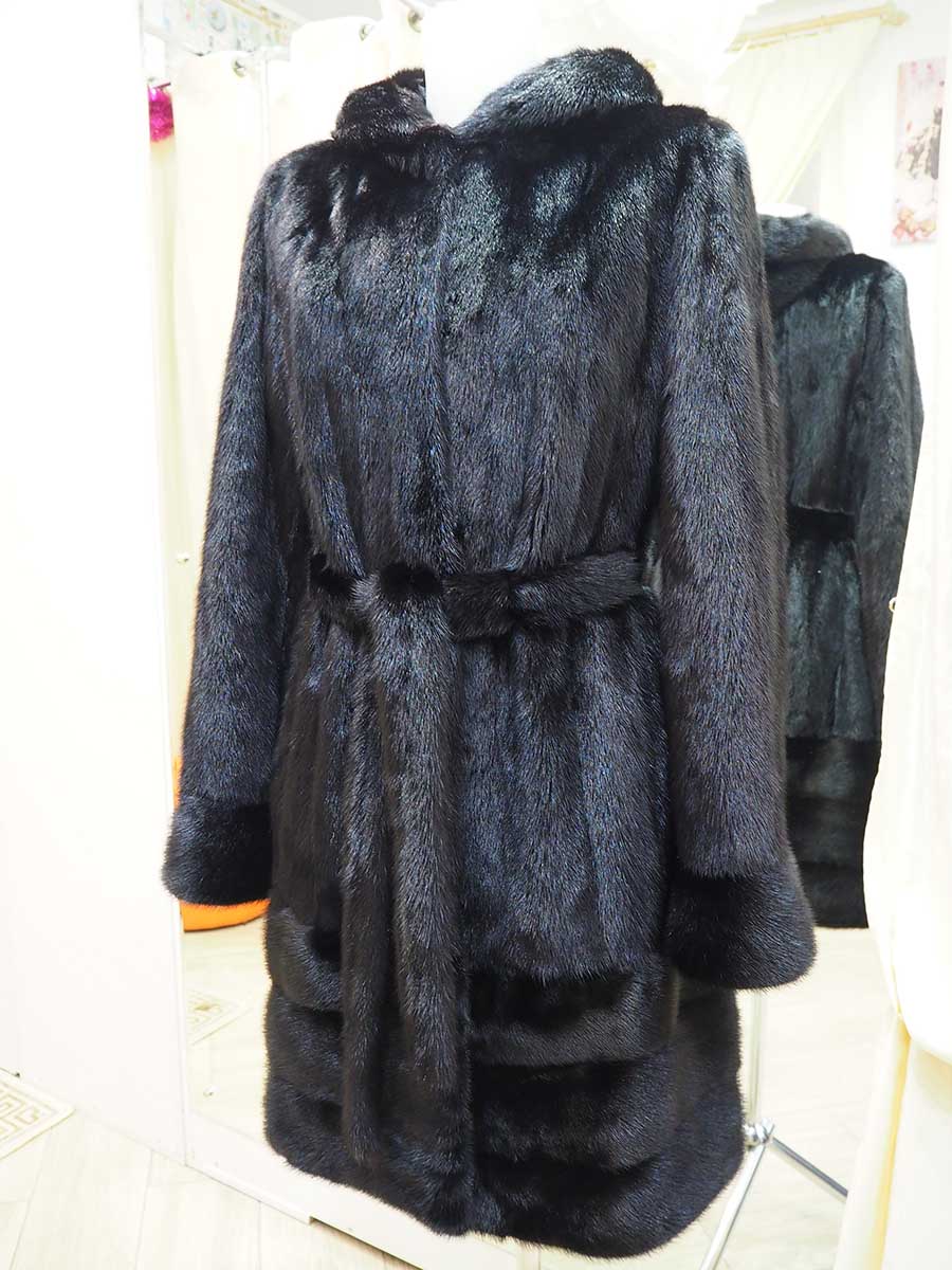 Выслушав желания, мастер предложил сделать перекрой с полным изменением фасона, и дополнительно приобрести недостающий мех норки. Длину увеличили за счет поперечных рядов из новых пластин, рукав удлинили таким же образоом и изменили его крой. Чтобы шубка практично служила в любую погоду, изготовлен глубокий капюшон и внутренние боковые карманы. Длинный меховой пояс гарантирует комфортное прилегание, подчеркивая линию талии.
