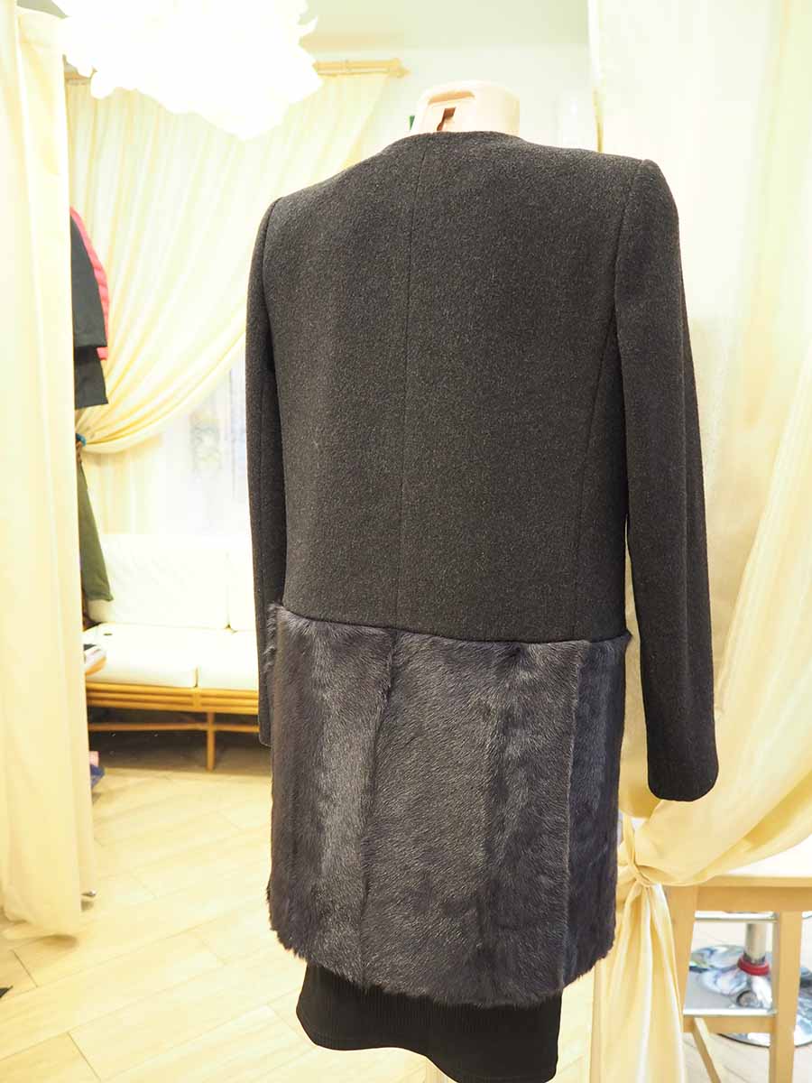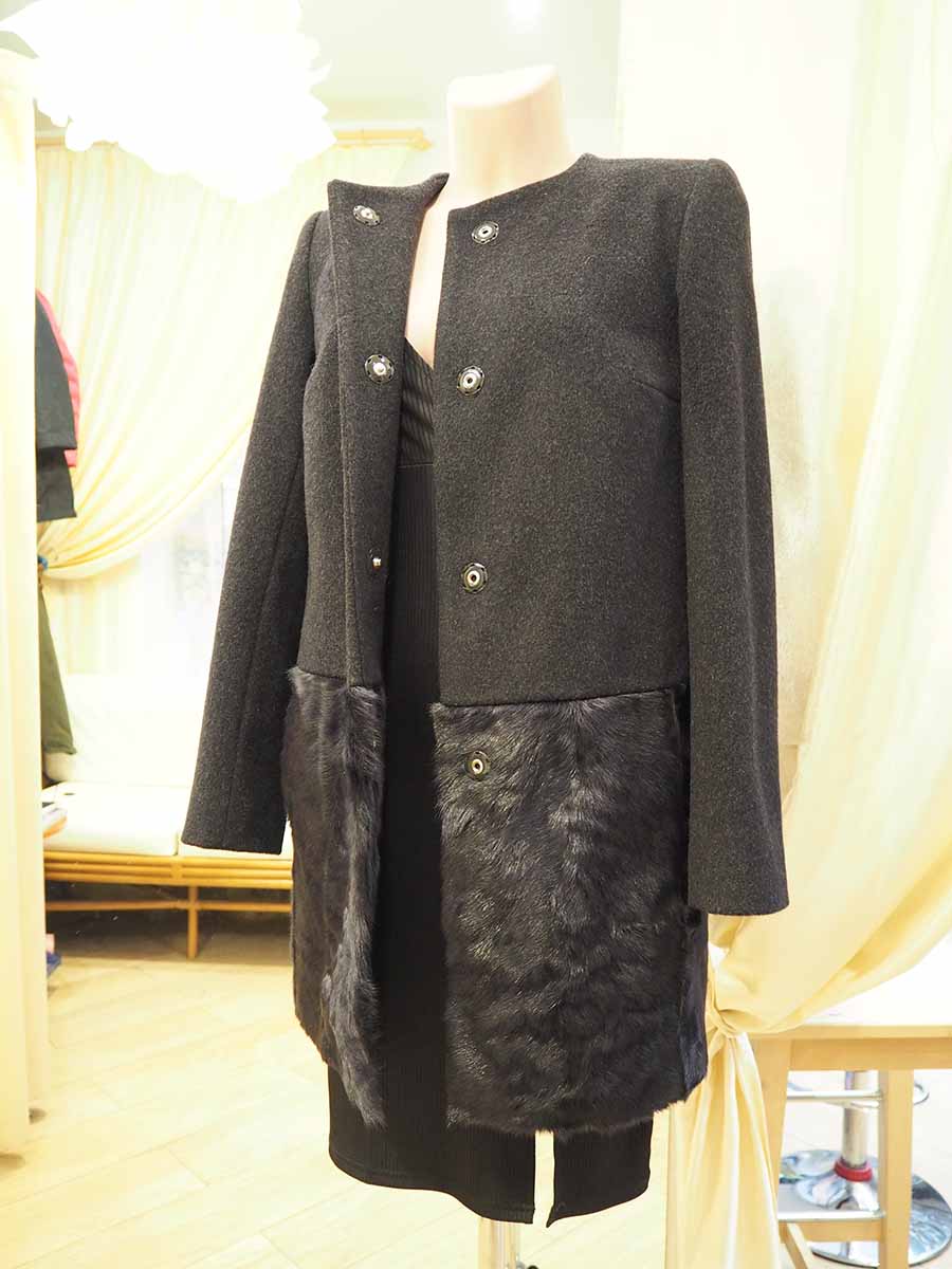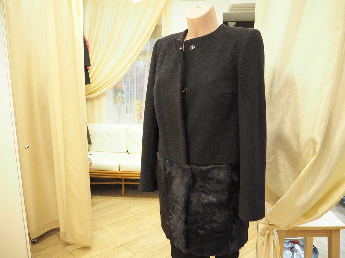 Пальто прямого силуэта без воротника со слегка зауженной талией, изготовлены два прорезных кармана. Рукав втачной, застежка – потайные кнопки. Выполнено из 100%-го шерстяного полотна на шелковой подкладке. По низу изделия отделка из натурального меха козлика.