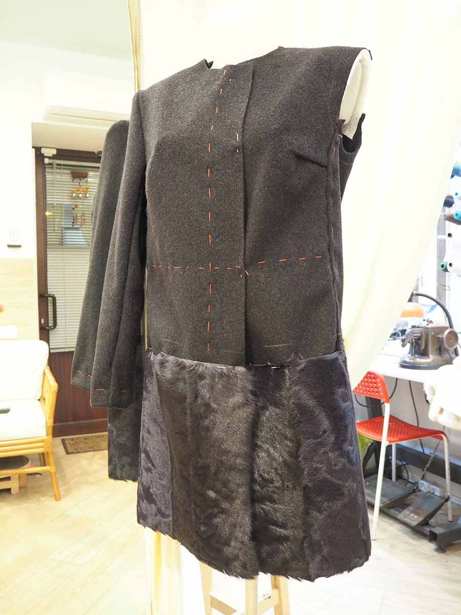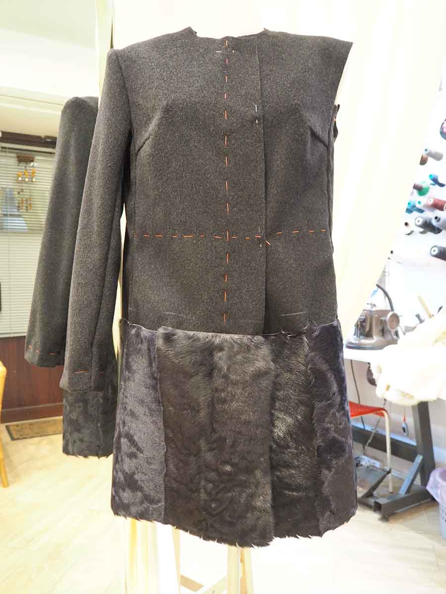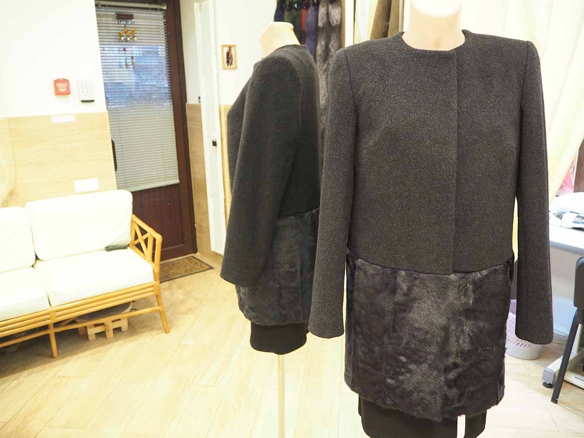 Пальто прямого силуэта без воротника со слегка зауженной талией, изготовлены два прорезных кармана. Рукав втачной, застежка – потайные кнопки. Выполнено из 100%-го шерстяного полотна на шелковой подкладке. По низу изделия отделка из натурального меха козлика.