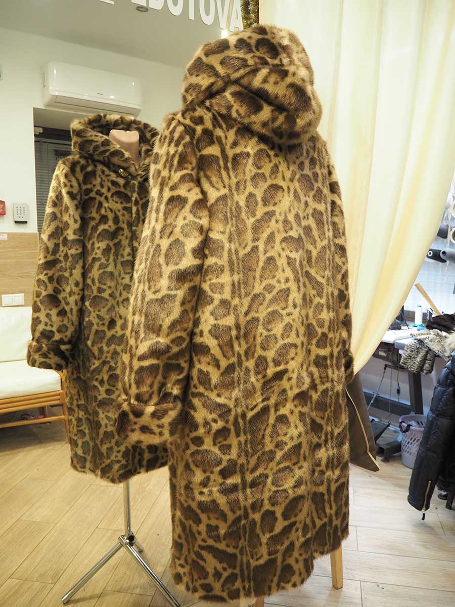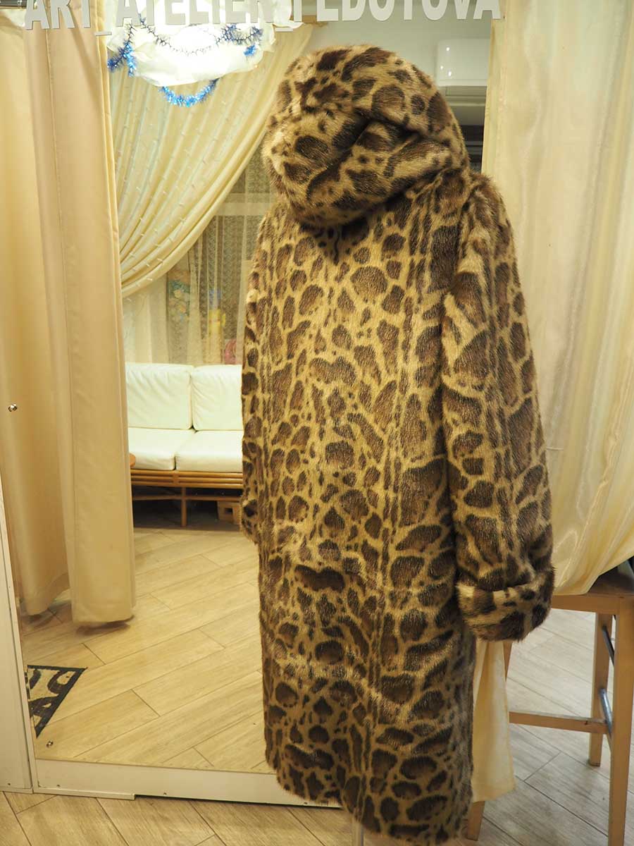 Пальто из искусственного меха трапециевидного силуэта, капюшон с отворотом, карманы, рукав втачной прямого кроя, материал заказчика.