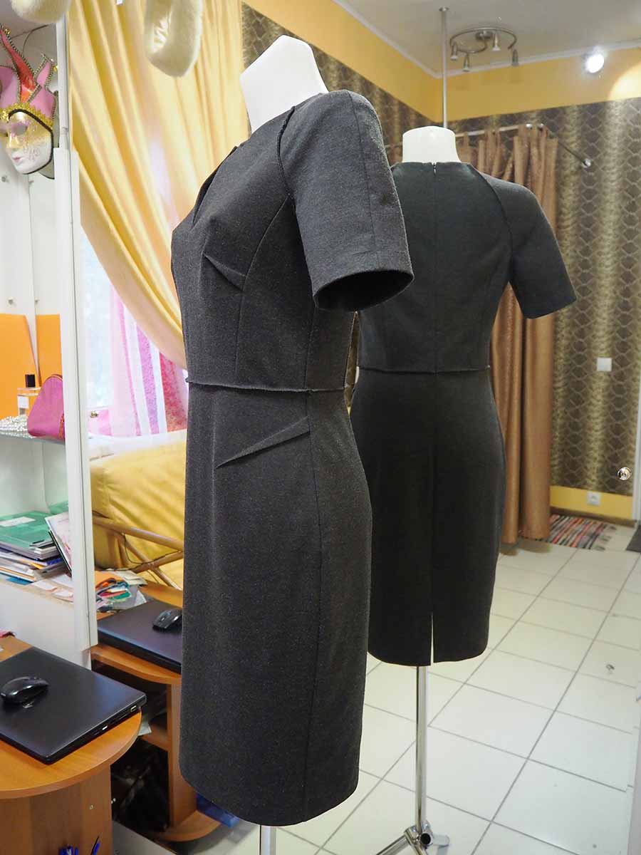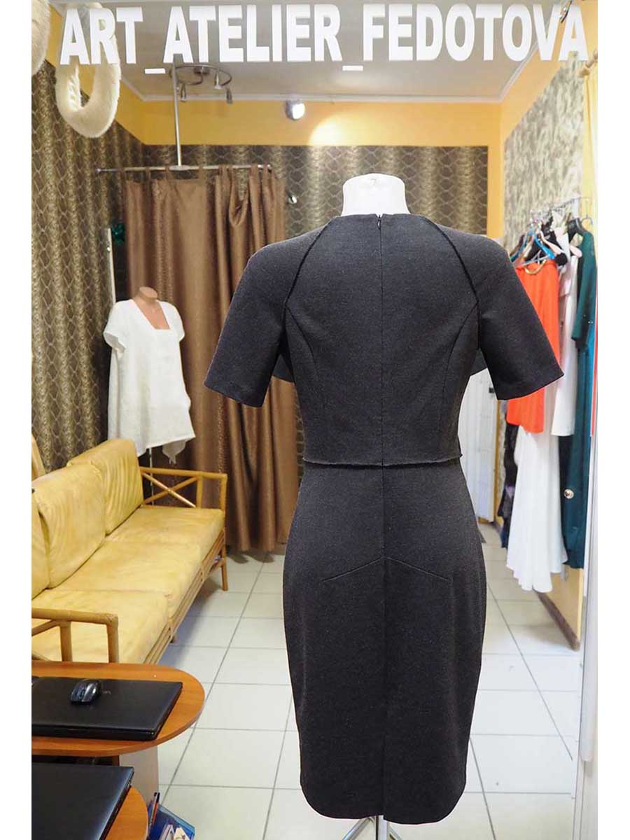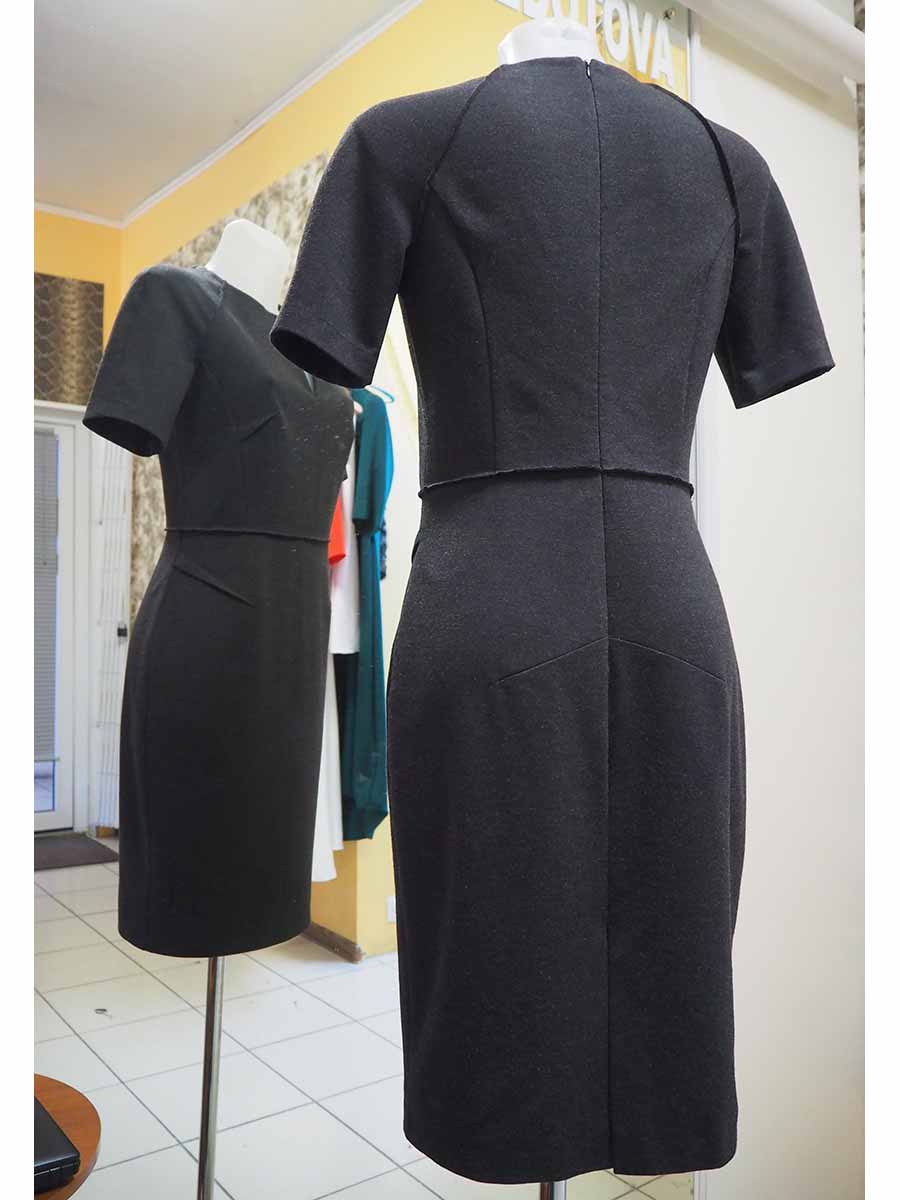 Изделие отрезное по талии. Рукав реглан. Вырез горловины круглый с декоративным крючком, удлиненный капелькой. Швы и вытачки обработаны на лицевую сторону. Застежка по спинке на потайной молнии. Выполнено из качественного итальянского трикотажного полотна