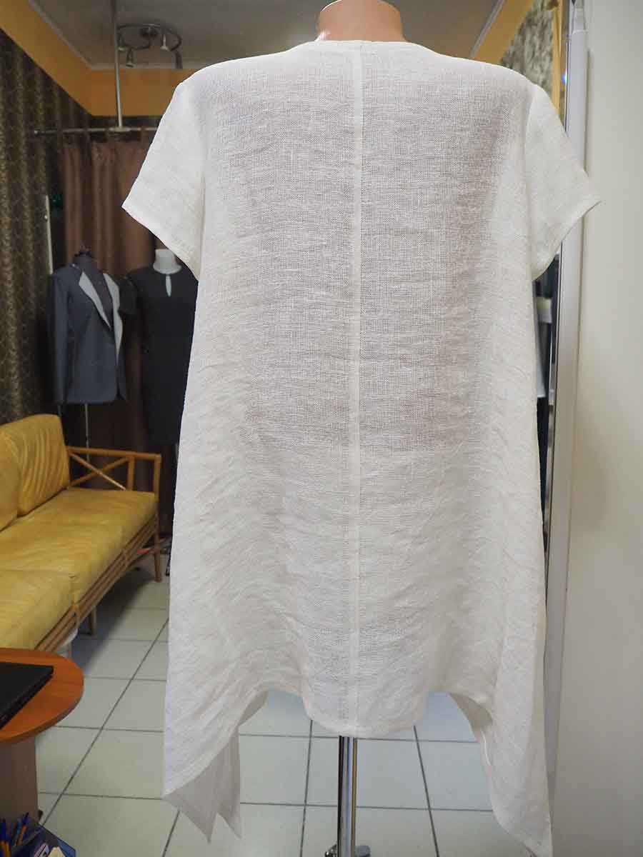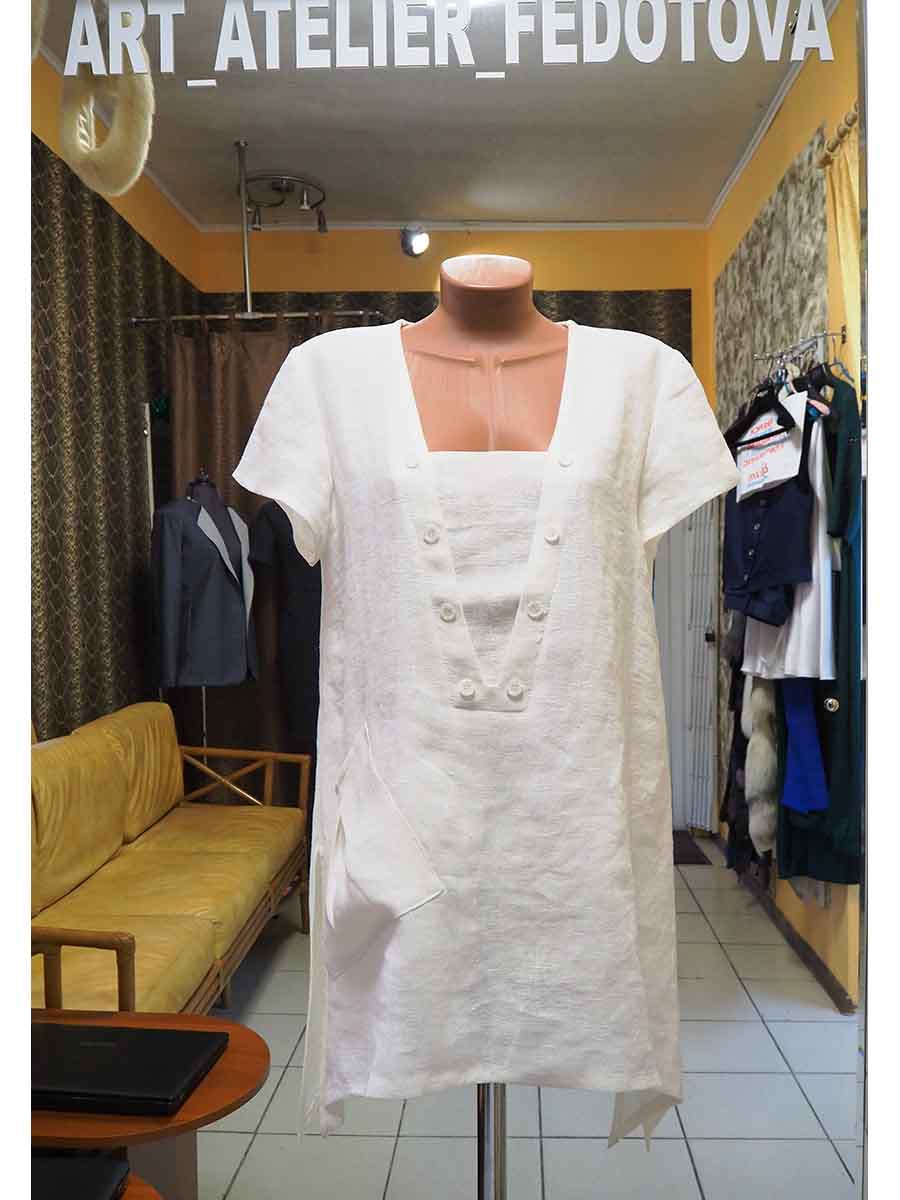 V – образный удлиненный вырез с декоративной вставкой, на которой в качестве отделки нашиты пуговицы. На полочке накладной карман с бантовой складкой. Изделие выполнено из натурального льна