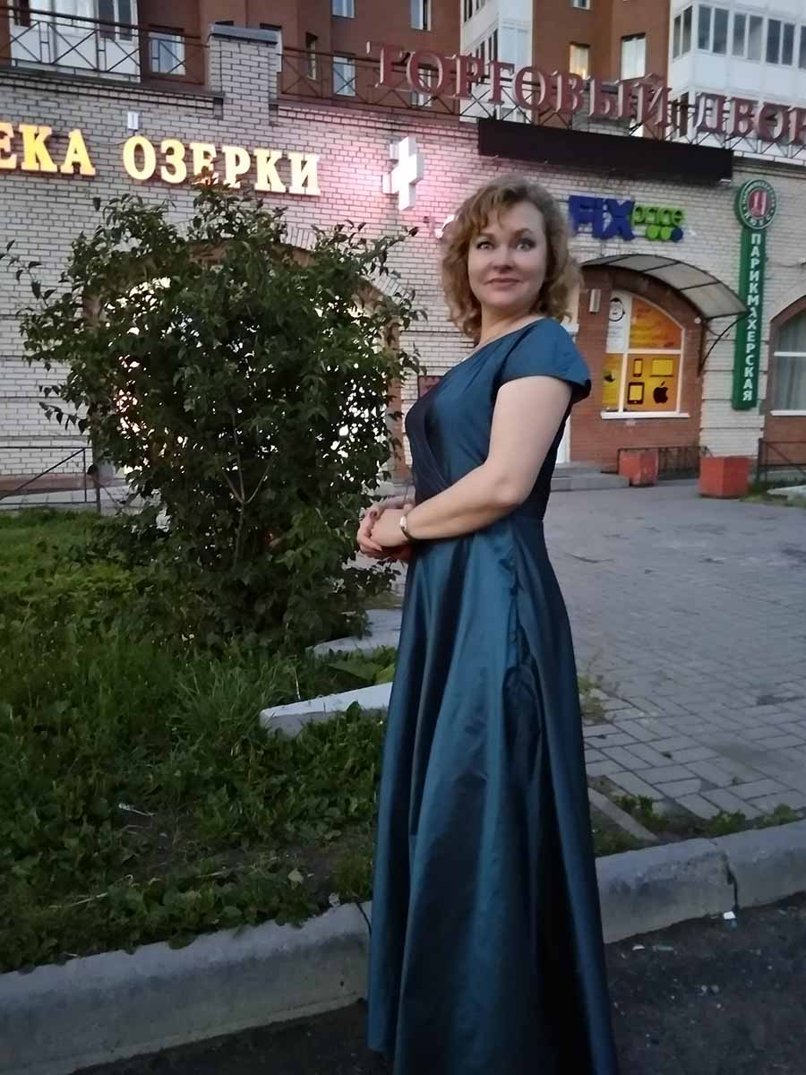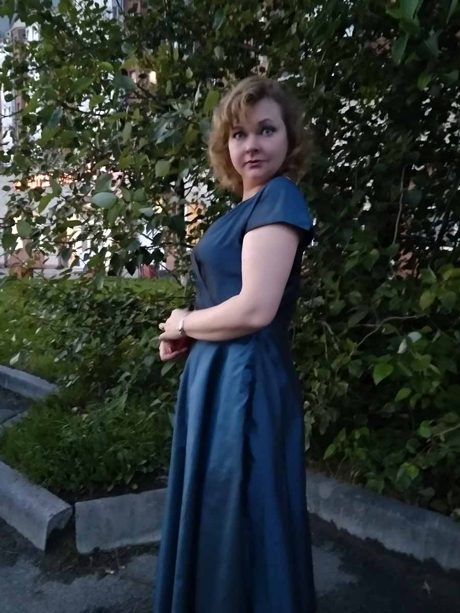 Платье цвета морской волны с отливом, отрезное по талии, имеет юбку полусолнце в пол. Лиф изделия на запахе, декорирован складками. Рукав короткий полуреглан. Юбка имеет в боковых швах карманы, изготовлена на подкладе из шелка, помогающий держать форму фалд